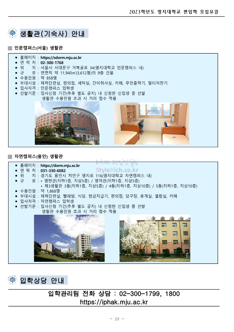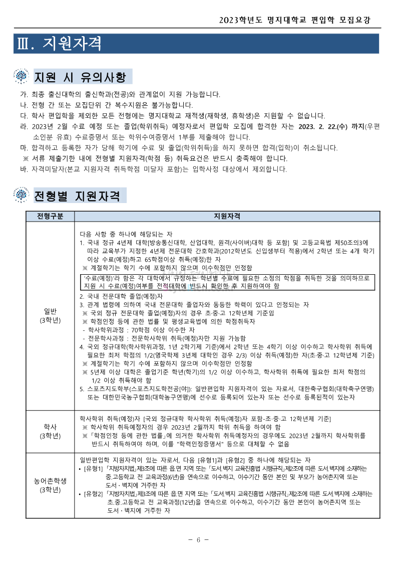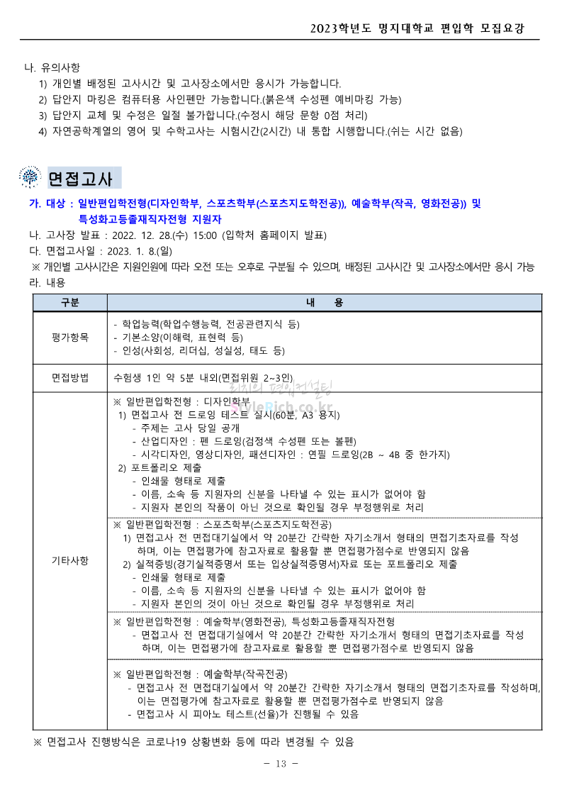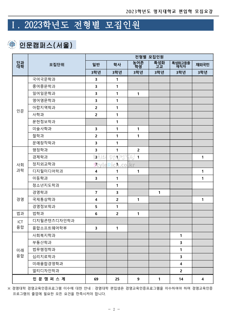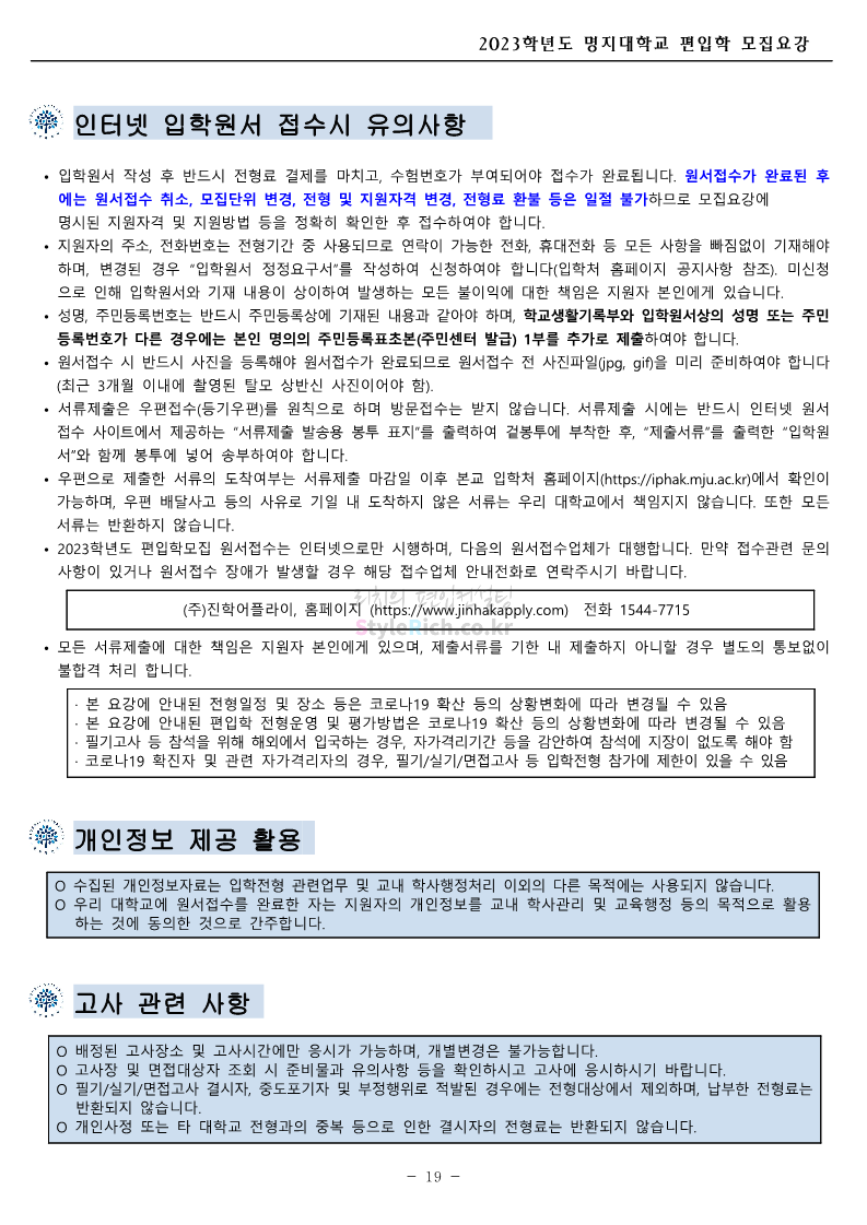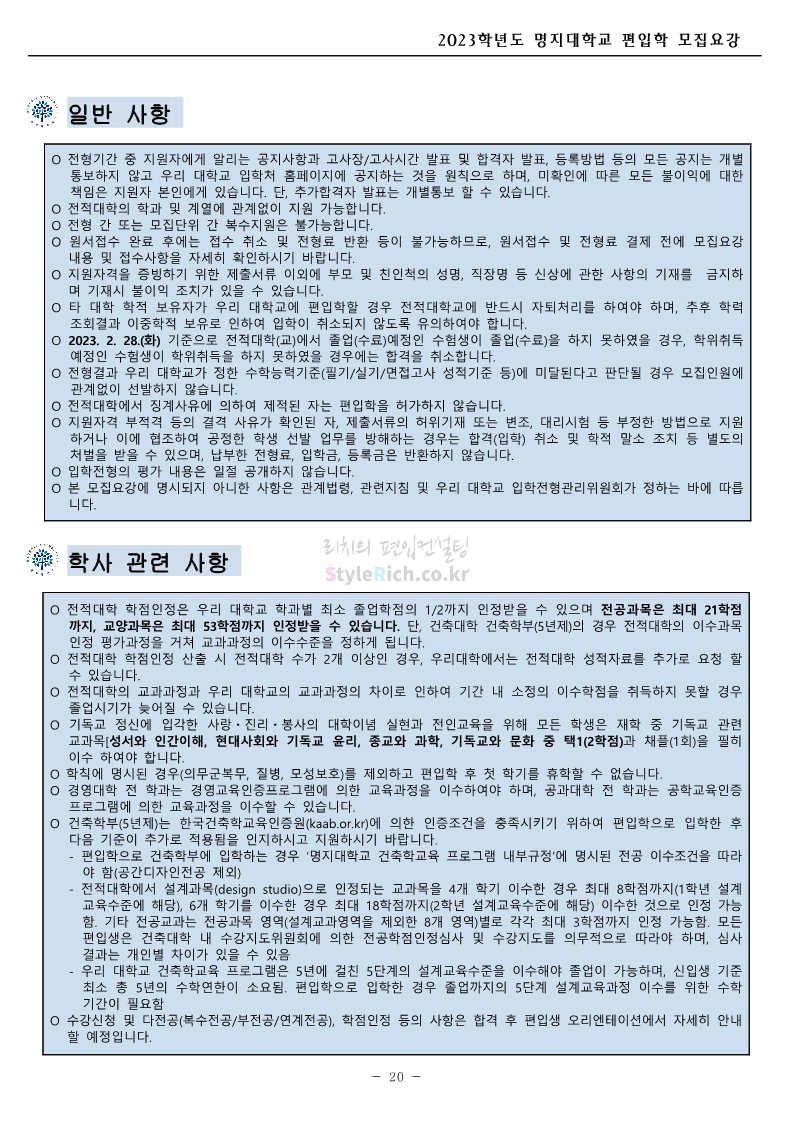 명지대 편입 2023학년도 모집요강 간편하게 보자! 2022.11.30 00:53 편입 모집요강/2023학년도 모집요강 2023학년도 명지대 편입 모집요강(2022.11.29 기준)을 간편하게 확인하세요. * 최종 모집요강 발표 이후에도 내용의 일부가 변경될 수 있으니 지원 전 반드시 명지대 입학처를 확인 바랍니다. 명지대 편입 최신 모집요강 확인하기 <출처: 명지대> 공유하기 게시글 관리 리치의 편입컨설팅 저작자표시 비영리 변경금지 (새창열림) '편입 모집요강 > 2023학년도 모집요강' 카테고리의 다른 글 연세대(미래) 편입 2023학년도 모집요강 간편하게 보자! (0) 2022.11.30 연세대 편입 2023학년도 모집요강 간편하게 보자! (0) 2022.11.30 국민대 편입 2023학년도 모집요강 간편하게 보자! (0) 2022.11.30 건국대 편입 2023학년도 모집요강 간편하게 보자! (0) 2022.11.30 강남대 편입 2023학년도 모집요강 간편하게 보자! (0) 2022.11.29 댓글 공유하기 다른 글 댓글 이 글 공유하기 구독하기 구독하기 카카오톡 카카오톡 라인 라인 트위터 트위터 Facebook Facebook 카카오스토리 카카오스토리 밴드 밴드 네이버 블로그 네이버 블로그 Pocket Pocket Evernote Evernote 다른 글 연세대(미래) 편입 2023학년도 모집요강 간편하게 보자! 연세대(미래) 편입 2023학년도 모집요강 간편하게 보자! 2022.11.30 연세대 편입 2023학년도 모집요강 간편하게 보자! 연세대 편입 2023학년도 모집요강 간편하게 보자! 2022.11.30 국민대 편입 2023학년도 모집요강 간편하게 보자! 국민대 편입 2023학년도 모집요강 간편하게 보자! 2022.11.30 건국대 편입 2023학년도 모집요강 간편하게 보자! 건국대 편입 2023학년도 모집요강 간편하게 보자! 2022.11.30 다른 글 더 둘러보기