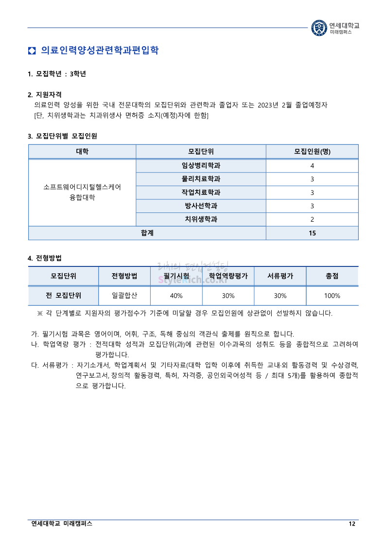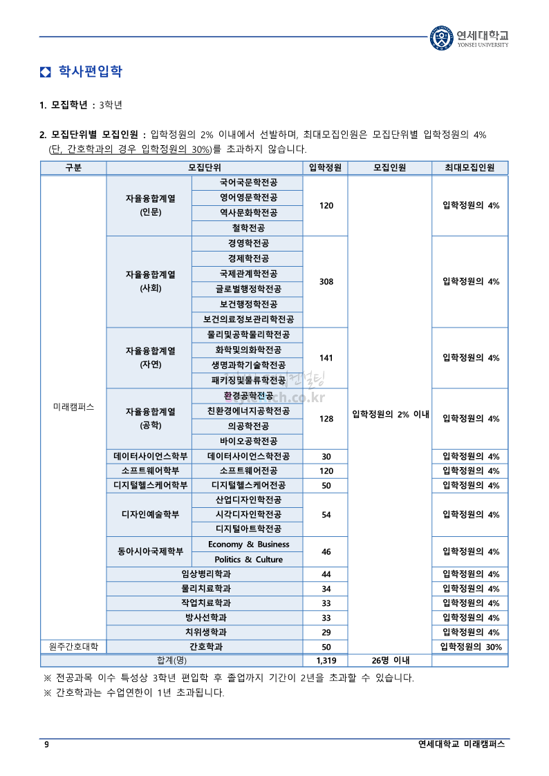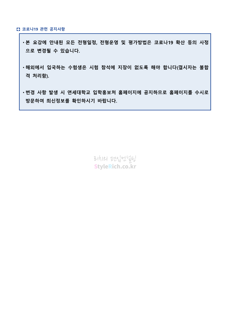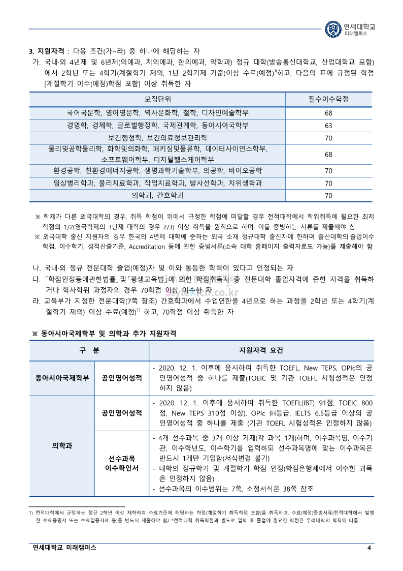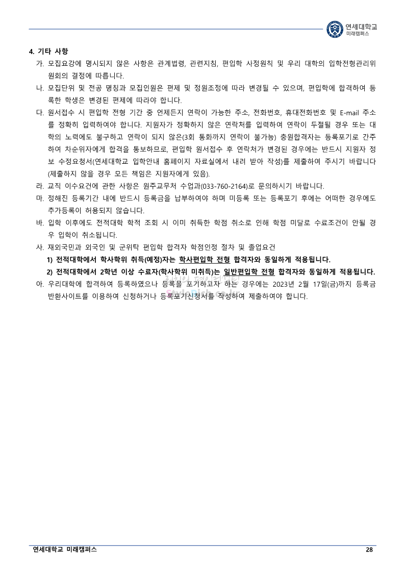 연세대(미래) 편입 2023학년도 모집요강 간편하게 보자! 2022.11.30 02:32 편입 모집요강/2023학년도 모집요강 2023학년도 연세대(미래) 편입 모집요강(2022.11.29 기준)을 간편하게 확인하세요. * 최종 모집요강 발표 이후에도 내용의 일부가 변경될 수 있으니 지원 전 반드시 연세대(미래) 입학처를 확인 바랍니다. 연세대(미래) 편입 최신 모집요강 확인하기 <출처: 연세대(미래)> 공유하기 게시글 관리 리치의 편입컨설팅 저작자표시 비영리 변경금지 (새창열림) '편입 모집요강 > 2023학년도 모집요강' 카테고리의 다른 글 서울대 편입 2023학년도 모집요강 간편하게 보자! (0) 2022.11.30 계명대 편입 2023학년도 모집요강 간편하게 보자! (0) 2022.11.30 연세대 편입 2023학년도 모집요강 간편하게 보자! (0) 2022.11.30 명지대 편입 2023학년도 모집요강 간편하게 보자! (0) 2022.11.30 국민대 편입 2023학년도 모집요강 간편하게 보자! (0) 2022.11.30 댓글 공유하기 다른 글 댓글 이 글 공유하기 구독하기 구독하기 카카오톡 카카오톡 라인 라인 트위터 트위터 Facebook Facebook 카카오스토리 카카오스토리 밴드 밴드 네이버 블로그 네이버 블로그 Pocket Pocket Evernote Evernote 다른 글 서울대 편입 2023학년도 모집요강 간편하게 보자! 서울대 편입 2023학년도 모집요강 간편하게 보자! 2022.11.30 계명대 편입 2023학년도 모집요강 간편하게 보자! 계명대 편입 2023학년도 모집요강 간편하게 보자! 2022.11.30 연세대 편입 2023학년도 모집요강 간편하게 보자! 연세대 편입 2023학년도 모집요강 간편하게 보자! 2022.11.30 명지대 편입 2023학년도 모집요강 간편하게 보자! 명지대 편입 2023학년도 모집요강 간편하게 보자! 2022.11.30 다른 글 더 둘러보기