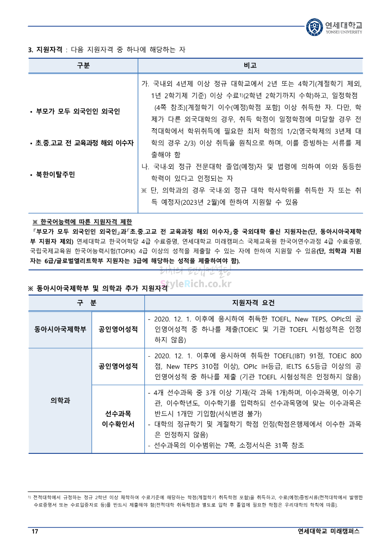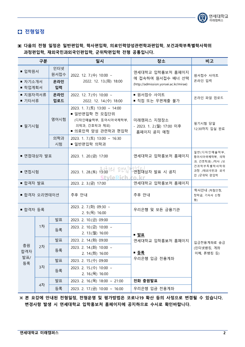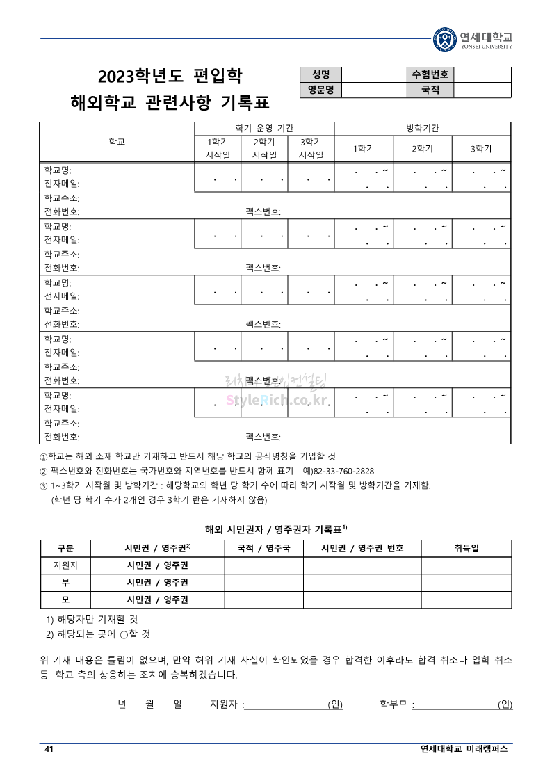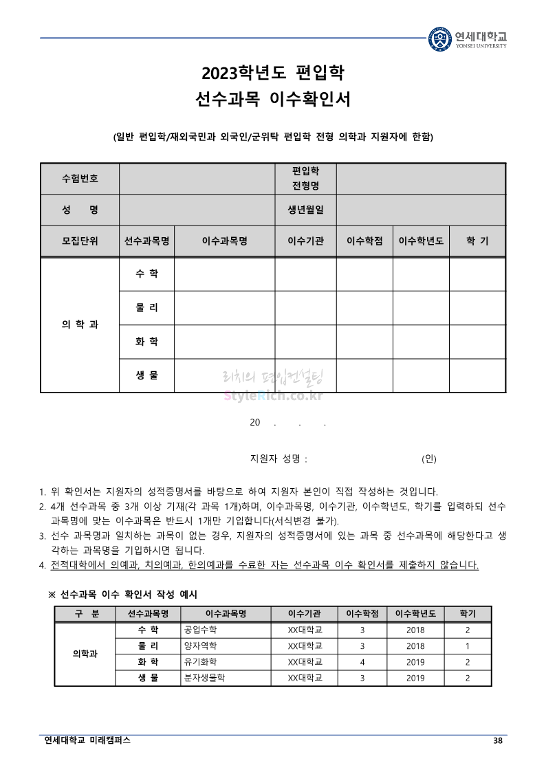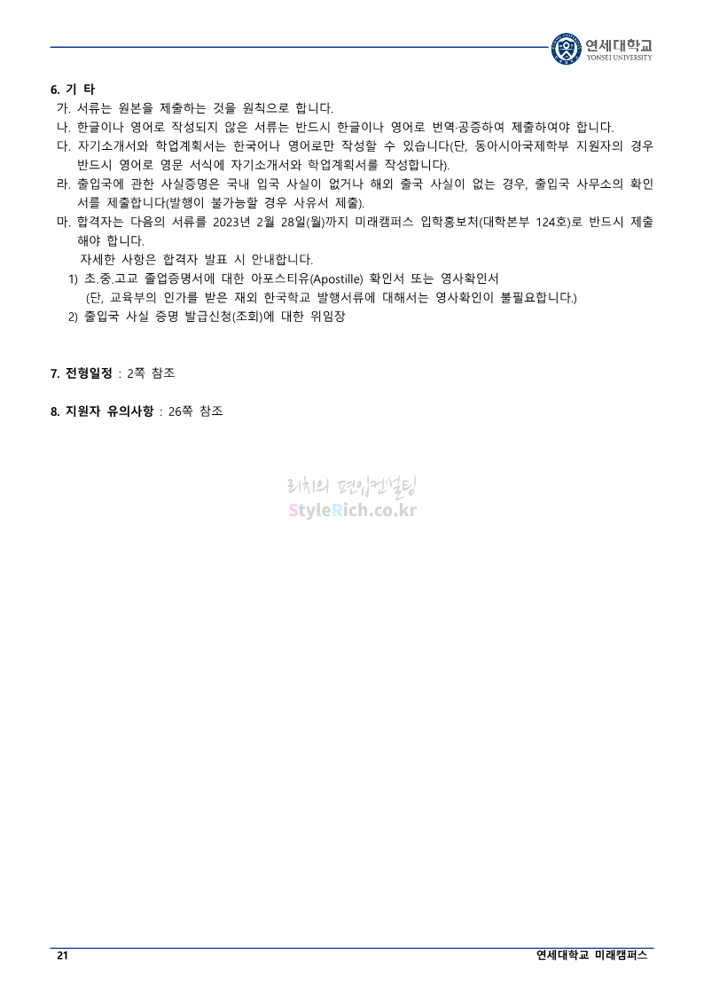 연세대(미래) 편입 2023학년도 모집요강 간편하게 보자! 2022.11.30 02:32 편입 모집요강/2023학년도 모집요강 2023학년도 연세대(미래) 편입 모집요강(2022.11.29 기준)을 간편하게 확인하세요. * 최종 모집요강 발표 이후에도 내용의 일부가 변경될 수 있으니 지원 전 반드시 연세대(미래) 입학처를 확인 바랍니다. 연세대(미래) 편입 최신 모집요강 확인하기 <출처: 연세대(미래)> 공유하기 게시글 관리 리치의 편입컨설팅 저작자표시 비영리 변경금지 (새창열림) '편입 모집요강 > 2023학년도 모집요강' 카테고리의 다른 글 서울대 편입 2023학년도 모집요강 간편하게 보자! (0) 2022.11.30 계명대 편입 2023학년도 모집요강 간편하게 보자! (0) 2022.11.30 연세대 편입 2023학년도 모집요강 간편하게 보자! (0) 2022.11.30 명지대 편입 2023학년도 모집요강 간편하게 보자! (0) 2022.11.30 국민대 편입 2023학년도 모집요강 간편하게 보자! (0) 2022.11.30 댓글 공유하기 다른 글 댓글 이 글 공유하기 구독하기 구독하기 카카오톡 카카오톡 라인 라인 트위터 트위터 Facebook Facebook 카카오스토리 카카오스토리 밴드 밴드 네이버 블로그 네이버 블로그 Pocket Pocket Evernote Evernote 다른 글 서울대 편입 2023학년도 모집요강 간편하게 보자! 서울대 편입 2023학년도 모집요강 간편하게 보자! 2022.11.30 계명대 편입 2023학년도 모집요강 간편하게 보자! 계명대 편입 2023학년도 모집요강 간편하게 보자! 2022.11.30 연세대 편입 2023학년도 모집요강 간편하게 보자! 연세대 편입 2023학년도 모집요강 간편하게 보자! 2022.11.30 명지대 편입 2023학년도 모집요강 간편하게 보자! 명지대 편입 2023학년도 모집요강 간편하게 보자! 2022.11.30 다른 글 더 둘러보기