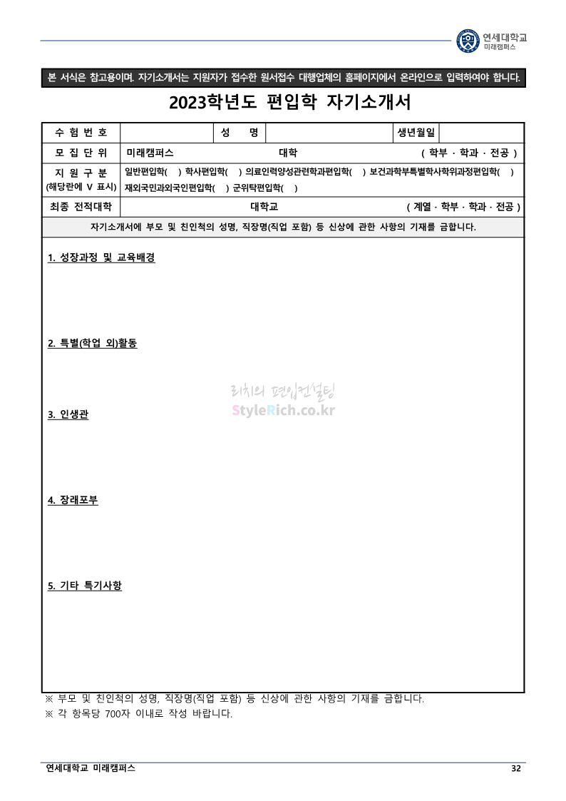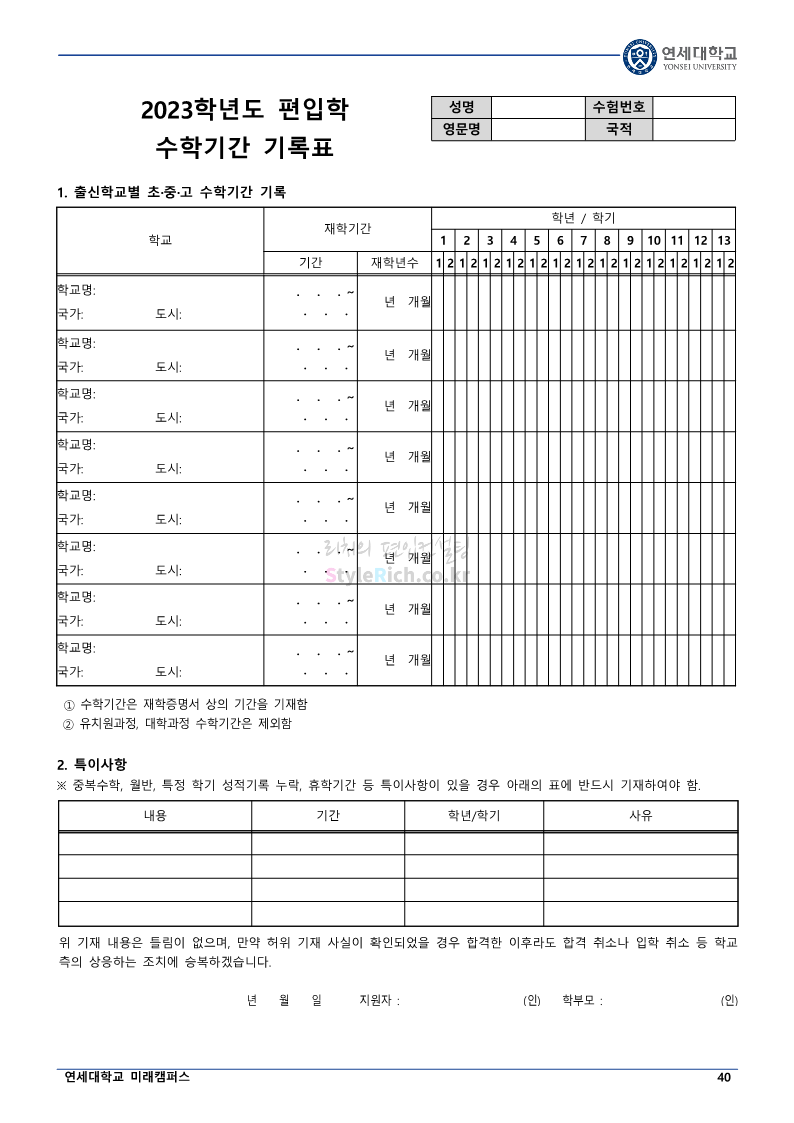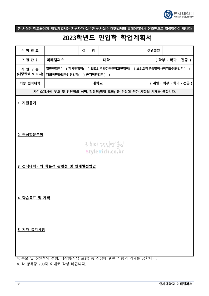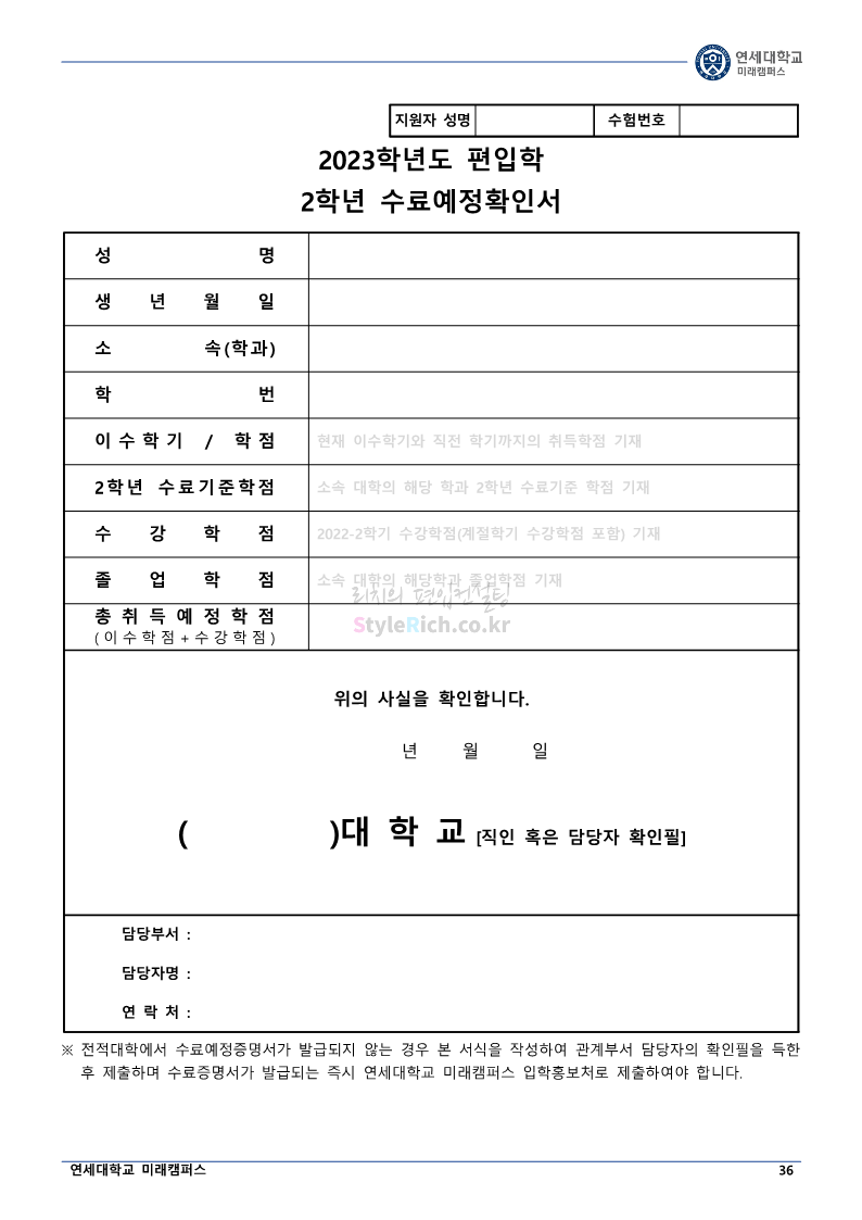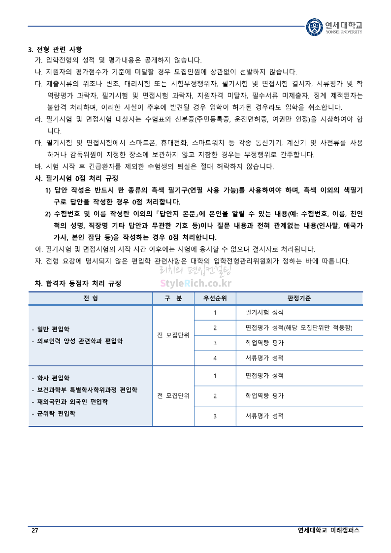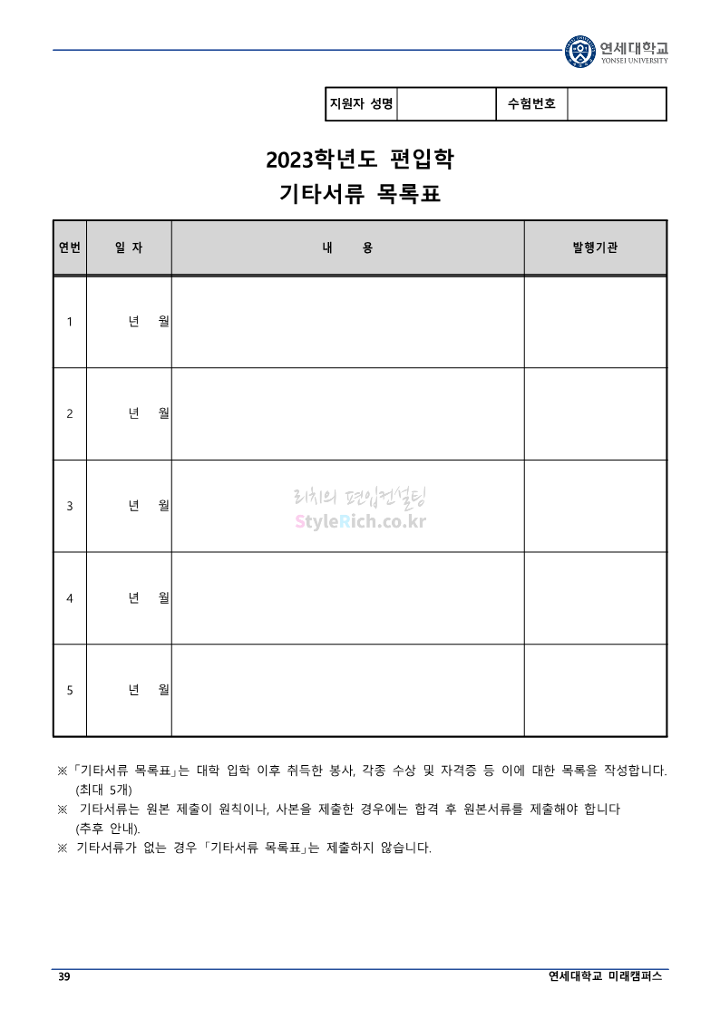 연세대(미래) 편입 2023학년도 모집요강 간편하게 보자! 2022.11.30 02:32 편입 모집요강/2023학년도 모집요강 2023학년도 연세대(미래) 편입 모집요강(2022.11.29 기준)을 간편하게 확인하세요. * 최종 모집요강 발표 이후에도 내용의 일부가 변경될 수 있으니 지원 전 반드시 연세대(미래) 입학처를 확인 바랍니다. 연세대(미래) 편입 최신 모집요강 확인하기 <출처: 연세대(미래)> 공유하기 게시글 관리 리치의 편입컨설팅 저작자표시 비영리 변경금지 (새창열림) '편입 모집요강 > 2023학년도 모집요강' 카테고리의 다른 글 서울대 편입 2023학년도 모집요강 간편하게 보자! (0) 2022.11.30 계명대 편입 2023학년도 모집요강 간편하게 보자! (0) 2022.11.30 연세대 편입 2023학년도 모집요강 간편하게 보자! (0) 2022.11.30 명지대 편입 2023학년도 모집요강 간편하게 보자! (0) 2022.11.30 국민대 편입 2023학년도 모집요강 간편하게 보자! (0) 2022.11.30 댓글 공유하기 다른 글 댓글 이 글 공유하기 구독하기 구독하기 카카오톡 카카오톡 라인 라인 트위터 트위터 Facebook Facebook 카카오스토리 카카오스토리 밴드 밴드 네이버 블로그 네이버 블로그 Pocket Pocket Evernote Evernote 다른 글 서울대 편입 2023학년도 모집요강 간편하게 보자! 서울대 편입 2023학년도 모집요강 간편하게 보자! 2022.11.30 계명대 편입 2023학년도 모집요강 간편하게 보자! 계명대 편입 2023학년도 모집요강 간편하게 보자! 2022.11.30 연세대 편입 2023학년도 모집요강 간편하게 보자! 연세대 편입 2023학년도 모집요강 간편하게 보자! 2022.11.30 명지대 편입 2023학년도 모집요강 간편하게 보자! 명지대 편입 2023학년도 모집요강 간편하게 보자! 2022.11.30 다른 글 더 둘러보기
