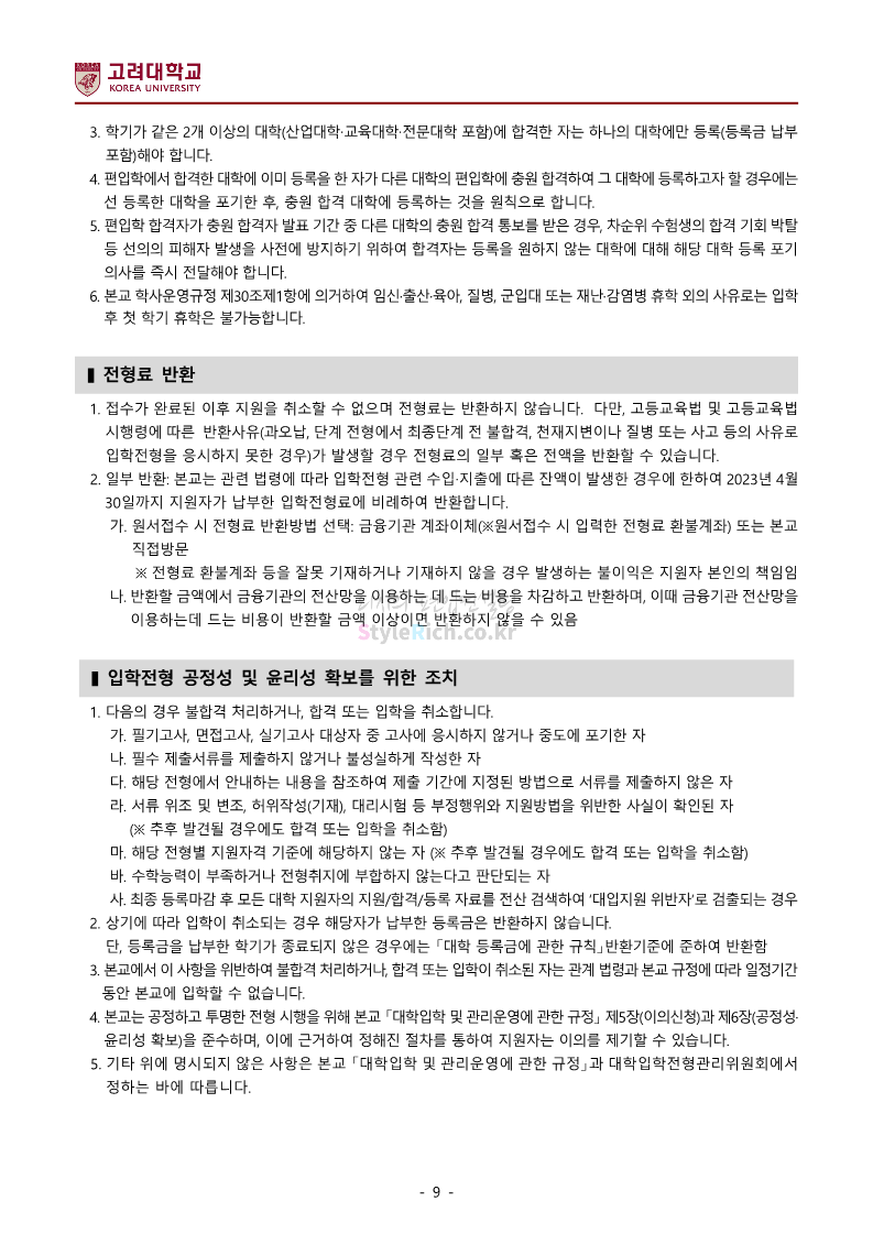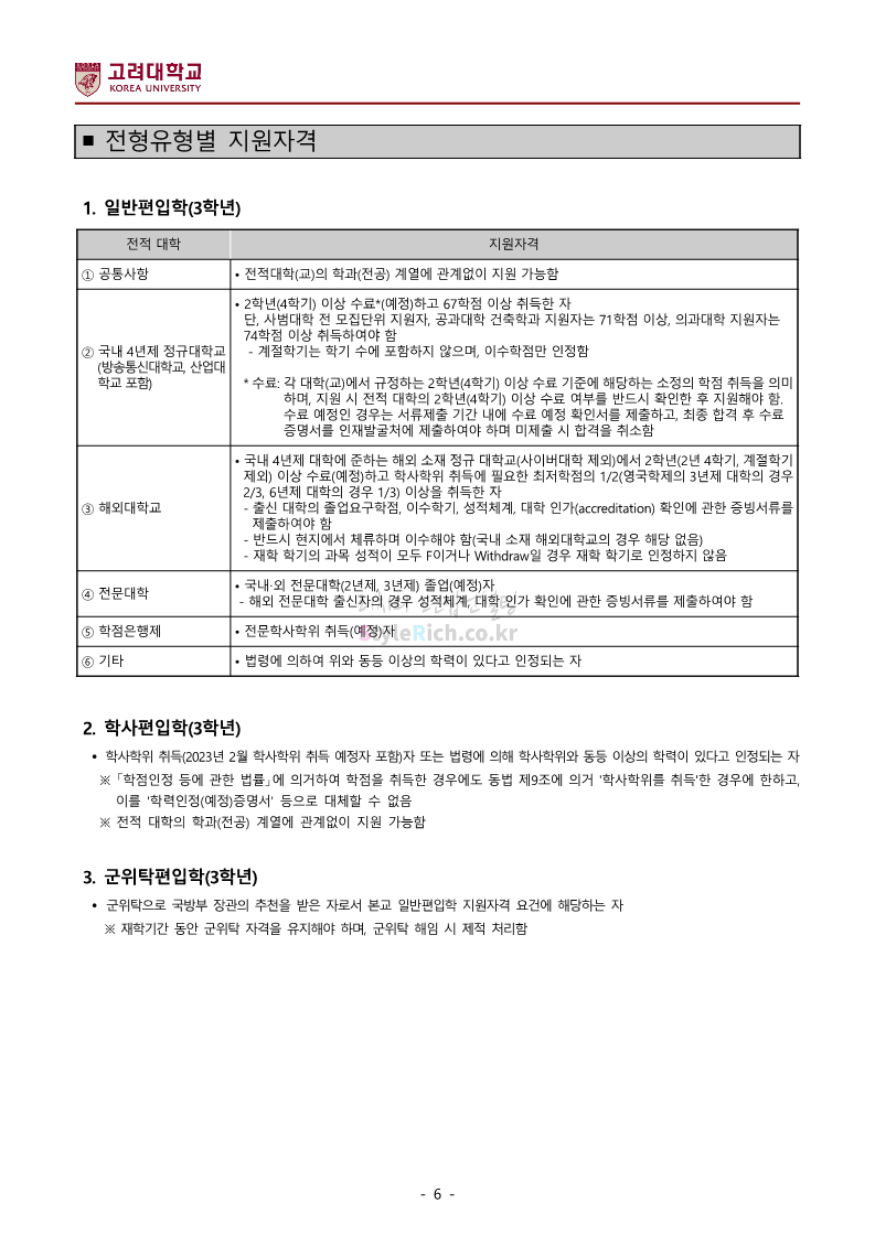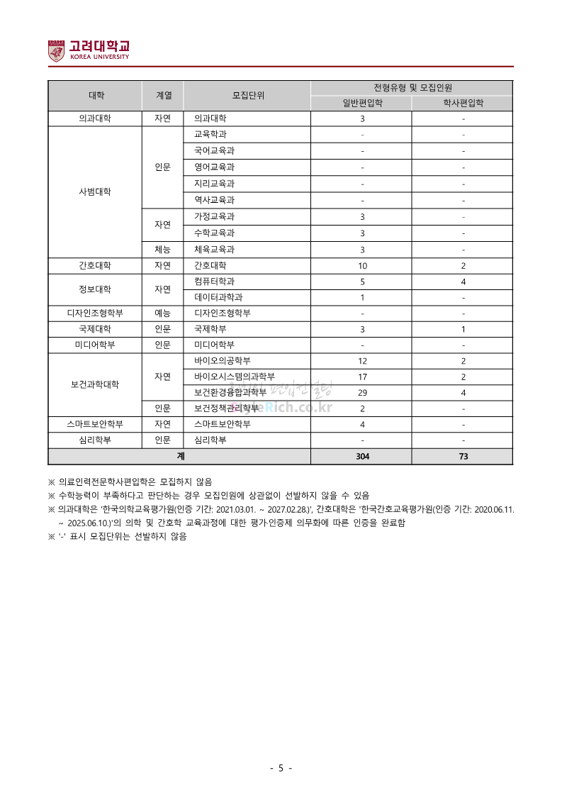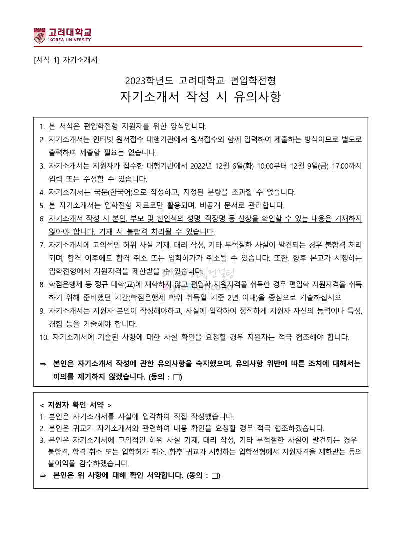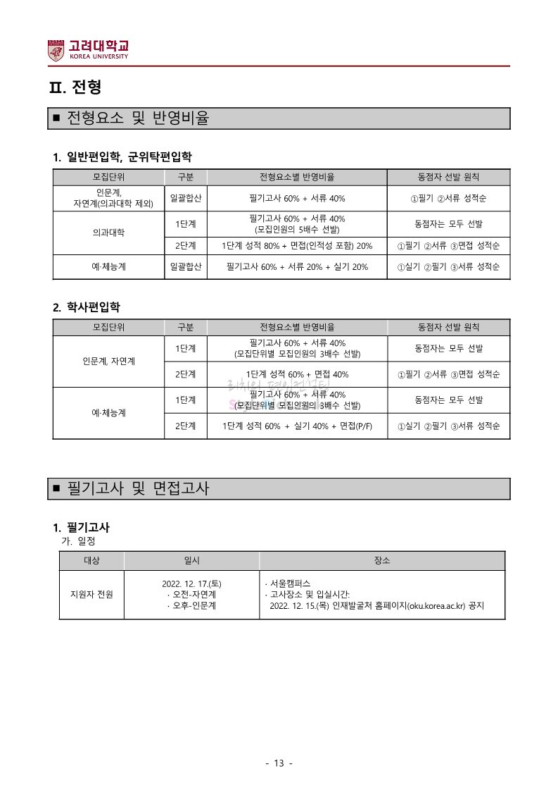 고려대 편입 2023학년도 모집요강 간편하게 보자! 2022.12.01 00:30 편입 모집요강/2023학년도 모집요강 2023학년도 고려대 편입 모집요강(2022.11.30 기준)을 간편하게 확인하세요. * 최종 모집요강 발표 이후에도 내용의 일부가 변경될 수 있으니 지원 전 반드시 고려대 입학처를 확인 바랍니다. 고려대 편입 최신 모집요강 확인하기 <출처: 고려대> 공유하기 게시글 관리 리치의 편입컨설팅 저작자표시 비영리 변경금지 (새창열림) '편입 모집요강 > 2023학년도 모집요강' 카테고리의 다른 글 안양대 편입 2023학년도 모집요강 간편하게 보자! (0) 2022.12.01 한국공학대 편입 2023학년도 모집요강 간편하게 보자! (0) 2022.12.01 경희대 편입 2023학년도 모집요강 간편하게 보자! (0) 2022.11.30 서울대 편입 2023학년도 모집요강 간편하게 보자! (0) 2022.11.30 계명대 편입 2023학년도 모집요강 간편하게 보자! (0) 2022.11.30 댓글 공유하기 다른 글 댓글 이 글 공유하기 구독하기 구독하기 카카오톡 카카오톡 라인 라인 트위터 트위터 Facebook Facebook 카카오스토리 카카오스토리 밴드 밴드 네이버 블로그 네이버 블로그 Pocket Pocket Evernote Evernote 다른 글 안양대 편입 2023학년도 모집요강 간편하게 보자! 안양대 편입 2023학년도 모집요강 간편하게 보자! 2022.12.01 한국공학대 편입 2023학년도 모집요강 간편하게 보자! 한국공학대 편입 2023학년도 모집요강 간편하게 보자! 2022.12.01 경희대 편입 2023학년도 모집요강 간편하게 보자! 경희대 편입 2023학년도 모집요강 간편하게 보자! 2022.11.30 서울대 편입 2023학년도 모집요강 간편하게 보자! 서울대 편입 2023학년도 모집요강 간편하게 보자! 2022.11.30 다른 글 더 둘러보기