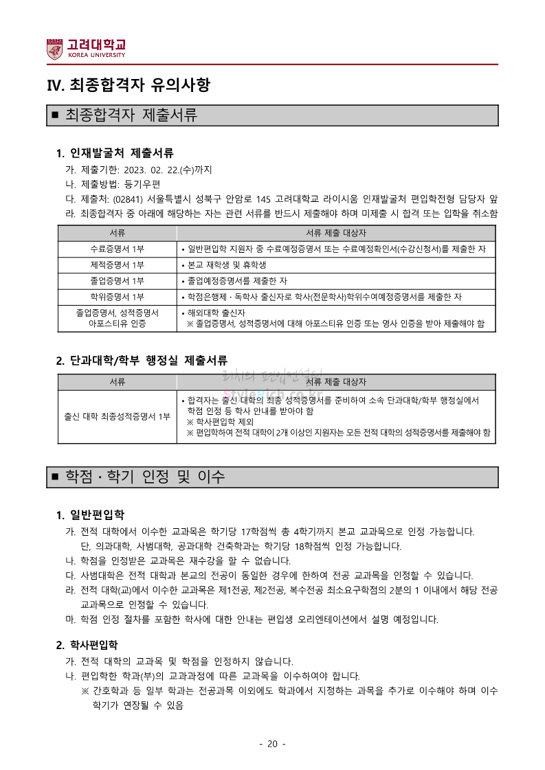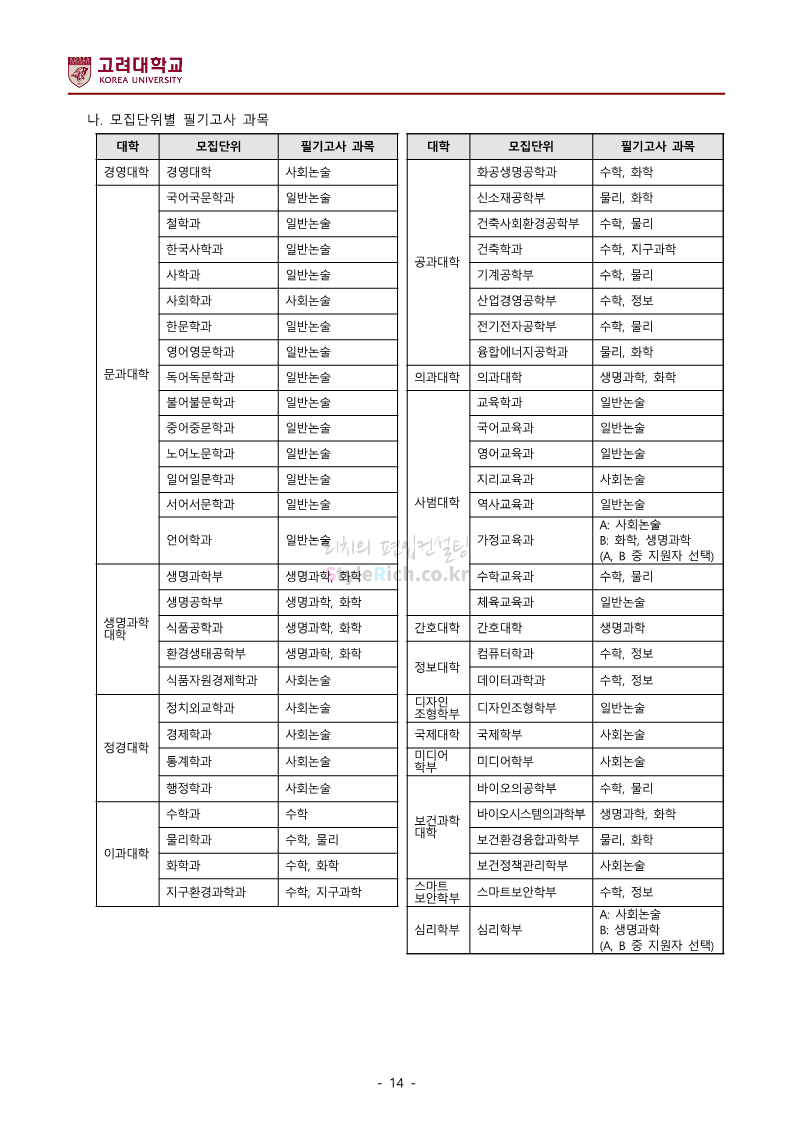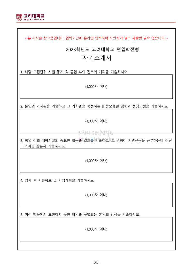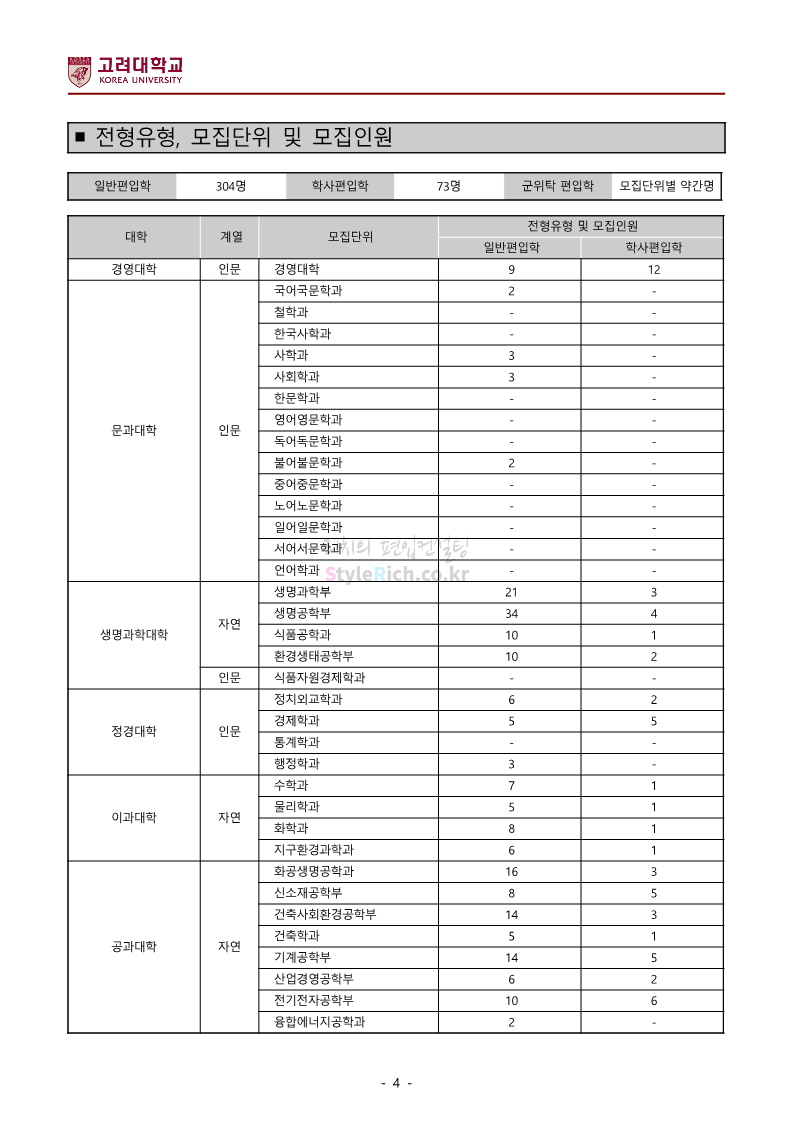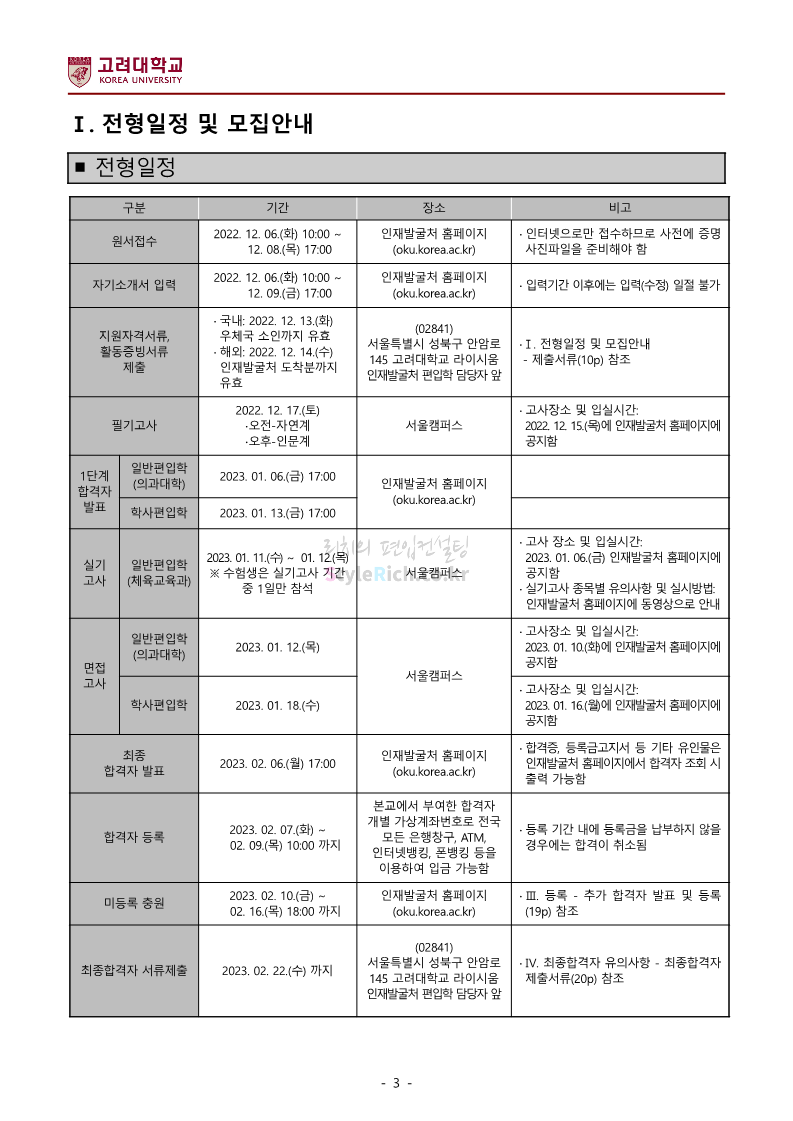 고려대 편입 2023학년도 모집요강 간편하게 보자! 2022.12.01 00:30 편입 모집요강/2023학년도 모집요강 2023학년도 고려대 편입 모집요강(2022.11.30 기준)을 간편하게 확인하세요. * 최종 모집요강 발표 이후에도 내용의 일부가 변경될 수 있으니 지원 전 반드시 고려대 입학처를 확인 바랍니다. 고려대 편입 최신 모집요강 확인하기 <출처: 고려대> 공유하기 게시글 관리 리치의 편입컨설팅 저작자표시 비영리 변경금지 (새창열림) '편입 모집요강 > 2023학년도 모집요강' 카테고리의 다른 글 안양대 편입 2023학년도 모집요강 간편하게 보자! (0) 2022.12.01 한국공학대 편입 2023학년도 모집요강 간편하게 보자! (0) 2022.12.01 경희대 편입 2023학년도 모집요강 간편하게 보자! (0) 2022.11.30 서울대 편입 2023학년도 모집요강 간편하게 보자! (0) 2022.11.30 계명대 편입 2023학년도 모집요강 간편하게 보자! (0) 2022.11.30 댓글 공유하기 다른 글 댓글 이 글 공유하기 구독하기 구독하기 카카오톡 카카오톡 라인 라인 트위터 트위터 Facebook Facebook 카카오스토리 카카오스토리 밴드 밴드 네이버 블로그 네이버 블로그 Pocket Pocket Evernote Evernote 다른 글 안양대 편입 2023학년도 모집요강 간편하게 보자! 안양대 편입 2023학년도 모집요강 간편하게 보자! 2022.12.01 한국공학대 편입 2023학년도 모집요강 간편하게 보자! 한국공학대 편입 2023학년도 모집요강 간편하게 보자! 2022.12.01 경희대 편입 2023학년도 모집요강 간편하게 보자! 경희대 편입 2023학년도 모집요강 간편하게 보자! 2022.11.30 서울대 편입 2023학년도 모집요강 간편하게 보자! 서울대 편입 2023학년도 모집요강 간편하게 보자! 2022.11.30 다른 글 더 둘러보기