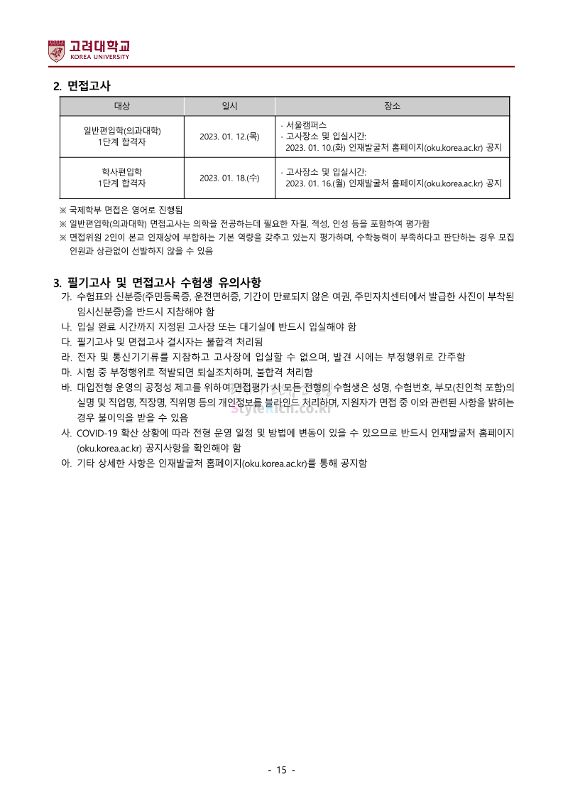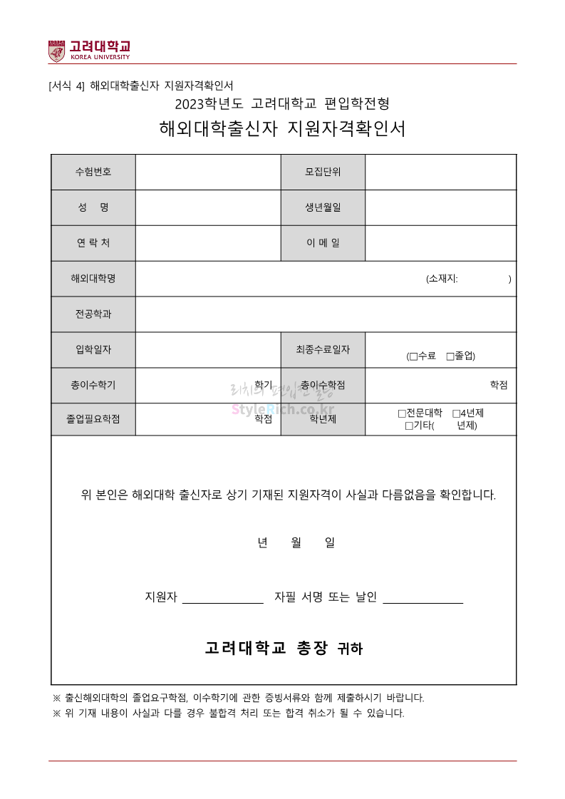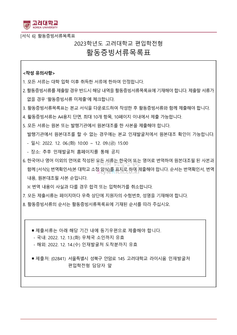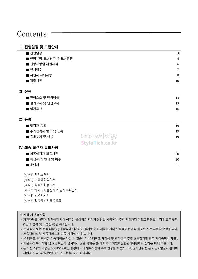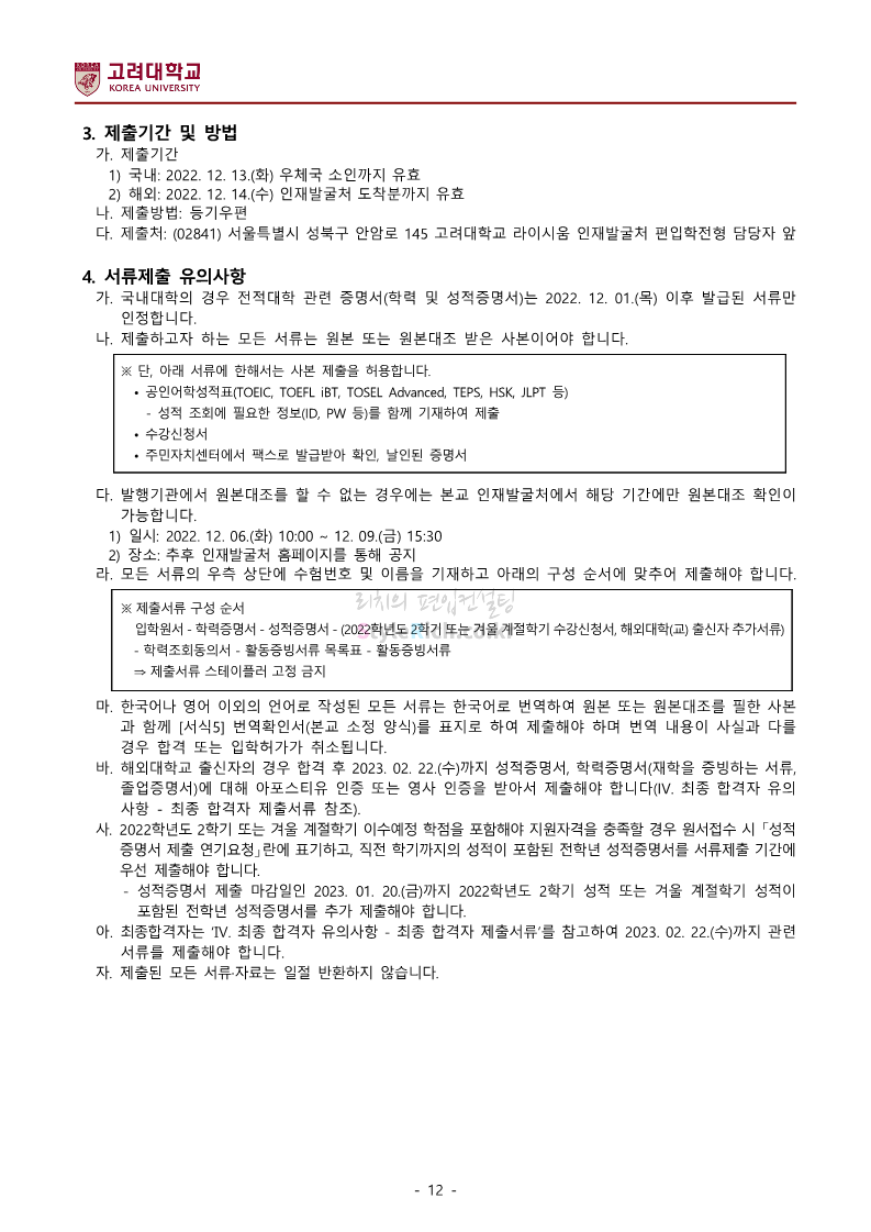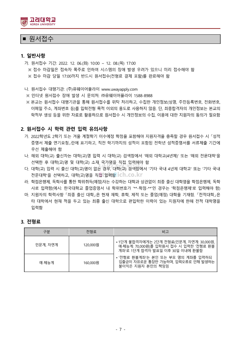고려대 편입 2023학년도 모집요강 간편하게 보자! 2022.12.01 00:30 편입 모집요강/2023학년도 모집요강 2023학년도 고려대 편입 모집요강(2022.11.30 기준)을 간편하게 확인하세요. * 최종 모집요강 발표 이후에도 내용의 일부가 변경될 수 있으니 지원 전 반드시 고려대 입학처를 확인 바랍니다. 고려대 편입 최신 모집요강 확인하기 <출처: 고려대> 공유하기 게시글 관리 리치의 편입컨설팅 저작자표시 비영리 변경금지 (새창열림) '편입 모집요강 > 2023학년도 모집요강' 카테고리의 다른 글 안양대 편입 2023학년도 모집요강 간편하게 보자! (0) 2022.12.01 한국공학대 편입 2023학년도 모집요강 간편하게 보자! (0) 2022.12.01 경희대 편입 2023학년도 모집요강 간편하게 보자! (0) 2022.11.30 서울대 편입 2023학년도 모집요강 간편하게 보자! (0) 2022.11.30 계명대 편입 2023학년도 모집요강 간편하게 보자! (0) 2022.11.30 댓글 공유하기 다른 글 댓글 이 글 공유하기 구독하기 구독하기 카카오톡 카카오톡 라인 라인 트위터 트위터 Facebook Facebook 카카오스토리 카카오스토리 밴드 밴드 네이버 블로그 네이버 블로그 Pocket Pocket Evernote Evernote 다른 글 안양대 편입 2023학년도 모집요강 간편하게 보자! 안양대 편입 2023학년도 모집요강 간편하게 보자! 2022.12.01 한국공학대 편입 2023학년도 모집요강 간편하게 보자! 한국공학대 편입 2023학년도 모집요강 간편하게 보자! 2022.12.01 경희대 편입 2023학년도 모집요강 간편하게 보자! 경희대 편입 2023학년도 모집요강 간편하게 보자! 2022.11.30 서울대 편입 2023학년도 모집요강 간편하게 보자! 서울대 편입 2023학년도 모집요강 간편하게 보자! 2022.11.30 다른 글 더 둘러보기