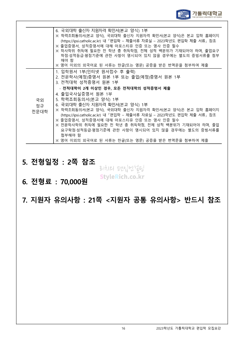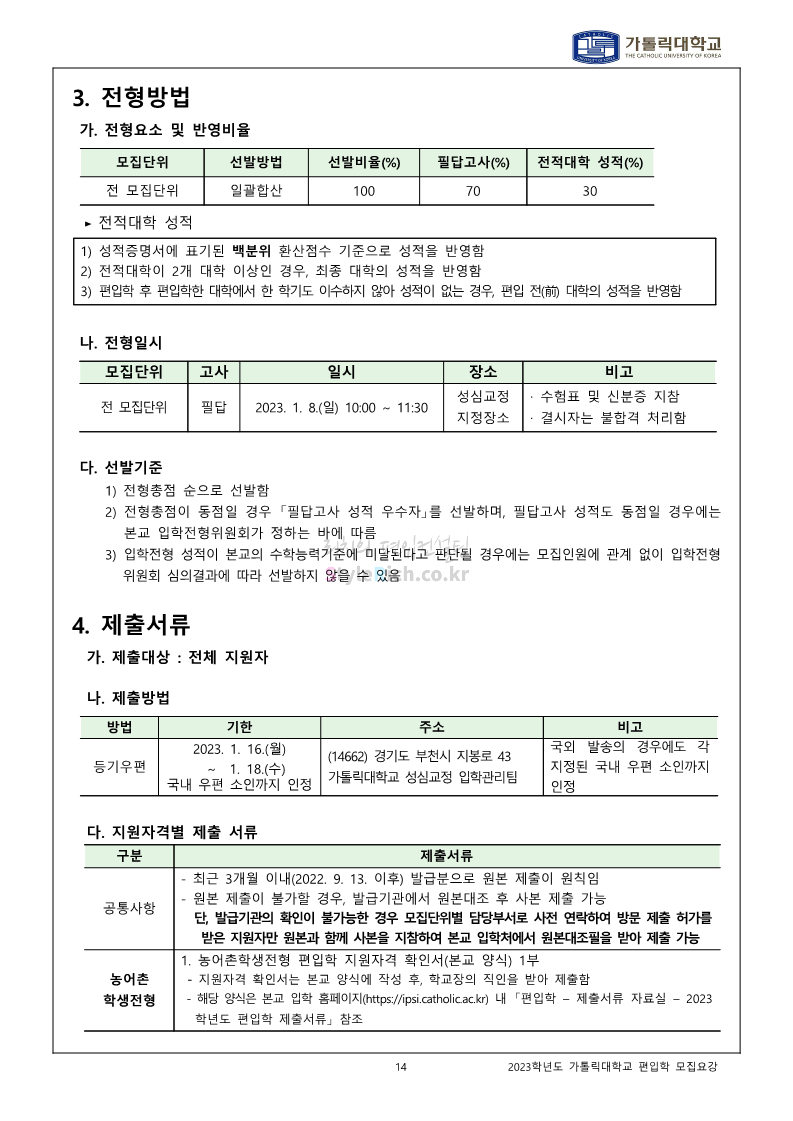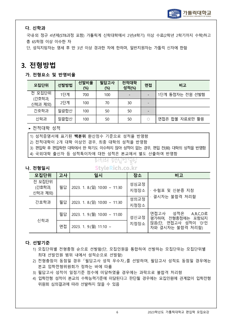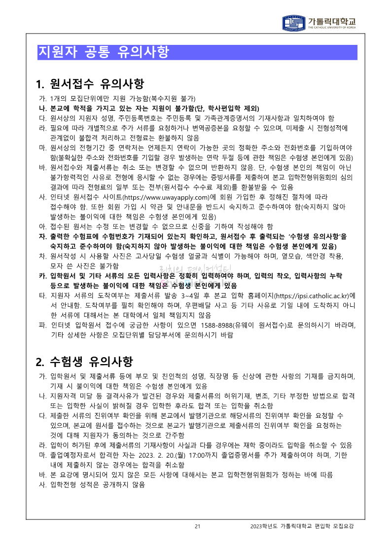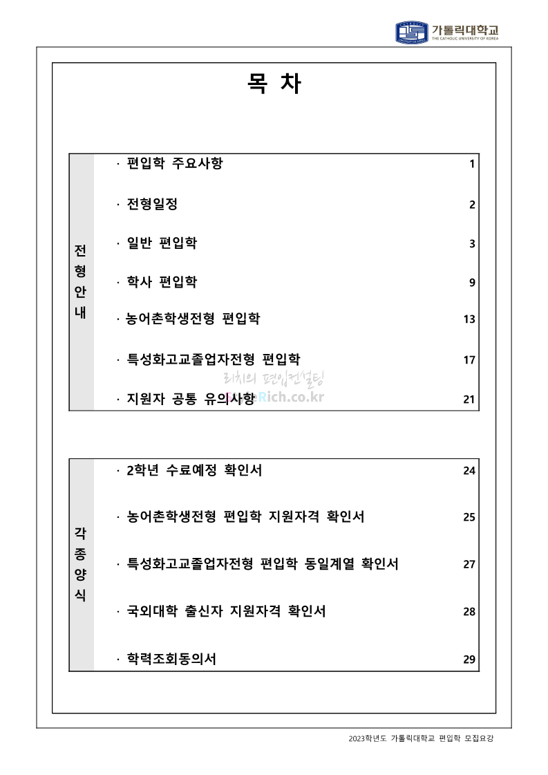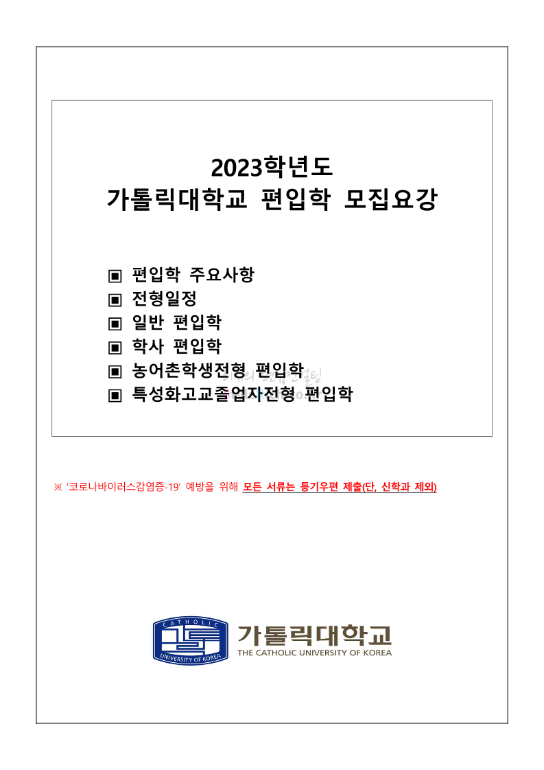 가톨릭대 편입 2023학년도 모집요강 간편하게 보자! 2022.12.02 00:10 편입 모집요강/2023학년도 모집요강 2023학년도 가톨릭대 편입 모집요강(2022.12.01 기준)을 간편하게 확인하세요. * 최종 모집요강 발표 이후에도 내용의 일부가 변경될 수 있으니 지원 전 반드시 가톨릭대 입학처를 확인 바랍니다. 가톨릭대 편입 최신 모집요강 확인하기 <출처: 가톨릭대> 공유하기 게시글 관리 리치의 편입컨설팅 저작자표시 비영리 변경금지 (새창열림) '편입 모집요강 > 2023학년도 모집요강' 카테고리의 다른 글 숭실대 편입 2023학년도 모집요강 간편하게 보자! (0) 2022.12.02 세종대 편입 2023학년도 모집요강 간편하게 보자! (0) 2022.12.02 안양대 편입 2023학년도 모집요강 간편하게 보자! (0) 2022.12.01 한국공학대 편입 2023학년도 모집요강 간편하게 보자! (0) 2022.12.01 고려대 편입 2023학년도 모집요강 간편하게 보자! (0) 2022.12.01 댓글 공유하기 다른 글 댓글 이 글 공유하기 구독하기 구독하기 카카오톡 카카오톡 라인 라인 트위터 트위터 Facebook Facebook 카카오스토리 카카오스토리 밴드 밴드 네이버 블로그 네이버 블로그 Pocket Pocket Evernote Evernote 다른 글 숭실대 편입 2023학년도 모집요강 간편하게 보자! 숭실대 편입 2023학년도 모집요강 간편하게 보자! 2022.12.02 세종대 편입 2023학년도 모집요강 간편하게 보자! 세종대 편입 2023학년도 모집요강 간편하게 보자! 2022.12.02 안양대 편입 2023학년도 모집요강 간편하게 보자! 안양대 편입 2023학년도 모집요강 간편하게 보자! 2022.12.01 한국공학대 편입 2023학년도 모집요강 간편하게 보자! 한국공학대 편입 2023학년도 모집요강 간편하게 보자! 2022.12.01 다른 글 더 둘러보기
