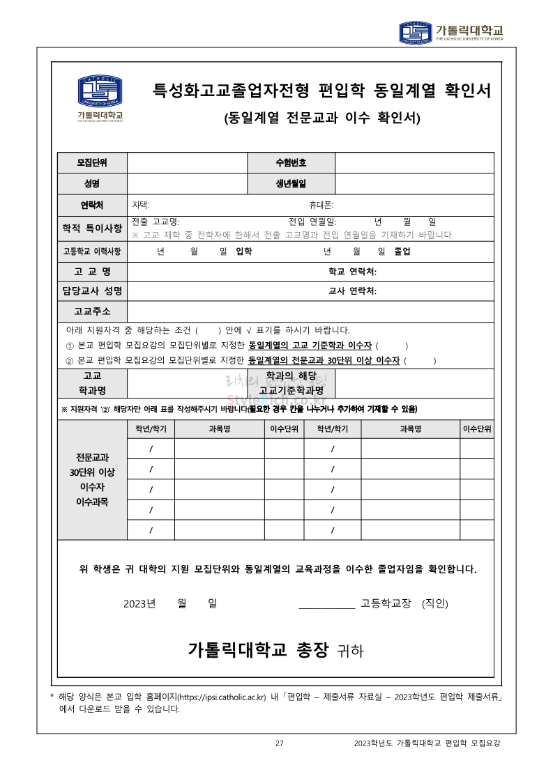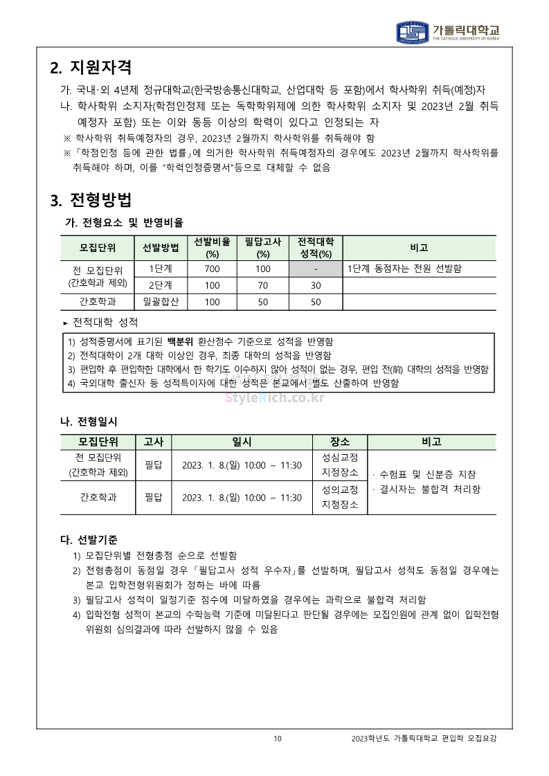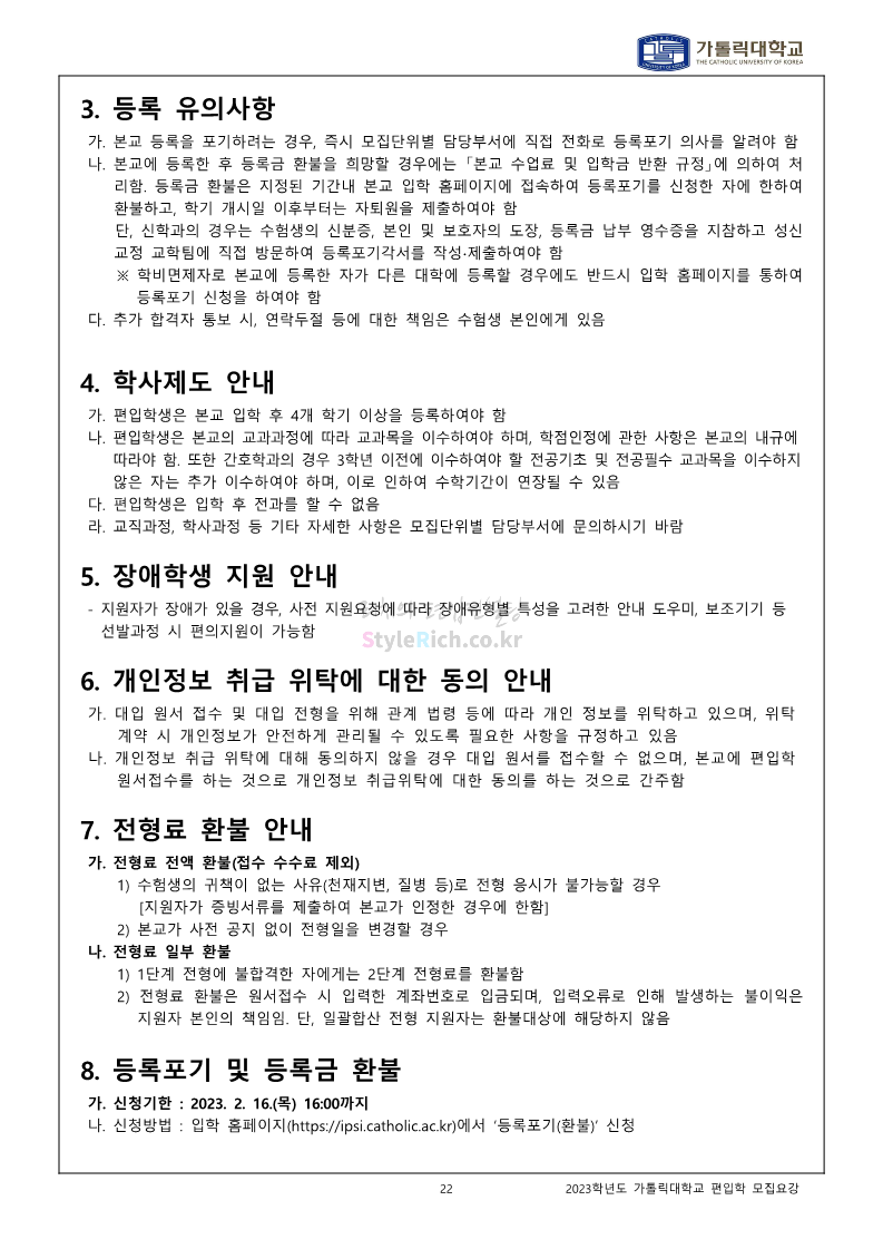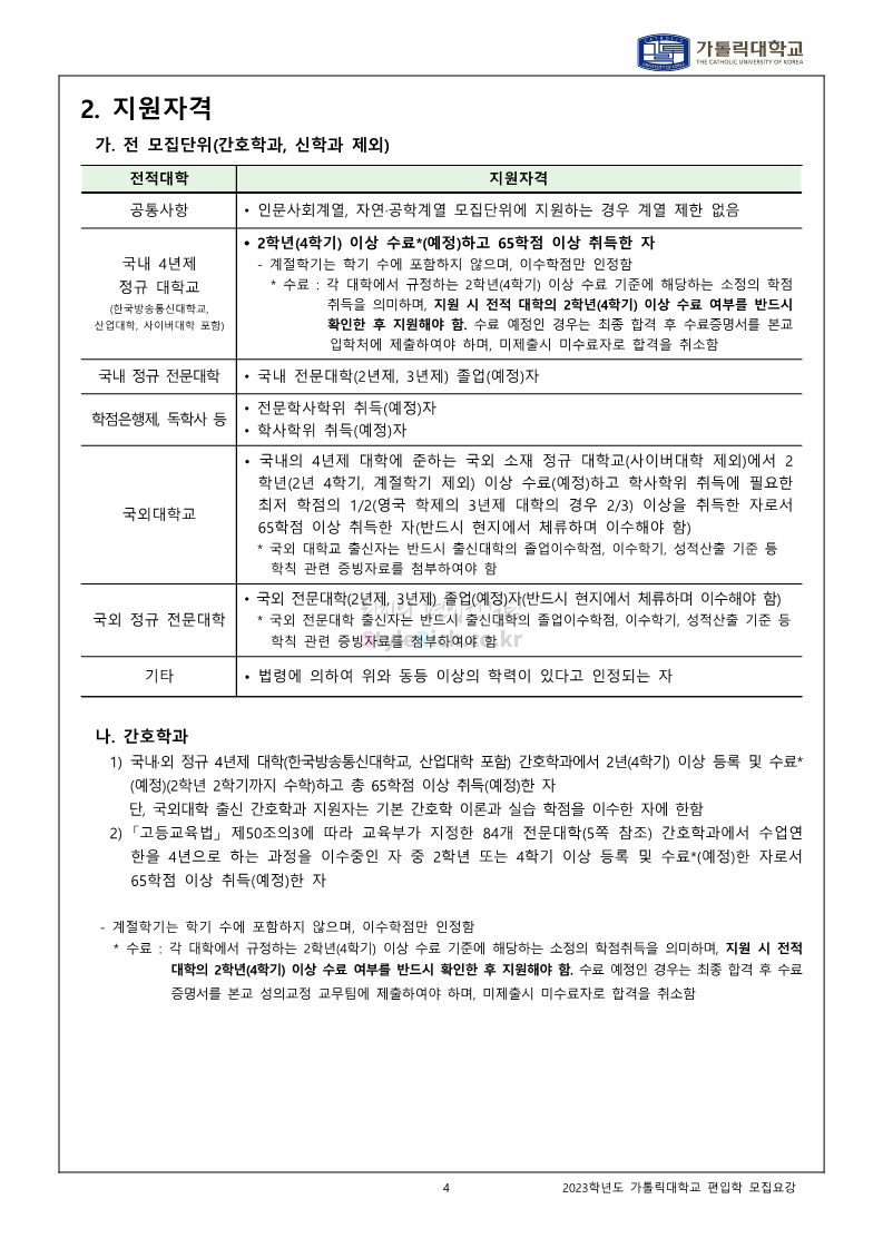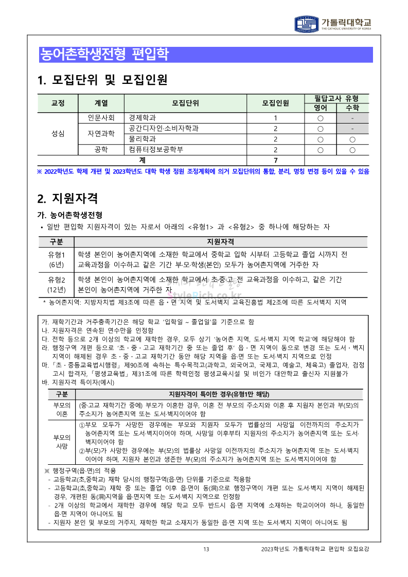 가톨릭대 편입 2023학년도 모집요강 간편하게 보자! 2022.12.02 00:10 편입 모집요강/2023학년도 모집요강 2023학년도 가톨릭대 편입 모집요강(2022.12.01 기준)을 간편하게 확인하세요. * 최종 모집요강 발표 이후에도 내용의 일부가 변경될 수 있으니 지원 전 반드시 가톨릭대 입학처를 확인 바랍니다. 가톨릭대 편입 최신 모집요강 확인하기 <출처: 가톨릭대> 공유하기 게시글 관리 리치의 편입컨설팅 저작자표시 비영리 변경금지 (새창열림) '편입 모집요강 > 2023학년도 모집요강' 카테고리의 다른 글 숭실대 편입 2023학년도 모집요강 간편하게 보자! (0) 2022.12.02 세종대 편입 2023학년도 모집요강 간편하게 보자! (0) 2022.12.02 안양대 편입 2023학년도 모집요강 간편하게 보자! (0) 2022.12.01 한국공학대 편입 2023학년도 모집요강 간편하게 보자! (0) 2022.12.01 고려대 편입 2023학년도 모집요강 간편하게 보자! (0) 2022.12.01 댓글 공유하기 다른 글 댓글 이 글 공유하기 구독하기 구독하기 카카오톡 카카오톡 라인 라인 트위터 트위터 Facebook Facebook 카카오스토리 카카오스토리 밴드 밴드 네이버 블로그 네이버 블로그 Pocket Pocket Evernote Evernote 다른 글 숭실대 편입 2023학년도 모집요강 간편하게 보자! 숭실대 편입 2023학년도 모집요강 간편하게 보자! 2022.12.02 세종대 편입 2023학년도 모집요강 간편하게 보자! 세종대 편입 2023학년도 모집요강 간편하게 보자! 2022.12.02 안양대 편입 2023학년도 모집요강 간편하게 보자! 안양대 편입 2023학년도 모집요강 간편하게 보자! 2022.12.01 한국공학대 편입 2023학년도 모집요강 간편하게 보자! 한국공학대 편입 2023학년도 모집요강 간편하게 보자! 2022.12.01 다른 글 더 둘러보기