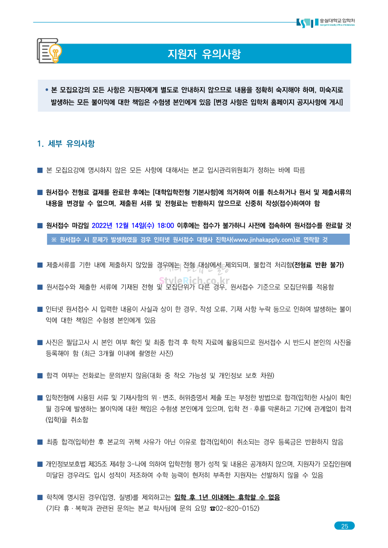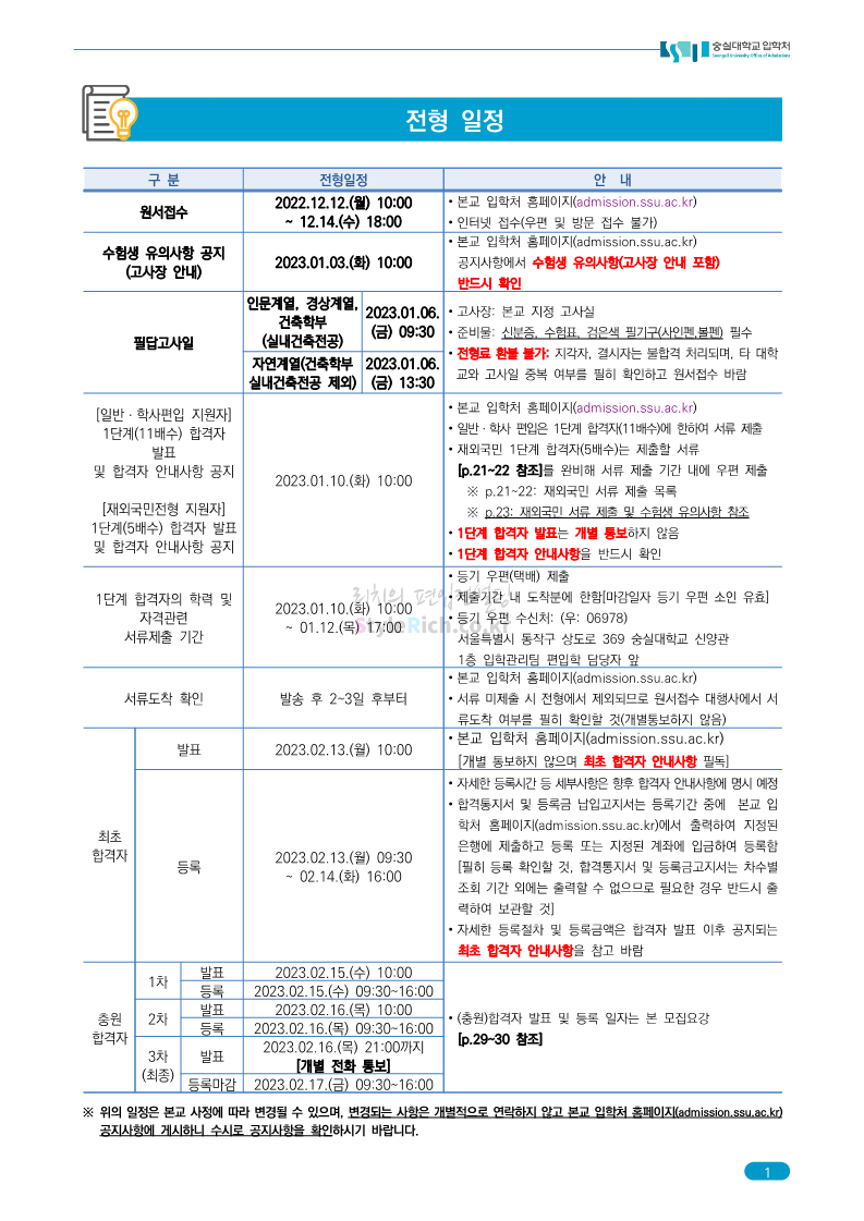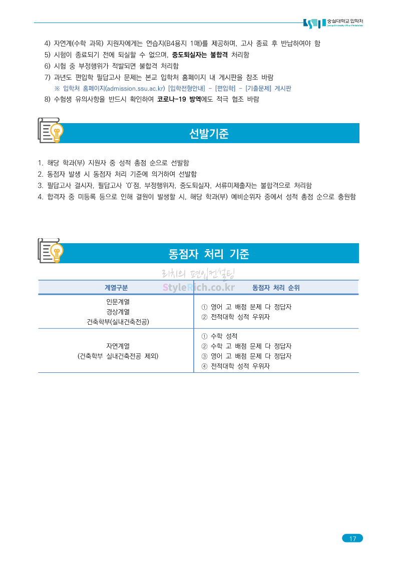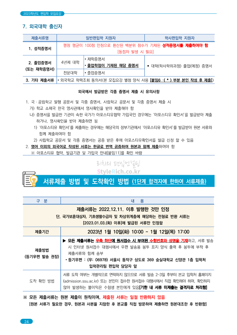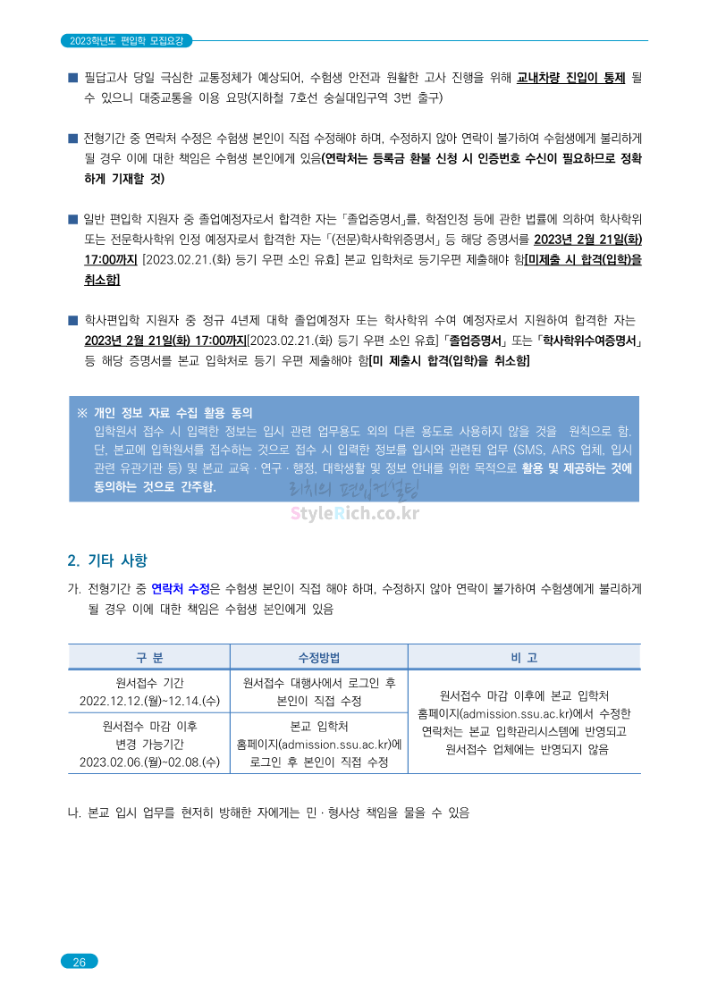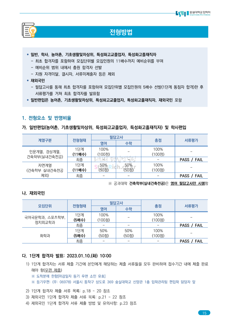 숭실대 편입 2023학년도 모집요강 간편하게 보자! 2022.12.02 01:35 편입 모집요강/2023학년도 모집요강 2023학년도 숭실대 편입 모집요강(2022.12.01 기준)을 간편하게 확인하세요. * 최종 모집요강 발표 이후에도 내용의 일부가 변경될 수 있으니 지원 전 반드시 숭실대 입학처를 확인 바랍니다. 숭실대 편입 최신 모집요강 확인하기 <출처: 숭실대> 공유하기 게시글 관리 리치의 편입컨설팅 저작자표시 비영리 변경금지 (새창열림) '편입 모집요강 > 2023학년도 모집요강' 카테고리의 다른 글 경기대 편입 2023학년도 모집요강 간편하게 보자! (0) 2022.12.03 용인대 편입 2023학년도 모집요강 간편하게 보자! (0) 2022.12.02 세종대 편입 2023학년도 모집요강 간편하게 보자! (0) 2022.12.02 가톨릭대 편입 2023학년도 모집요강 간편하게 보자! (0) 2022.12.02 안양대 편입 2023학년도 모집요강 간편하게 보자! (0) 2022.12.01 댓글 공유하기 다른 글 댓글 이 글 공유하기 구독하기 구독하기 카카오톡 카카오톡 라인 라인 트위터 트위터 Facebook Facebook 카카오스토리 카카오스토리 밴드 밴드 네이버 블로그 네이버 블로그 Pocket Pocket Evernote Evernote 다른 글 경기대 편입 2023학년도 모집요강 간편하게 보자! 경기대 편입 2023학년도 모집요강 간편하게 보자! 2022.12.03 용인대 편입 2023학년도 모집요강 간편하게 보자! 용인대 편입 2023학년도 모집요강 간편하게 보자! 2022.12.02 세종대 편입 2023학년도 모집요강 간편하게 보자! 세종대 편입 2023학년도 모집요강 간편하게 보자! 2022.12.02 가톨릭대 편입 2023학년도 모집요강 간편하게 보자! 가톨릭대 편입 2023학년도 모집요강 간편하게 보자! 2022.12.02 다른 글 더 둘러보기