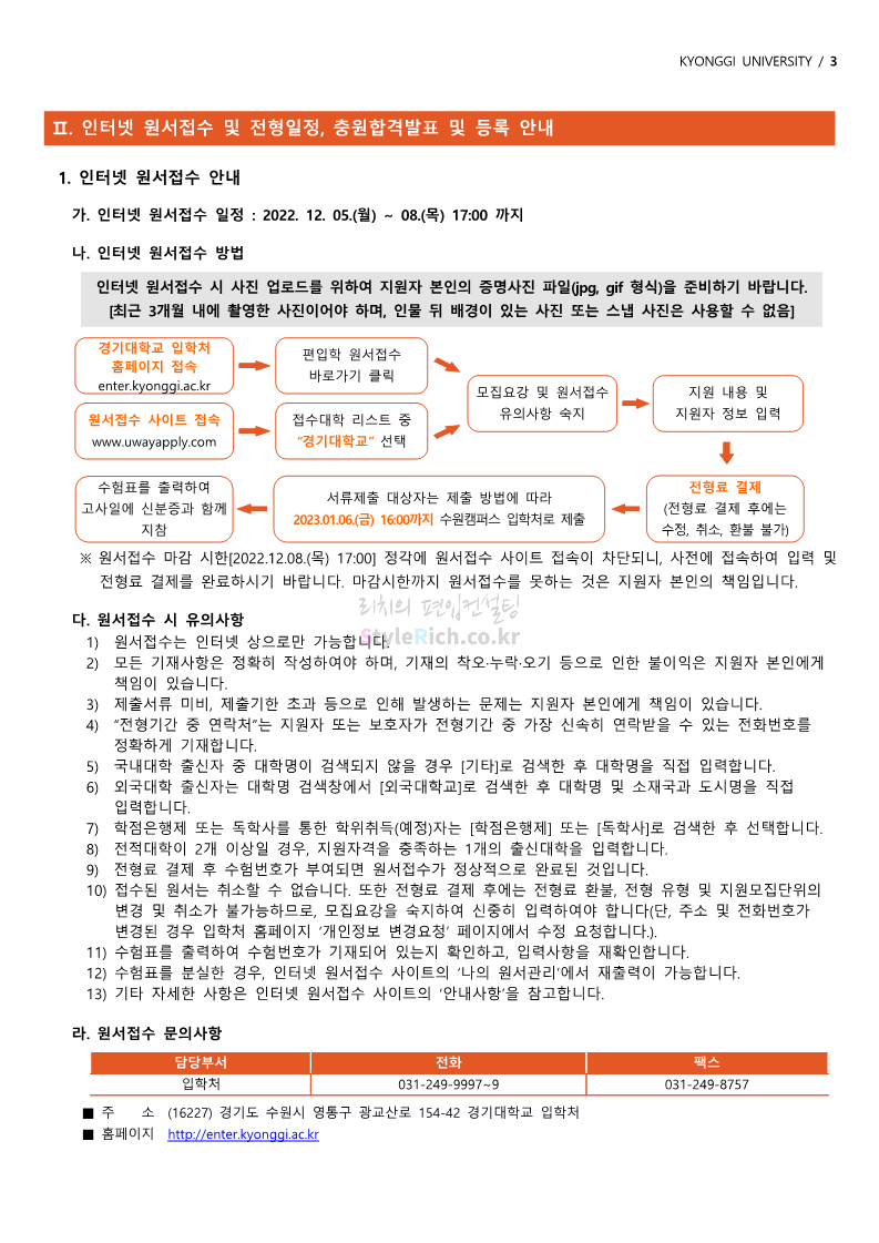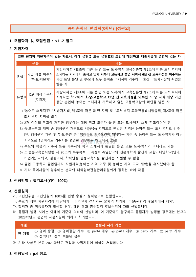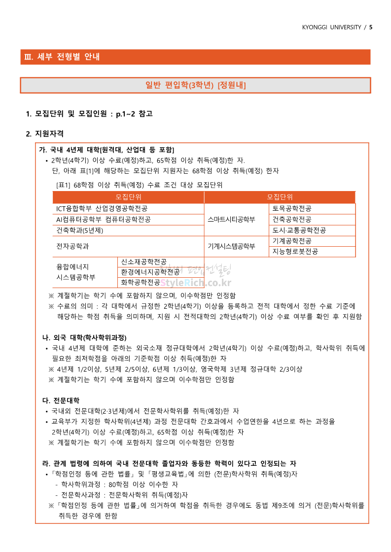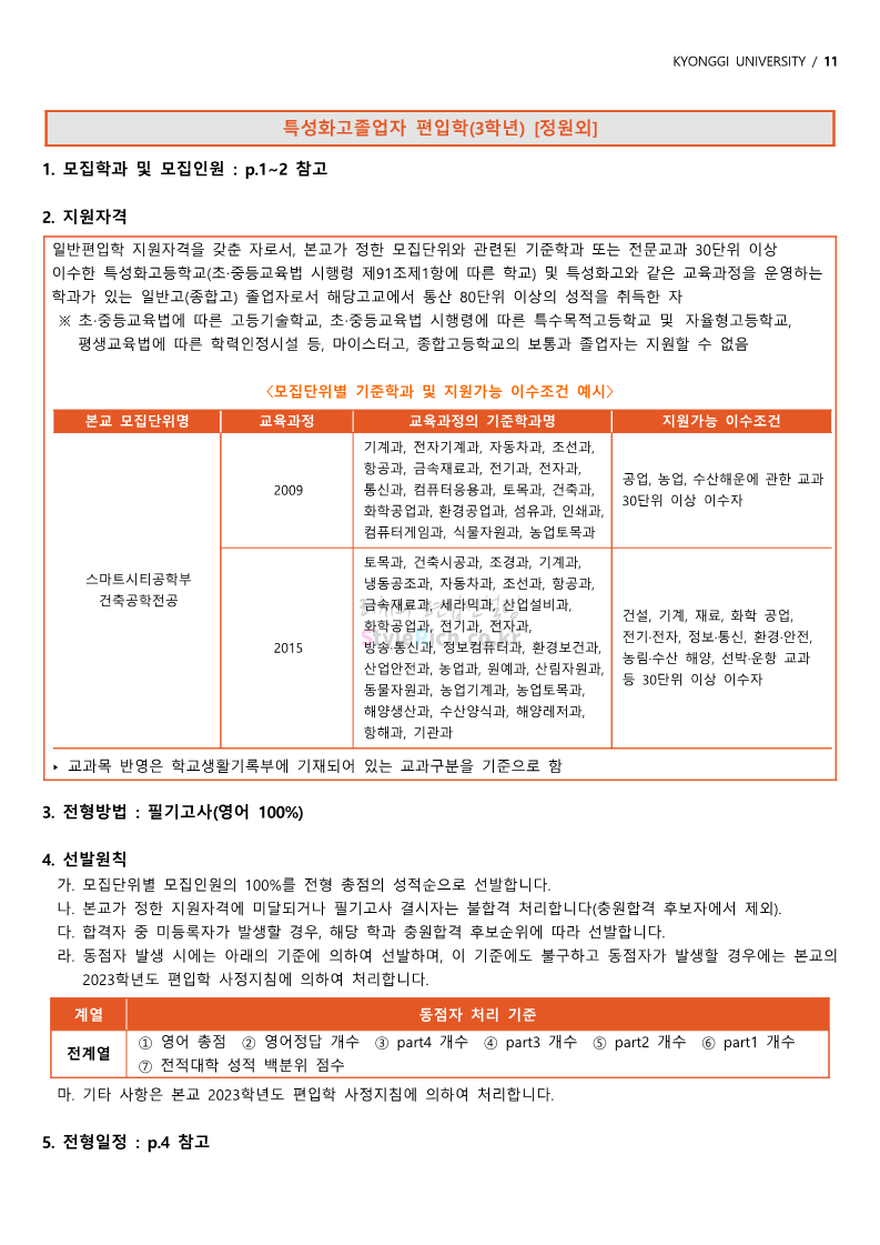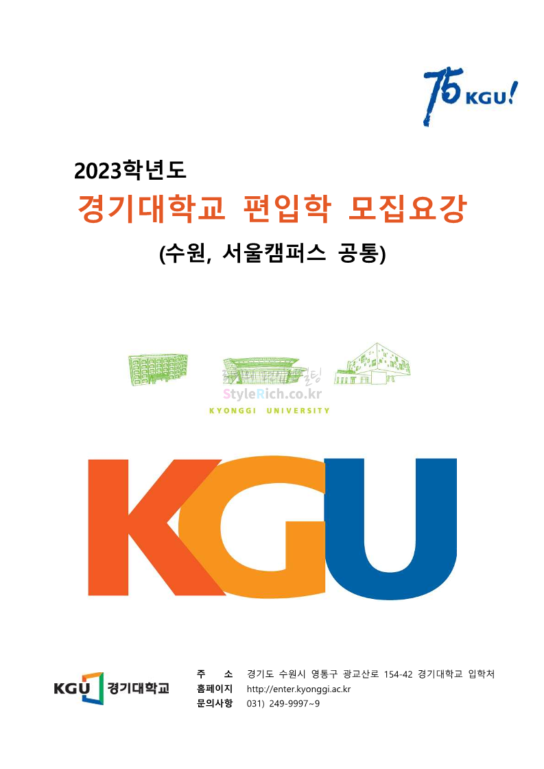 경기대 편입 2023학년도 모집요강 간편하게 보자! 2022.12.03 08:41 편입 모집요강/2023학년도 모집요강 2023학년도 경기대 편입 모집요강(2022.12.02 기준)을 간편하게 확인하세요. * 최종 모집요강 발표 이후에도 내용의 일부가 변경될 수 있으니 지원 전 반드시 경기대 입학처를 확인 바랍니다. 경기대 편입 최신 모집요강 확인하기 <출처: 경기대> 공유하기 게시글 관리 리치의 편입컨설팅 저작자표시 비영리 변경금지 (새창열림) '편입 모집요강 > 2023학년도 모집요강' 카테고리의 다른 글 이화여대 편입 2023학년도 모집요강 간편하게 보자! (0) 2022.12.03 아주대 편입 2023학년도 모집요강 간편하게 보자! (0) 2022.12.03 용인대 편입 2023학년도 모집요강 간편하게 보자! (0) 2022.12.02 숭실대 편입 2023학년도 모집요강 간편하게 보자! (0) 2022.12.02 세종대 편입 2023학년도 모집요강 간편하게 보자! (0) 2022.12.02 댓글 공유하기 다른 글 댓글 이 글 공유하기 구독하기 구독하기 카카오톡 카카오톡 라인 라인 트위터 트위터 Facebook Facebook 카카오스토리 카카오스토리 밴드 밴드 네이버 블로그 네이버 블로그 Pocket Pocket Evernote Evernote 다른 글 이화여대 편입 2023학년도 모집요강 간편하게 보자! 이화여대 편입 2023학년도 모집요강 간편하게 보자! 2022.12.03 아주대 편입 2023학년도 모집요강 간편하게 보자! 아주대 편입 2023학년도 모집요강 간편하게 보자! 2022.12.03 용인대 편입 2023학년도 모집요강 간편하게 보자! 용인대 편입 2023학년도 모집요강 간편하게 보자! 2022.12.02 숭실대 편입 2023학년도 모집요강 간편하게 보자! 숭실대 편입 2023학년도 모집요강 간편하게 보자! 2022.12.02 다른 글 더 둘러보기