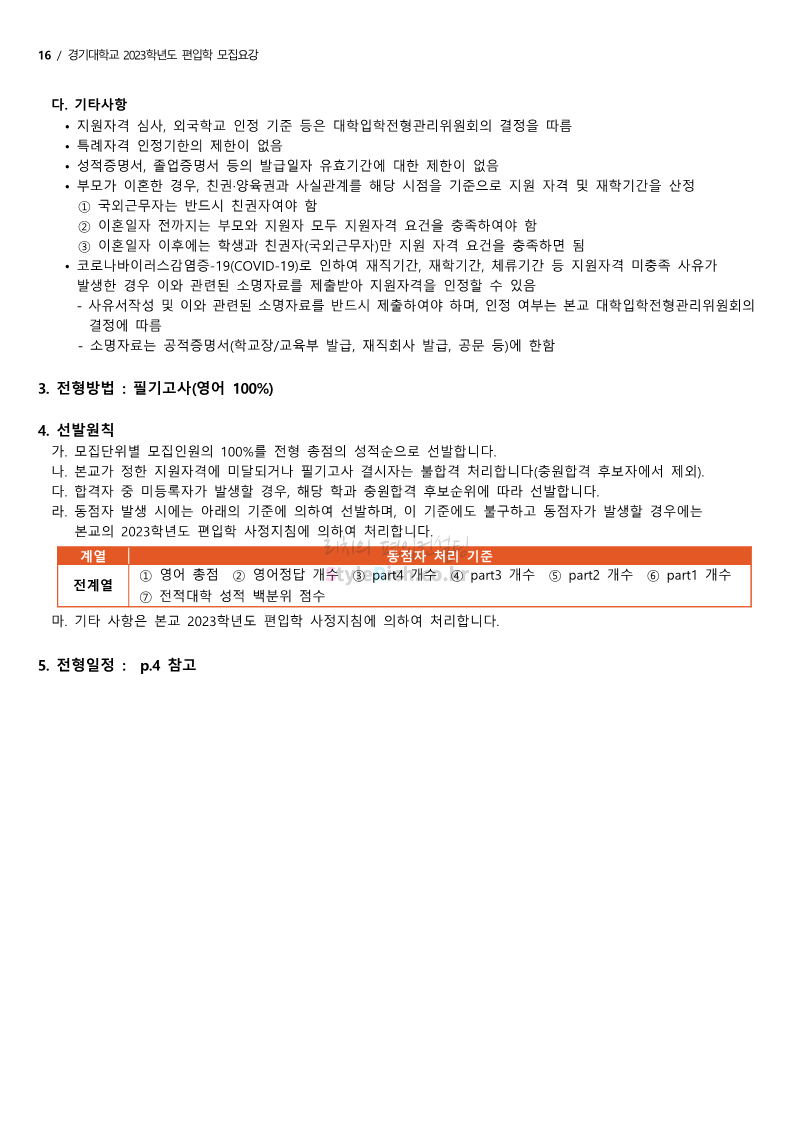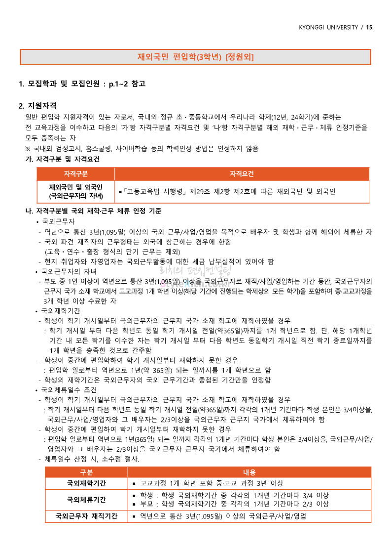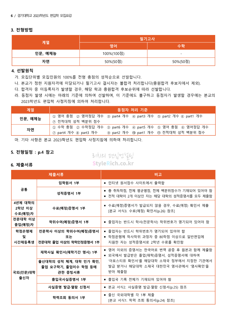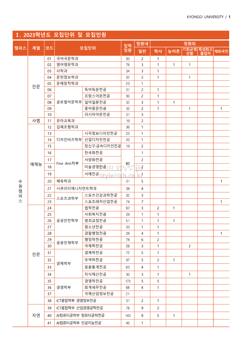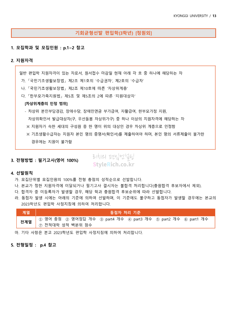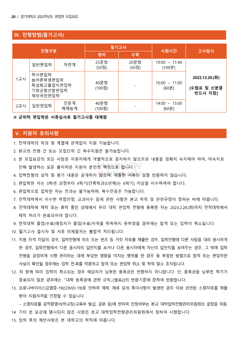 경기대 편입 2023학년도 모집요강 간편하게 보자! 2022.12.03 08:41 편입 모집요강/2023학년도 모집요강 2023학년도 경기대 편입 모집요강(2022.12.02 기준)을 간편하게 확인하세요. * 최종 모집요강 발표 이후에도 내용의 일부가 변경될 수 있으니 지원 전 반드시 경기대 입학처를 확인 바랍니다. 경기대 편입 최신 모집요강 확인하기 <출처: 경기대> 공유하기 게시글 관리 리치의 편입컨설팅 저작자표시 비영리 변경금지 (새창열림) '편입 모집요강 > 2023학년도 모집요강' 카테고리의 다른 글 이화여대 편입 2023학년도 모집요강 간편하게 보자! (0) 2022.12.03 아주대 편입 2023학년도 모집요강 간편하게 보자! (0) 2022.12.03 용인대 편입 2023학년도 모집요강 간편하게 보자! (0) 2022.12.02 숭실대 편입 2023학년도 모집요강 간편하게 보자! (0) 2022.12.02 세종대 편입 2023학년도 모집요강 간편하게 보자! (0) 2022.12.02 댓글 공유하기 다른 글 댓글 이 글 공유하기 구독하기 구독하기 카카오톡 카카오톡 라인 라인 트위터 트위터 Facebook Facebook 카카오스토리 카카오스토리 밴드 밴드 네이버 블로그 네이버 블로그 Pocket Pocket Evernote Evernote 다른 글 이화여대 편입 2023학년도 모집요강 간편하게 보자! 이화여대 편입 2023학년도 모집요강 간편하게 보자! 2022.12.03 아주대 편입 2023학년도 모집요강 간편하게 보자! 아주대 편입 2023학년도 모집요강 간편하게 보자! 2022.12.03 용인대 편입 2023학년도 모집요강 간편하게 보자! 용인대 편입 2023학년도 모집요강 간편하게 보자! 2022.12.02 숭실대 편입 2023학년도 모집요강 간편하게 보자! 숭실대 편입 2023학년도 모집요강 간편하게 보자! 2022.12.02 다른 글 더 둘러보기