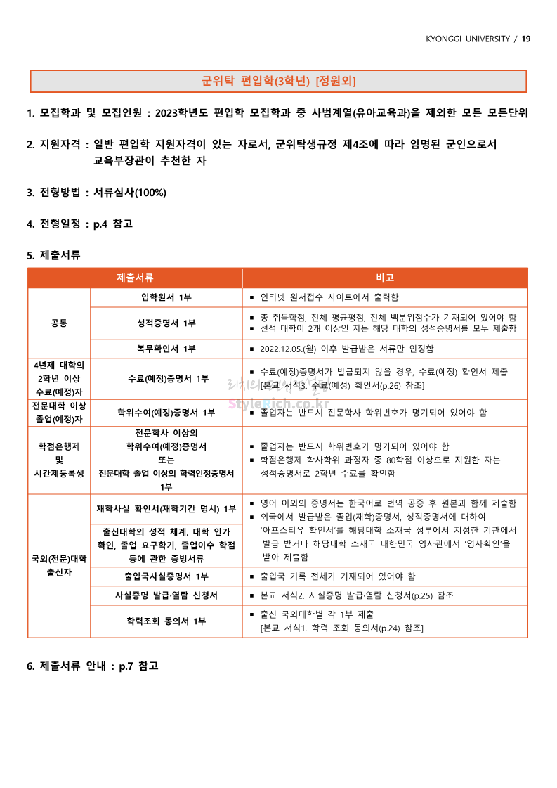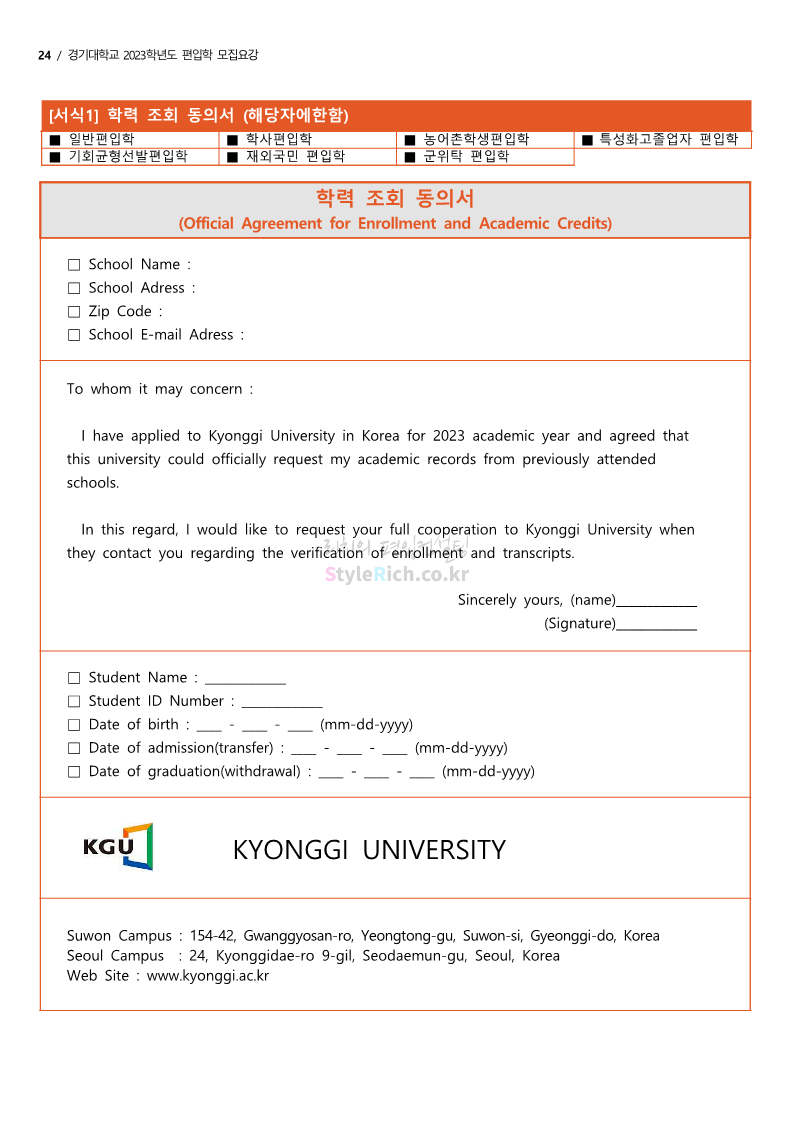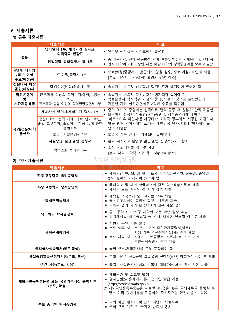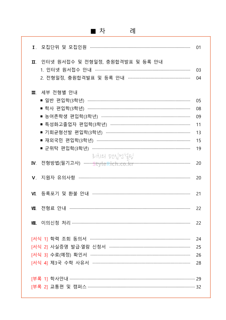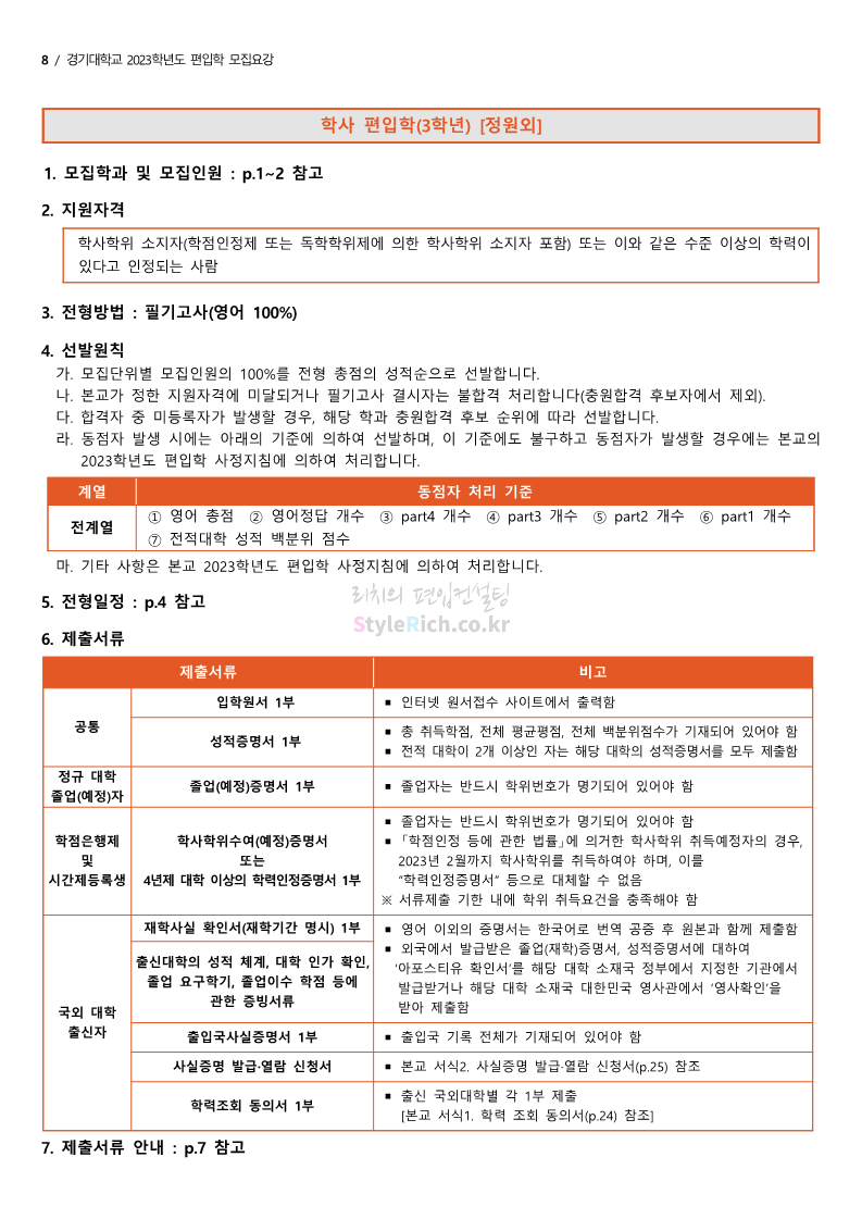 경기대 편입 2023학년도 모집요강 간편하게 보자! 2022.12.03 08:41 편입 모집요강/2023학년도 모집요강 2023학년도 경기대 편입 모집요강(2022.12.02 기준)을 간편하게 확인하세요. * 최종 모집요강 발표 이후에도 내용의 일부가 변경될 수 있으니 지원 전 반드시 경기대 입학처를 확인 바랍니다. 경기대 편입 최신 모집요강 확인하기 <출처: 경기대> 공유하기 게시글 관리 리치의 편입컨설팅 저작자표시 비영리 변경금지 (새창열림) '편입 모집요강 > 2023학년도 모집요강' 카테고리의 다른 글 이화여대 편입 2023학년도 모집요강 간편하게 보자! (0) 2022.12.03 아주대 편입 2023학년도 모집요강 간편하게 보자! (0) 2022.12.03 용인대 편입 2023학년도 모집요강 간편하게 보자! (0) 2022.12.02 숭실대 편입 2023학년도 모집요강 간편하게 보자! (0) 2022.12.02 세종대 편입 2023학년도 모집요강 간편하게 보자! (0) 2022.12.02 댓글 공유하기 다른 글 댓글 이 글 공유하기 구독하기 구독하기 카카오톡 카카오톡 라인 라인 트위터 트위터 Facebook Facebook 카카오스토리 카카오스토리 밴드 밴드 네이버 블로그 네이버 블로그 Pocket Pocket Evernote Evernote 다른 글 이화여대 편입 2023학년도 모집요강 간편하게 보자! 이화여대 편입 2023학년도 모집요강 간편하게 보자! 2022.12.03 아주대 편입 2023학년도 모집요강 간편하게 보자! 아주대 편입 2023학년도 모집요강 간편하게 보자! 2022.12.03 용인대 편입 2023학년도 모집요강 간편하게 보자! 용인대 편입 2023학년도 모집요강 간편하게 보자! 2022.12.02 숭실대 편입 2023학년도 모집요강 간편하게 보자! 숭실대 편입 2023학년도 모집요강 간편하게 보자! 2022.12.02 다른 글 더 둘러보기