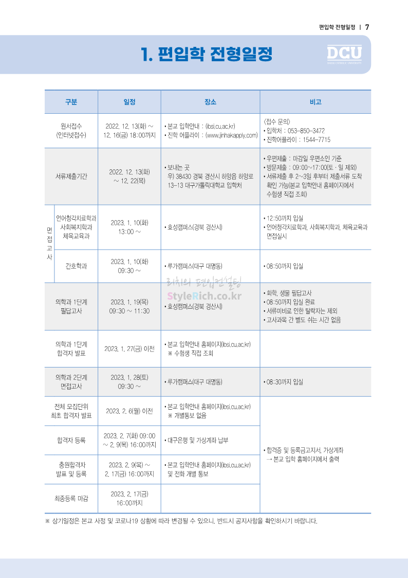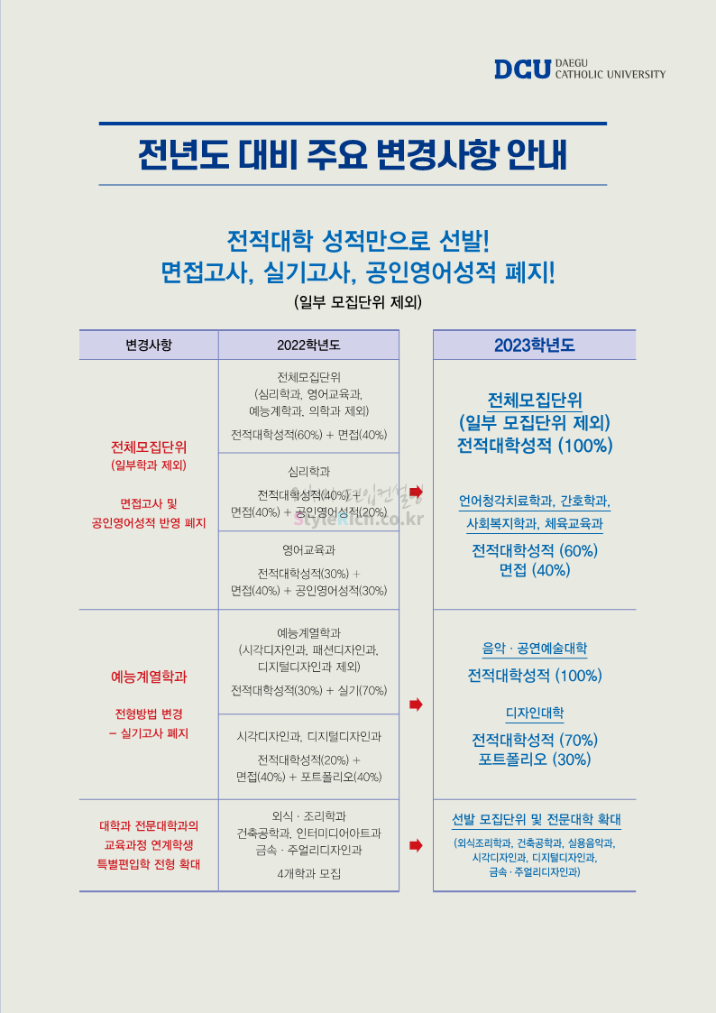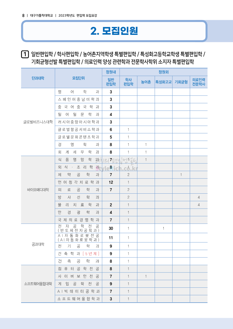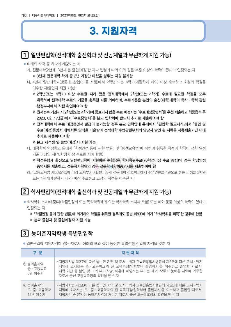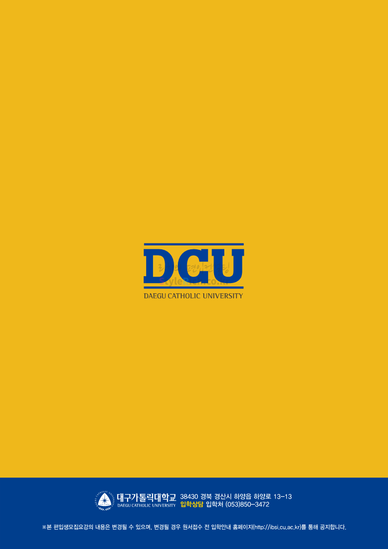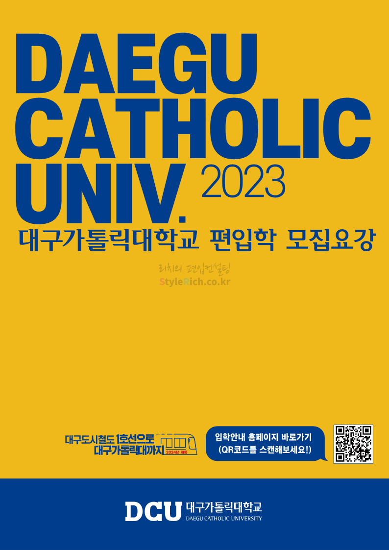 대구가톨릭대 편입 2023학년도 모집요강 간편하게 보자! 2022.12.03 15:58 편입 모집요강/2023학년도 모집요강 2023학년도 대구가톨릭대 편입 모집요강(2022.12.12 기준)을 간편하게 확인하세요. * 최종 모집요강 발표 이후에도 내용의 일부가 변경될 수 있으니 지원 전 반드시 대구가톨릭대 입학처에서 확인 바랍니다. 대구가톨릭대 편입 최신 모집요강 확인하기 <출처: 대구가톨릭대> 공유하기 게시글 관리 리치의 편입컨설팅 저작자표시 비영리 변경금지 (새창열림) '편입 모집요강 > 2023학년도 모집요강' 카테고리의 다른 글 중앙대 편입 2023학년도 모집요강 간편하게 보자! (0) 2022.12.05 숙명여대 편입 2023학년도 모집요강 간편하게 보자! (0) 2022.12.05 인하대 편입 2023학년도 모집요강 간편하게 보자! (0) 2022.12.03 이화여대 편입 2023학년도 모집요강 간편하게 보자! (0) 2022.12.03 아주대 편입 2023학년도 모집요강 간편하게 보자! (0) 2022.12.03 댓글 공유하기 다른 글 댓글 이 글 공유하기 구독하기 구독하기 카카오톡 카카오톡 라인 라인 트위터 트위터 Facebook Facebook 카카오스토리 카카오스토리 밴드 밴드 네이버 블로그 네이버 블로그 Pocket Pocket Evernote Evernote 다른 글 중앙대 편입 2023학년도 모집요강 간편하게 보자! 중앙대 편입 2023학년도 모집요강 간편하게 보자! 2022.12.05 숙명여대 편입 2023학년도 모집요강 간편하게 보자! 숙명여대 편입 2023학년도 모집요강 간편하게 보자! 2022.12.05 인하대 편입 2023학년도 모집요강 간편하게 보자! 인하대 편입 2023학년도 모집요강 간편하게 보자! 2022.12.03 이화여대 편입 2023학년도 모집요강 간편하게 보자! 이화여대 편입 2023학년도 모집요강 간편하게 보자! 2022.12.03 다른 글 더 둘러보기