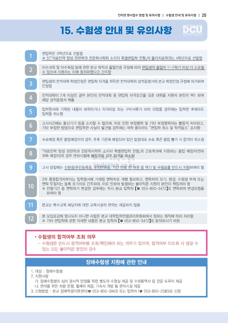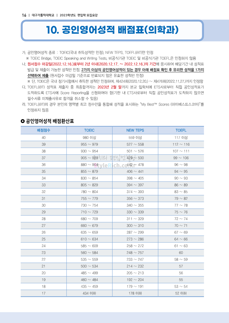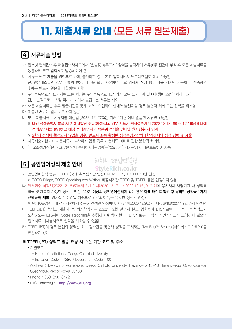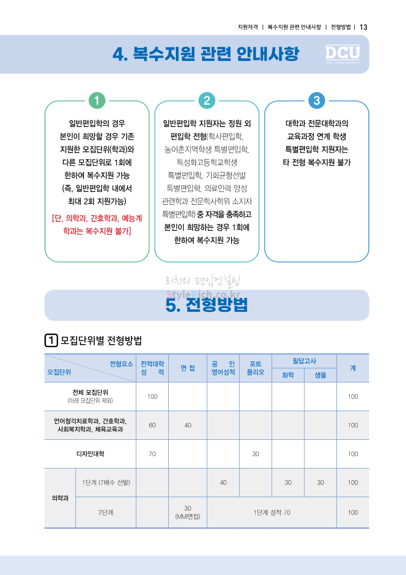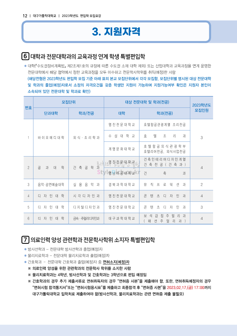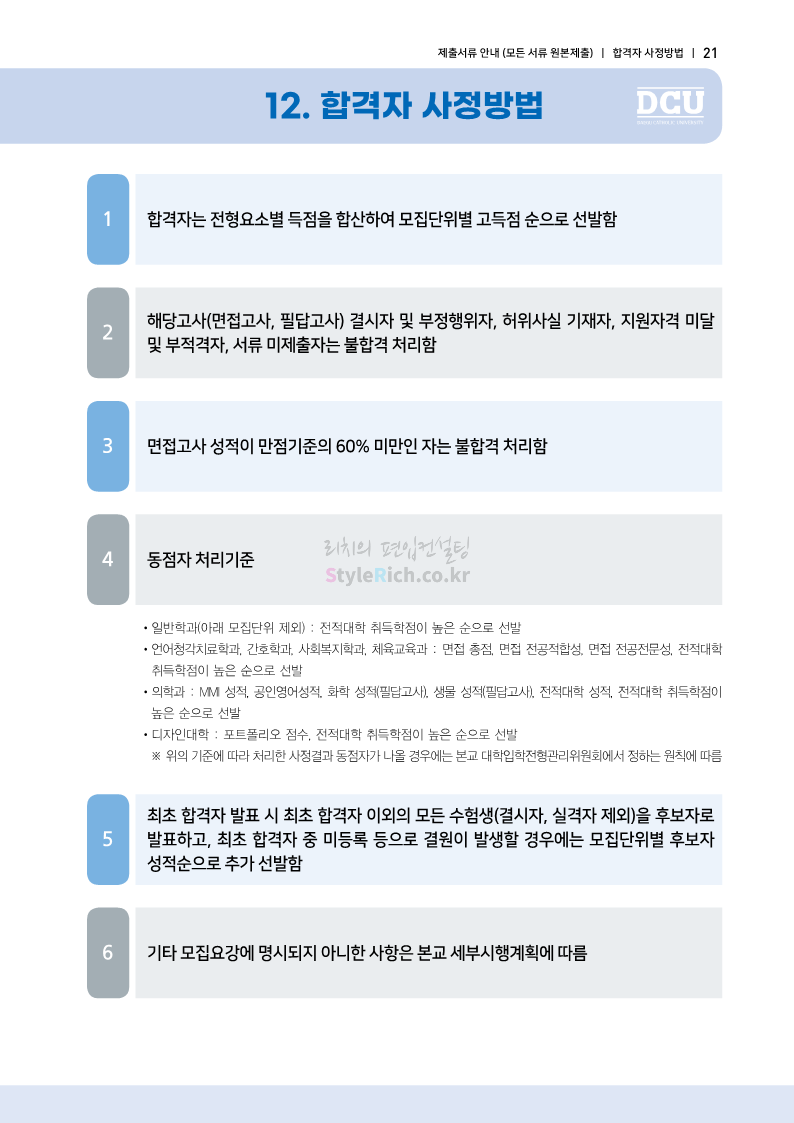 대구가톨릭대 편입 2023학년도 모집요강 간편하게 보자! 2022.12.03 15:58 편입 모집요강/2023학년도 모집요강 2023학년도 대구가톨릭대 편입 모집요강(2022.12.12 기준)을 간편하게 확인하세요. * 최종 모집요강 발표 이후에도 내용의 일부가 변경될 수 있으니 지원 전 반드시 대구가톨릭대 입학처에서 확인 바랍니다. 대구가톨릭대 편입 최신 모집요강 확인하기 <출처: 대구가톨릭대> 공유하기 게시글 관리 리치의 편입컨설팅 저작자표시 비영리 변경금지 (새창열림) '편입 모집요강 > 2023학년도 모집요강' 카테고리의 다른 글 중앙대 편입 2023학년도 모집요강 간편하게 보자! (0) 2022.12.05 숙명여대 편입 2023학년도 모집요강 간편하게 보자! (0) 2022.12.05 인하대 편입 2023학년도 모집요강 간편하게 보자! (0) 2022.12.03 이화여대 편입 2023학년도 모집요강 간편하게 보자! (0) 2022.12.03 아주대 편입 2023학년도 모집요강 간편하게 보자! (0) 2022.12.03 댓글 공유하기 다른 글 댓글 이 글 공유하기 구독하기 구독하기 카카오톡 카카오톡 라인 라인 트위터 트위터 Facebook Facebook 카카오스토리 카카오스토리 밴드 밴드 네이버 블로그 네이버 블로그 Pocket Pocket Evernote Evernote 다른 글 중앙대 편입 2023학년도 모집요강 간편하게 보자! 중앙대 편입 2023학년도 모집요강 간편하게 보자! 2022.12.05 숙명여대 편입 2023학년도 모집요강 간편하게 보자! 숙명여대 편입 2023학년도 모집요강 간편하게 보자! 2022.12.05 인하대 편입 2023학년도 모집요강 간편하게 보자! 인하대 편입 2023학년도 모집요강 간편하게 보자! 2022.12.03 이화여대 편입 2023학년도 모집요강 간편하게 보자! 이화여대 편입 2023학년도 모집요강 간편하게 보자! 2022.12.03 다른 글 더 둘러보기