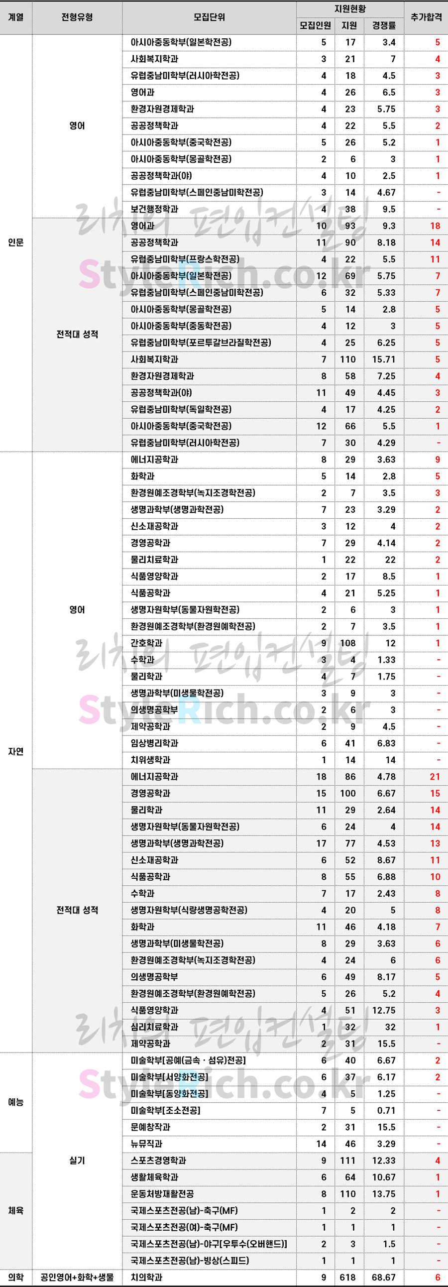 * 일반, 학사, 기회균형, 의료인력전문학사, 교육과정연계를 계열, 전형에 따라 분류 후 추가합격이 많은 순으로 정렬