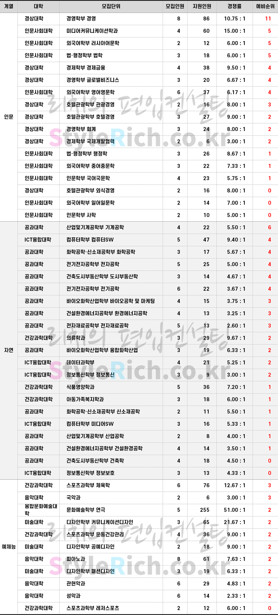 * 인문, 자연, 예체능으로 분류 후 추가합격이 많은 순으로 정렬