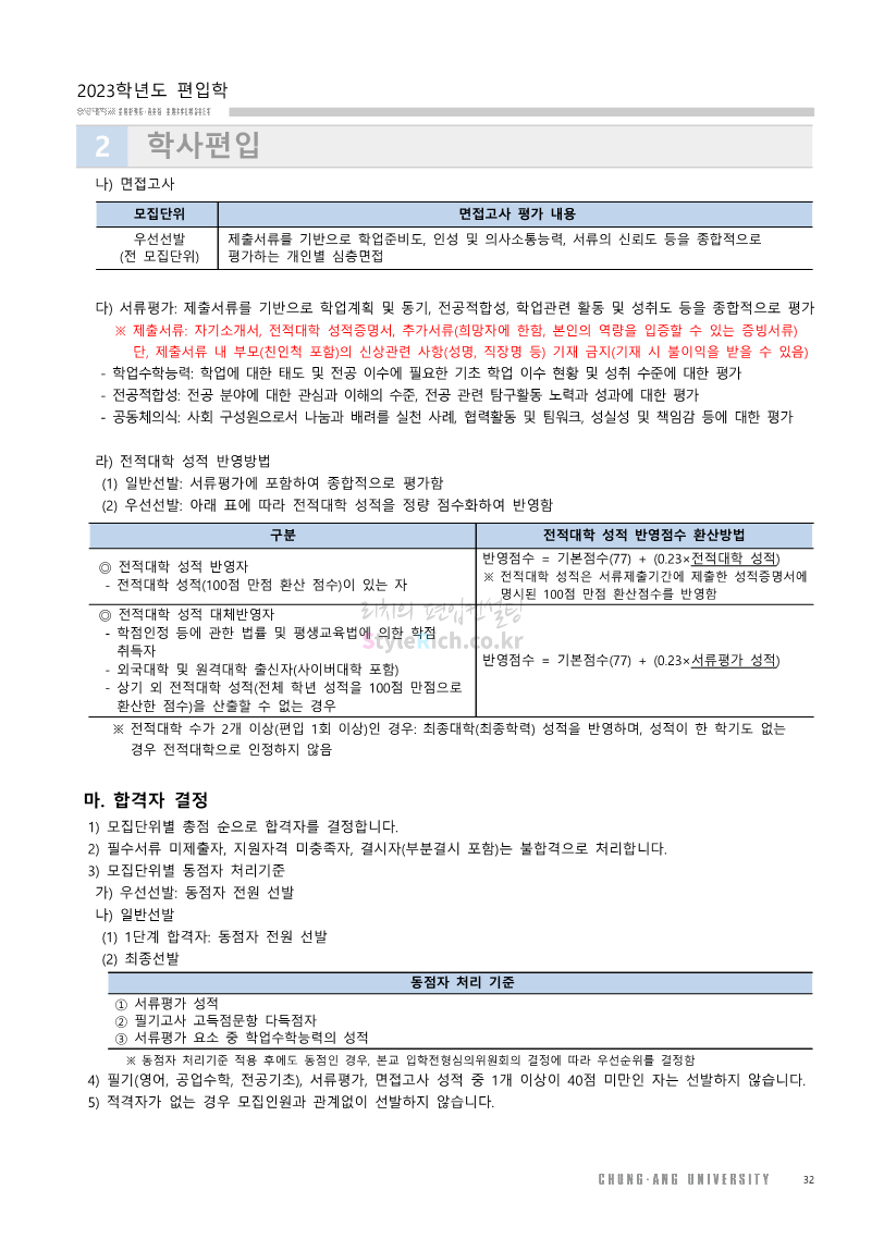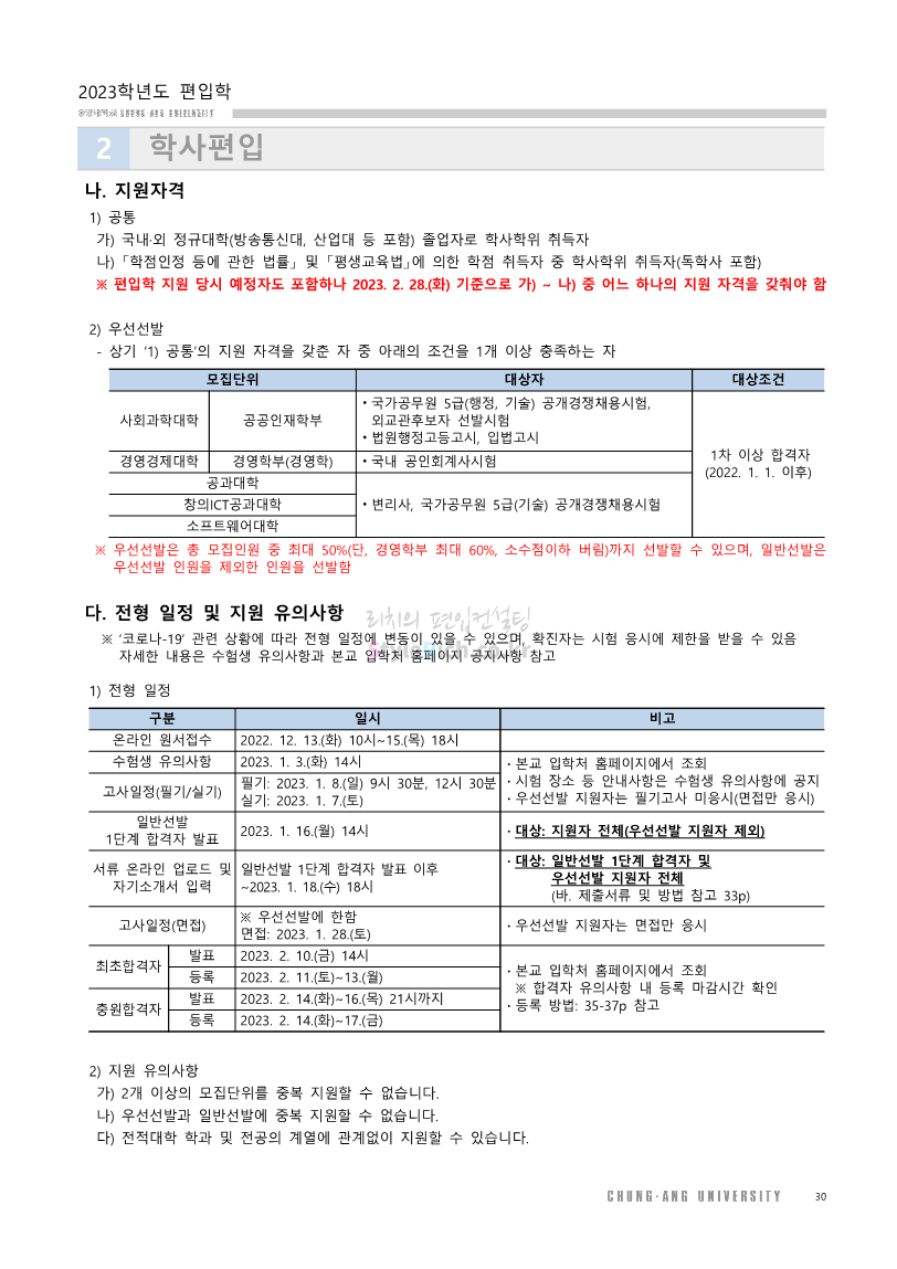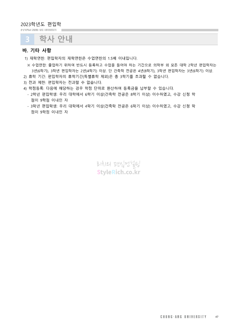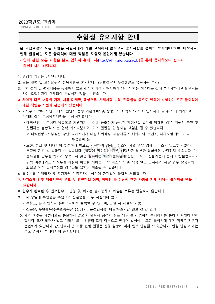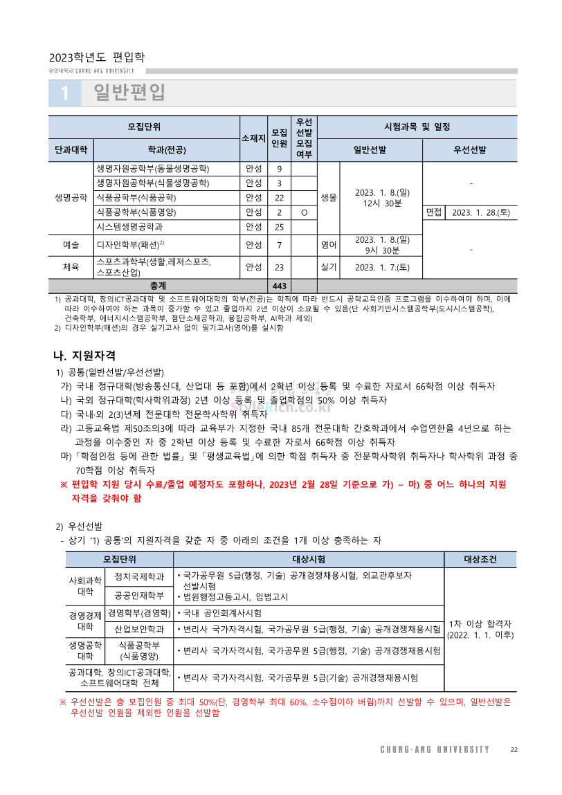 중앙대 편입 2023학년도 모집요강 간편하게 보자! 2022.12.05 23:45 편입 모집요강/2023학년도 모집요강 2023학년도 중앙대 편입 모집요강(2022.12.14 기준)을 간편하게 확인하세요. * 최종 모집요강 발표 이후에도 내용의 일부가 변경될 수 있으니 지원 전 반드시 중앙대 입학처에서 확인 바랍니다. 중앙대 편입 최신 모집요강 확인하기 <출처: 중앙대> 공유하기 게시글 관리 리치의 편입컨설팅 저작자표시 비영리 변경금지 (새창열림) '편입 모집요강 > 2023학년도 모집요강' 카테고리의 다른 글 경북대 편입 2023학년도 모집요강 간편하게 보자! (0) 2022.12.06 홍익대 편입 2023학년도 모집요강 간편하게 보자! (0) 2022.12.05 숙명여대 편입 2023학년도 모집요강 간편하게 보자! (0) 2022.12.05 대구가톨릭대 편입 2023학년도 모집요강 간편하게 보자! (0) 2022.12.03 인하대 편입 2023학년도 모집요강 간편하게 보자! (0) 2022.12.03 댓글 공유하기 다른 글 댓글 이 글 공유하기 구독하기 구독하기 카카오톡 카카오톡 라인 라인 트위터 트위터 Facebook Facebook 카카오스토리 카카오스토리 밴드 밴드 네이버 블로그 네이버 블로그 Pocket Pocket Evernote Evernote 다른 글 경북대 편입 2023학년도 모집요강 간편하게 보자! 경북대 편입 2023학년도 모집요강 간편하게 보자! 2022.12.06 홍익대 편입 2023학년도 모집요강 간편하게 보자! 홍익대 편입 2023학년도 모집요강 간편하게 보자! 2022.12.05 숙명여대 편입 2023학년도 모집요강 간편하게 보자! 숙명여대 편입 2023학년도 모집요강 간편하게 보자! 2022.12.05 대구가톨릭대 편입 2023학년도 모집요강 간편하게 보자! 대구가톨릭대 편입 2023학년도 모집요강 간편하게 보자! 2022.12.03 다른 글 더 둘러보기