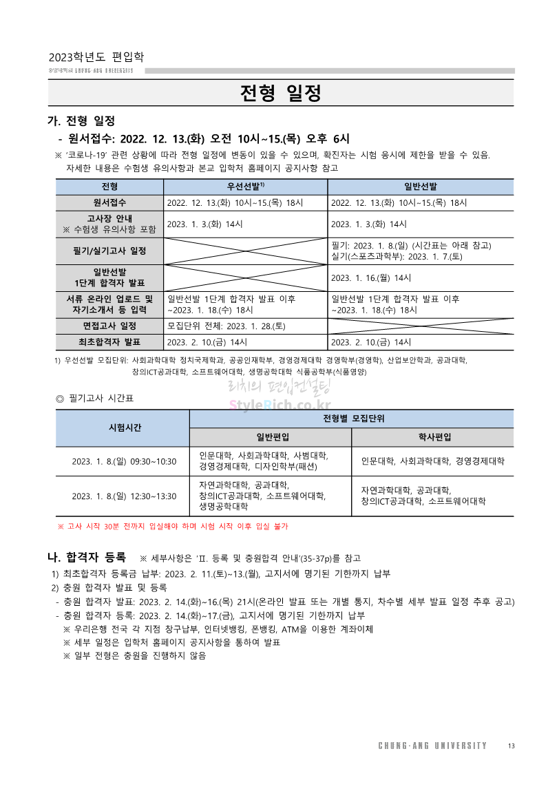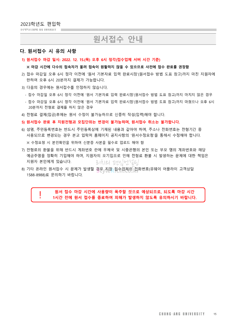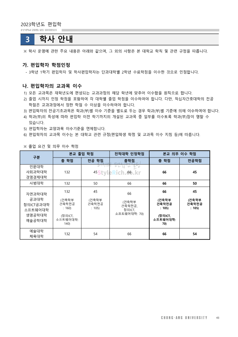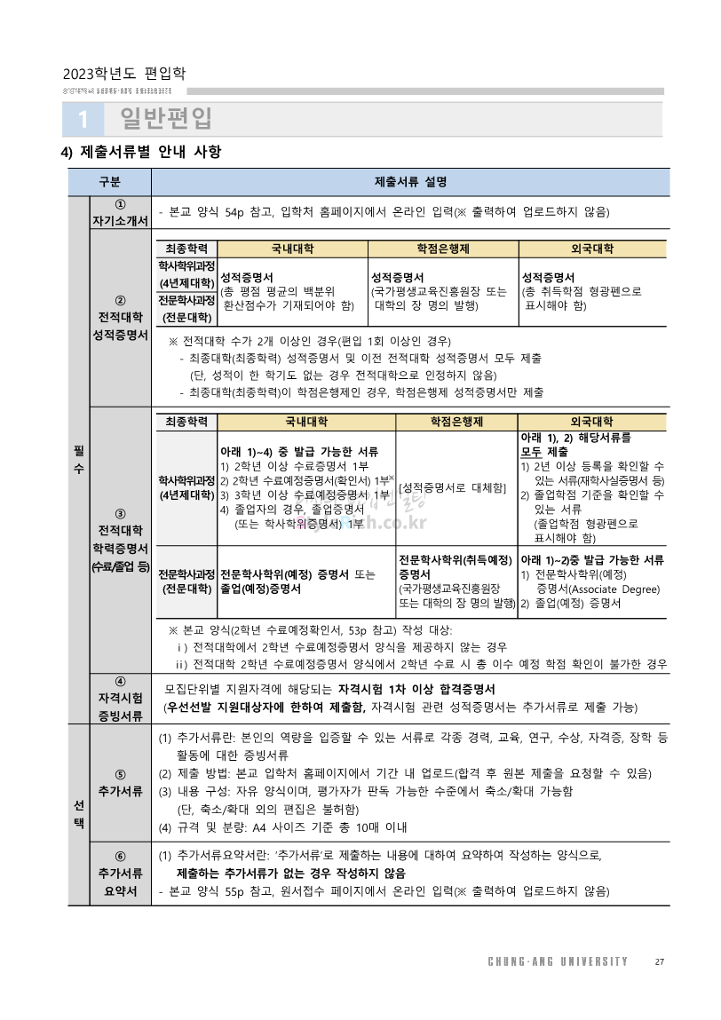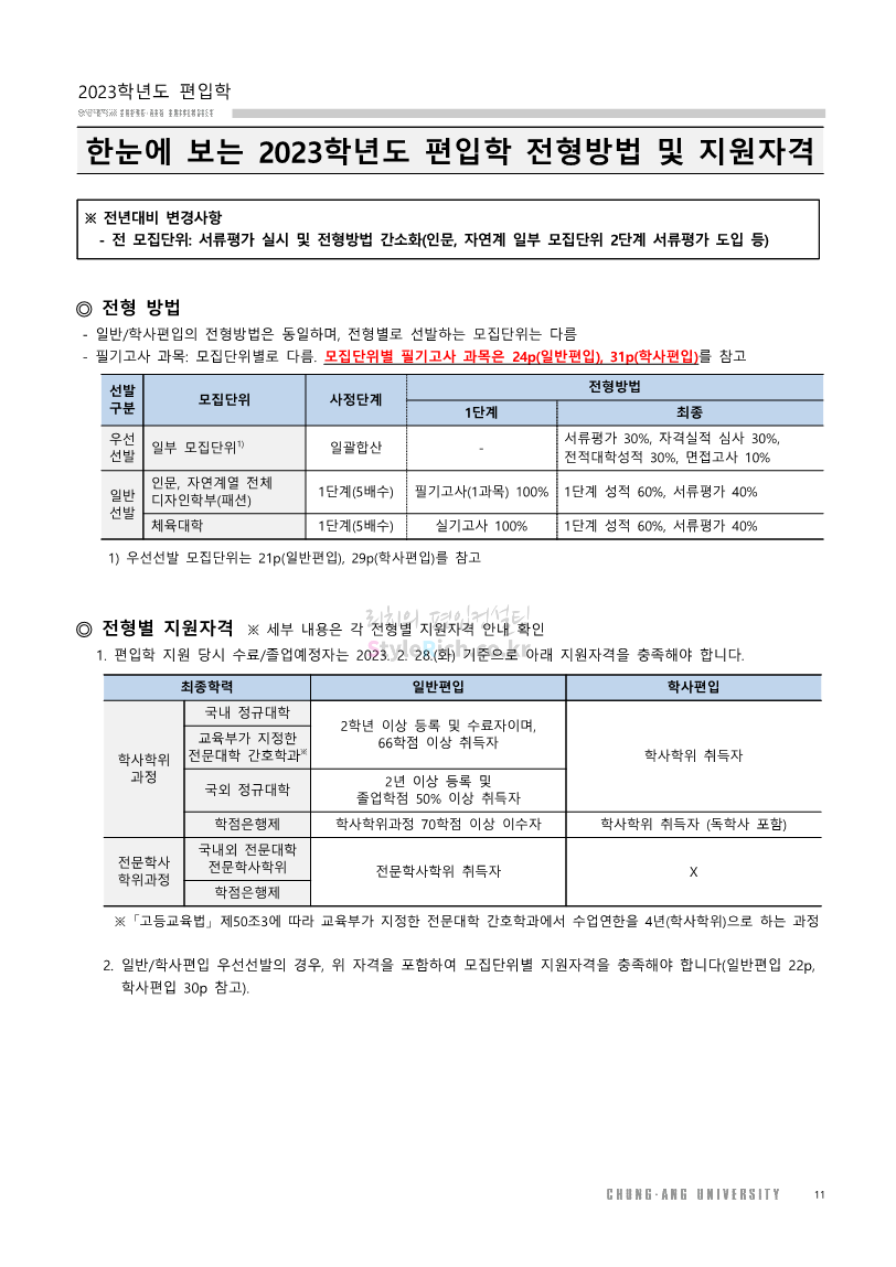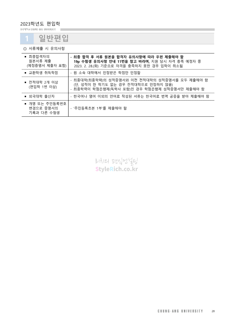 중앙대 편입 2023학년도 모집요강 간편하게 보자! 2022.12.05 23:45 편입 모집요강/2023학년도 모집요강 2023학년도 중앙대 편입 모집요강(2022.12.14 기준)을 간편하게 확인하세요. * 최종 모집요강 발표 이후에도 내용의 일부가 변경될 수 있으니 지원 전 반드시 중앙대 입학처에서 확인 바랍니다. 중앙대 편입 최신 모집요강 확인하기 <출처: 중앙대> 공유하기 게시글 관리 리치의 편입컨설팅 저작자표시 비영리 변경금지 (새창열림) '편입 모집요강 > 2023학년도 모집요강' 카테고리의 다른 글 경북대 편입 2023학년도 모집요강 간편하게 보자! (0) 2022.12.06 홍익대 편입 2023학년도 모집요강 간편하게 보자! (0) 2022.12.05 숙명여대 편입 2023학년도 모집요강 간편하게 보자! (0) 2022.12.05 대구가톨릭대 편입 2023학년도 모집요강 간편하게 보자! (0) 2022.12.03 인하대 편입 2023학년도 모집요강 간편하게 보자! (0) 2022.12.03 댓글 공유하기 다른 글 댓글 이 글 공유하기 구독하기 구독하기 카카오톡 카카오톡 라인 라인 트위터 트위터 Facebook Facebook 카카오스토리 카카오스토리 밴드 밴드 네이버 블로그 네이버 블로그 Pocket Pocket Evernote Evernote 다른 글 경북대 편입 2023학년도 모집요강 간편하게 보자! 경북대 편입 2023학년도 모집요강 간편하게 보자! 2022.12.06 홍익대 편입 2023학년도 모집요강 간편하게 보자! 홍익대 편입 2023학년도 모집요강 간편하게 보자! 2022.12.05 숙명여대 편입 2023학년도 모집요강 간편하게 보자! 숙명여대 편입 2023학년도 모집요강 간편하게 보자! 2022.12.05 대구가톨릭대 편입 2023학년도 모집요강 간편하게 보자! 대구가톨릭대 편입 2023학년도 모집요강 간편하게 보자! 2022.12.03 다른 글 더 둘러보기