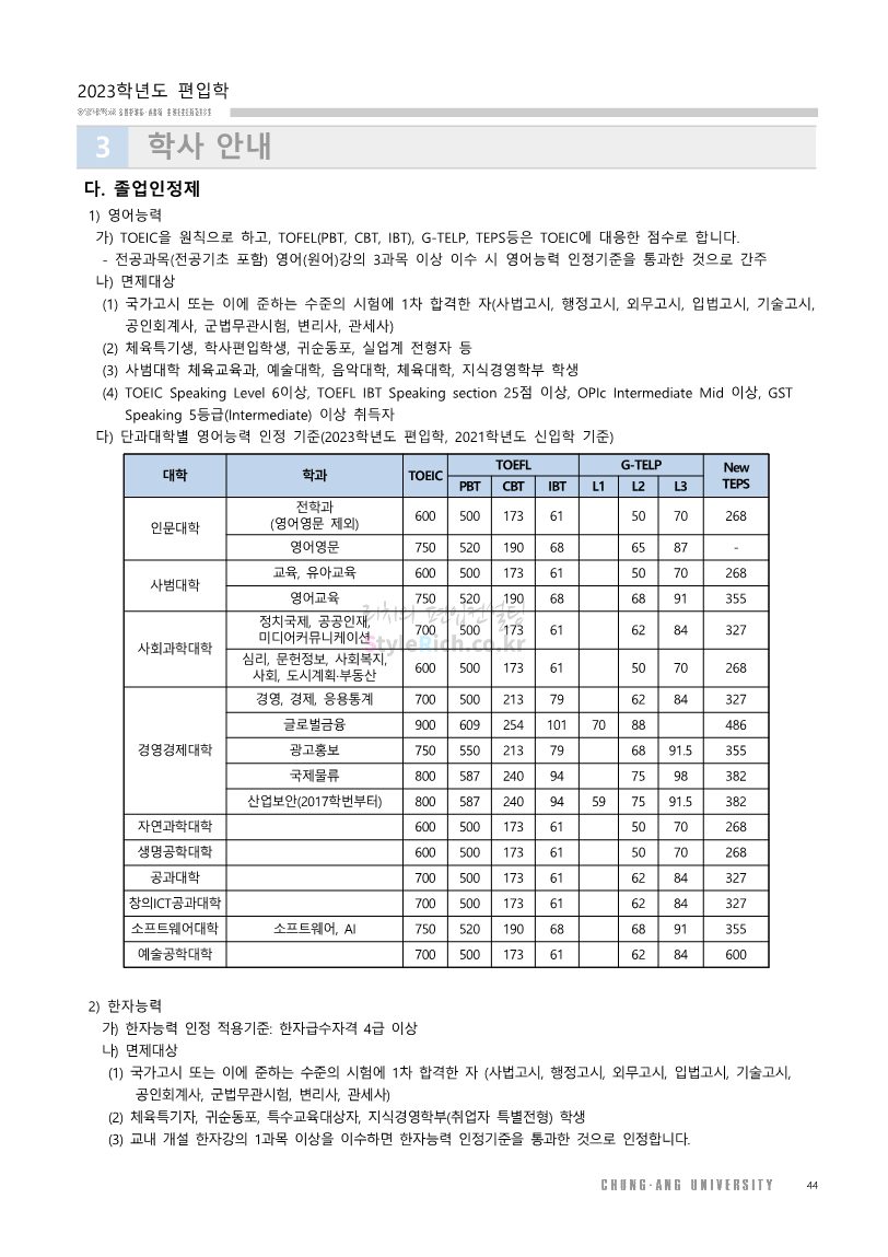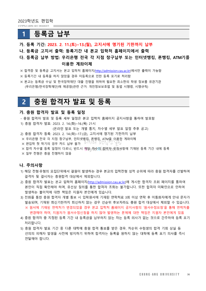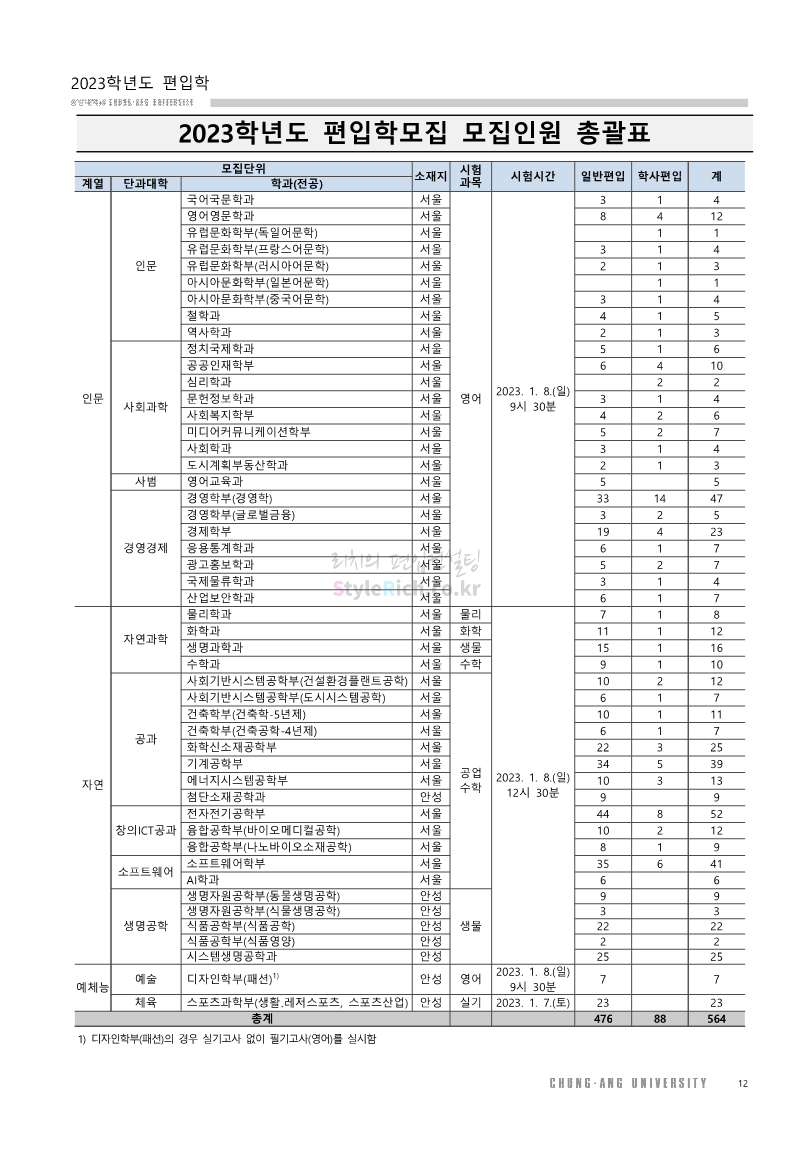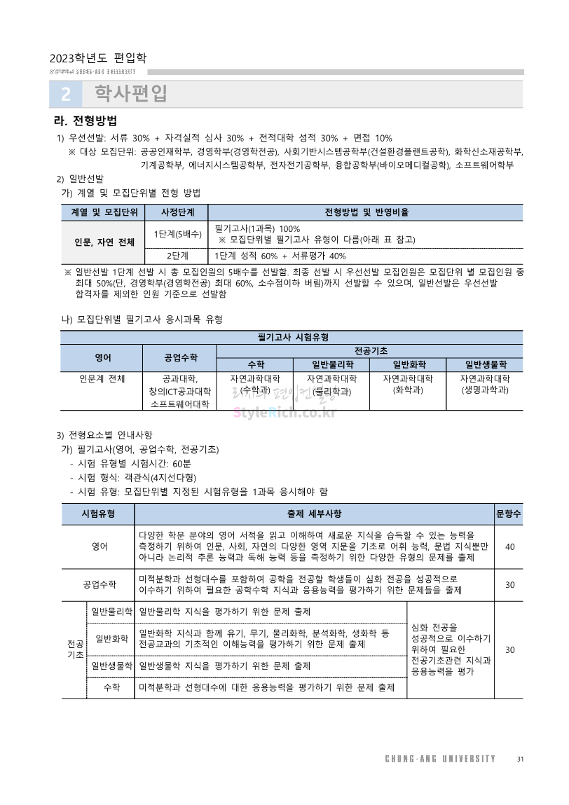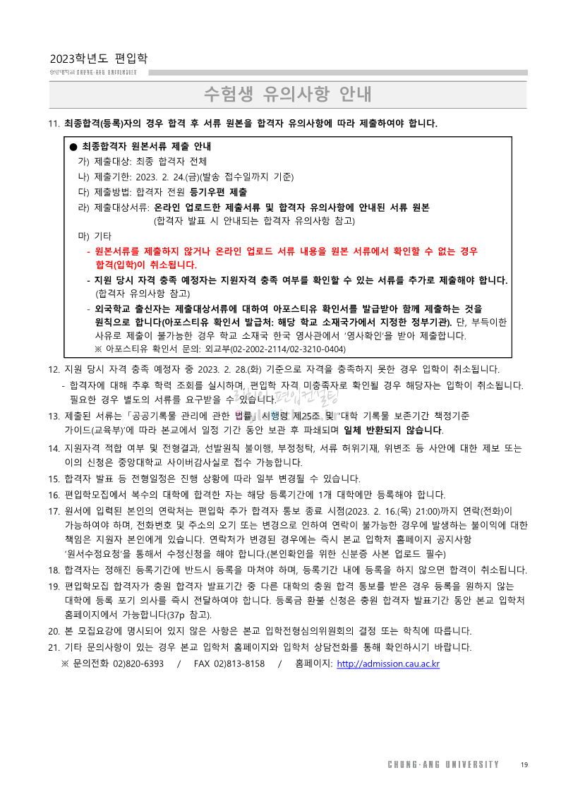 중앙대 편입 2023학년도 모집요강 간편하게 보자! 2022.12.05 23:45 편입 모집요강/2023학년도 모집요강 2023학년도 중앙대 편입 모집요강(2022.12.14 기준)을 간편하게 확인하세요. * 최종 모집요강 발표 이후에도 내용의 일부가 변경될 수 있으니 지원 전 반드시 중앙대 입학처에서 확인 바랍니다. 중앙대 편입 최신 모집요강 확인하기 <출처: 중앙대> 공유하기 게시글 관리 리치의 편입컨설팅 저작자표시 비영리 변경금지 (새창열림) '편입 모집요강 > 2023학년도 모집요강' 카테고리의 다른 글 경북대 편입 2023학년도 모집요강 간편하게 보자! (0) 2022.12.06 홍익대 편입 2023학년도 모집요강 간편하게 보자! (0) 2022.12.05 숙명여대 편입 2023학년도 모집요강 간편하게 보자! (0) 2022.12.05 대구가톨릭대 편입 2023학년도 모집요강 간편하게 보자! (0) 2022.12.03 인하대 편입 2023학년도 모집요강 간편하게 보자! (0) 2022.12.03 댓글 공유하기 다른 글 댓글 이 글 공유하기 구독하기 구독하기 카카오톡 카카오톡 라인 라인 트위터 트위터 Facebook Facebook 카카오스토리 카카오스토리 밴드 밴드 네이버 블로그 네이버 블로그 Pocket Pocket Evernote Evernote 다른 글 경북대 편입 2023학년도 모집요강 간편하게 보자! 경북대 편입 2023학년도 모집요강 간편하게 보자! 2022.12.06 홍익대 편입 2023학년도 모집요강 간편하게 보자! 홍익대 편입 2023학년도 모집요강 간편하게 보자! 2022.12.05 숙명여대 편입 2023학년도 모집요강 간편하게 보자! 숙명여대 편입 2023학년도 모집요강 간편하게 보자! 2022.12.05 대구가톨릭대 편입 2023학년도 모집요강 간편하게 보자! 대구가톨릭대 편입 2023학년도 모집요강 간편하게 보자! 2022.12.03 다른 글 더 둘러보기