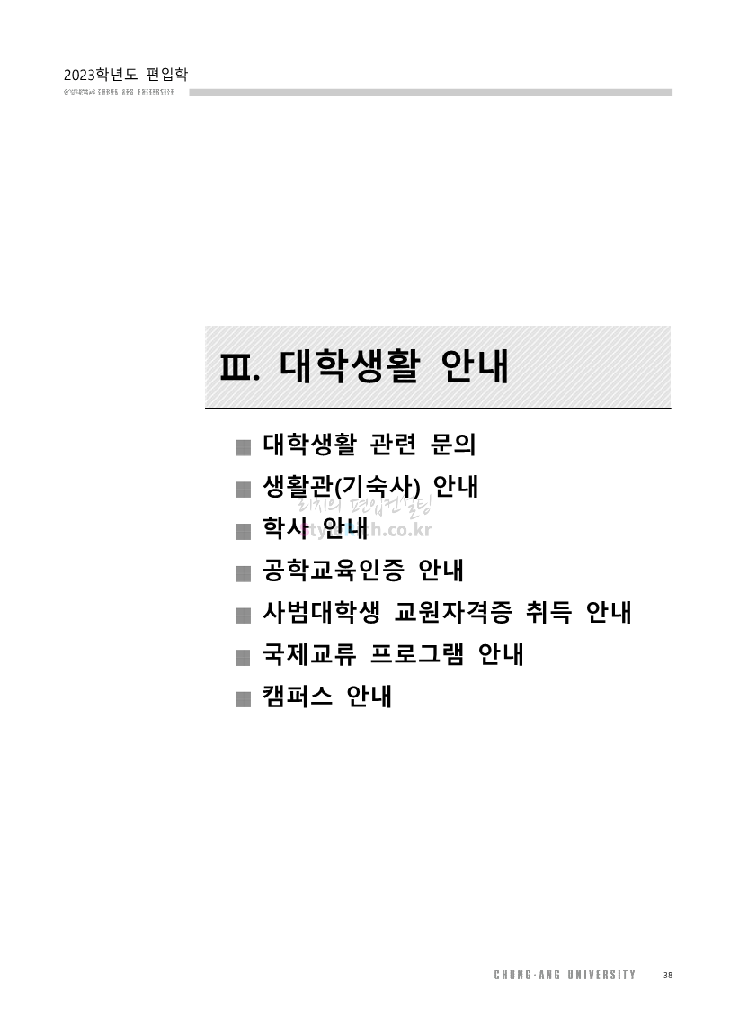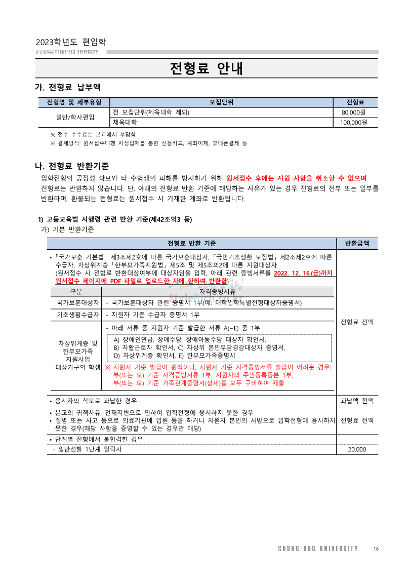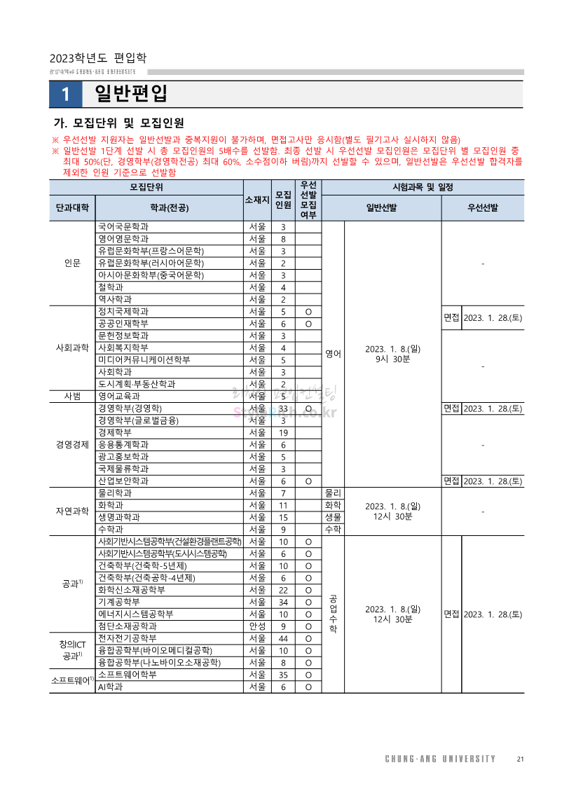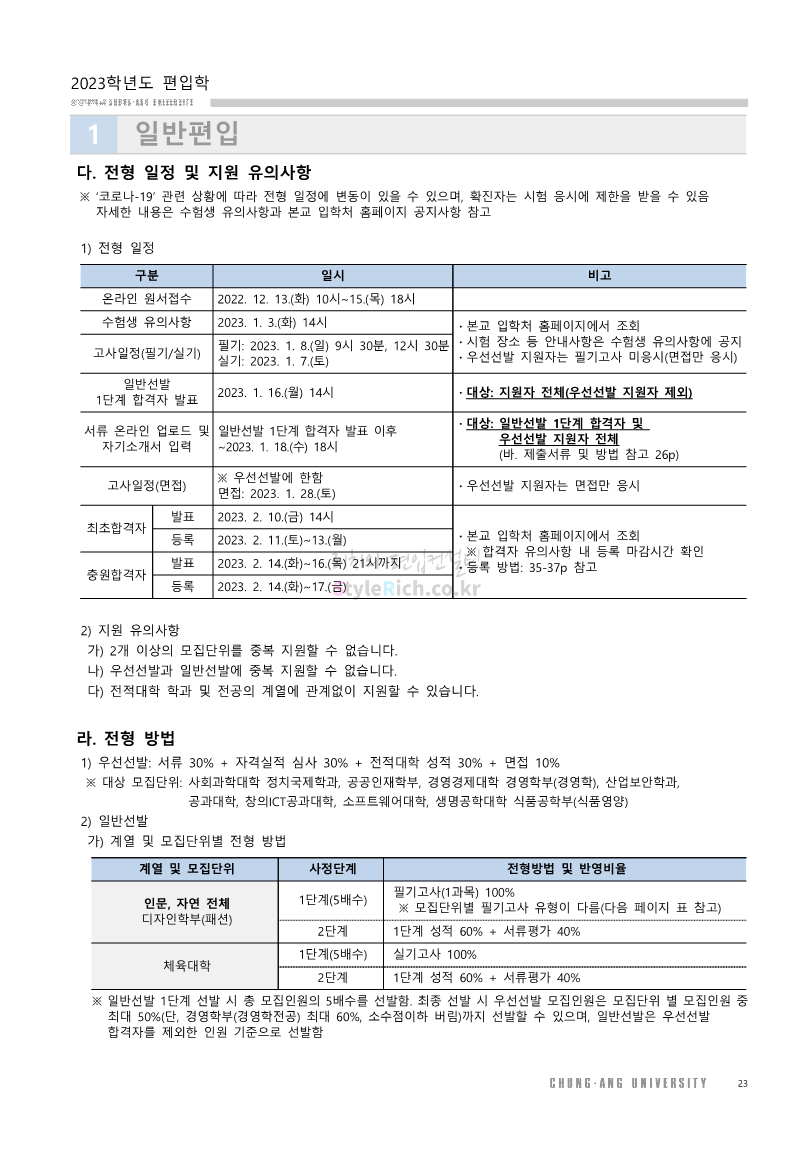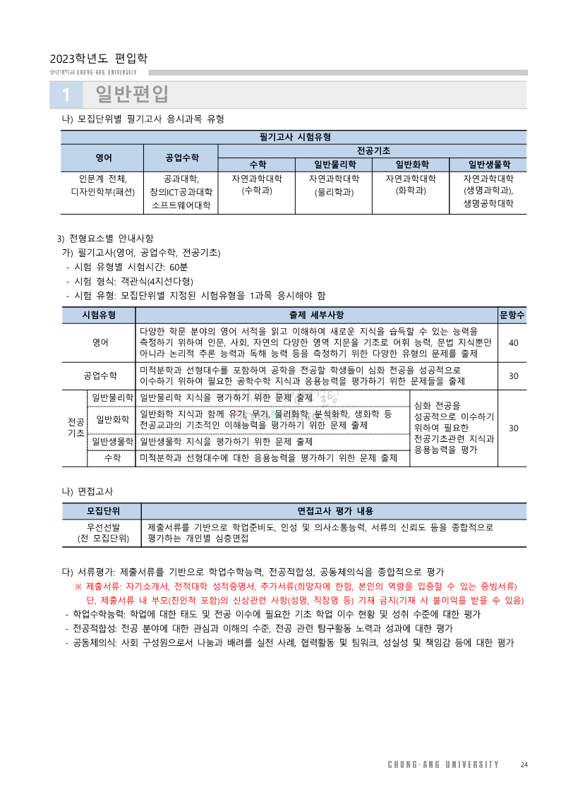 중앙대 편입 2023학년도 모집요강 간편하게 보자! 2022.12.05 23:45 편입 모집요강/2023학년도 모집요강 2023학년도 중앙대 편입 모집요강(2022.12.14 기준)을 간편하게 확인하세요. * 최종 모집요강 발표 이후에도 내용의 일부가 변경될 수 있으니 지원 전 반드시 중앙대 입학처에서 확인 바랍니다. 중앙대 편입 최신 모집요강 확인하기 <출처: 중앙대> 공유하기 게시글 관리 리치의 편입컨설팅 저작자표시 비영리 변경금지 (새창열림) '편입 모집요강 > 2023학년도 모집요강' 카테고리의 다른 글 경북대 편입 2023학년도 모집요강 간편하게 보자! (0) 2022.12.06 홍익대 편입 2023학년도 모집요강 간편하게 보자! (0) 2022.12.05 숙명여대 편입 2023학년도 모집요강 간편하게 보자! (0) 2022.12.05 대구가톨릭대 편입 2023학년도 모집요강 간편하게 보자! (0) 2022.12.03 인하대 편입 2023학년도 모집요강 간편하게 보자! (0) 2022.12.03 댓글 공유하기 다른 글 댓글 이 글 공유하기 구독하기 구독하기 카카오톡 카카오톡 라인 라인 트위터 트위터 Facebook Facebook 카카오스토리 카카오스토리 밴드 밴드 네이버 블로그 네이버 블로그 Pocket Pocket Evernote Evernote 다른 글 경북대 편입 2023학년도 모집요강 간편하게 보자! 경북대 편입 2023학년도 모집요강 간편하게 보자! 2022.12.06 홍익대 편입 2023학년도 모집요강 간편하게 보자! 홍익대 편입 2023학년도 모집요강 간편하게 보자! 2022.12.05 숙명여대 편입 2023학년도 모집요강 간편하게 보자! 숙명여대 편입 2023학년도 모집요강 간편하게 보자! 2022.12.05 대구가톨릭대 편입 2023학년도 모집요강 간편하게 보자! 대구가톨릭대 편입 2023학년도 모집요강 간편하게 보자! 2022.12.03 다른 글 더 둘러보기