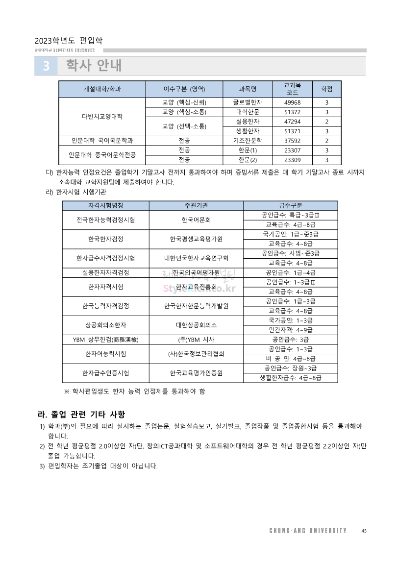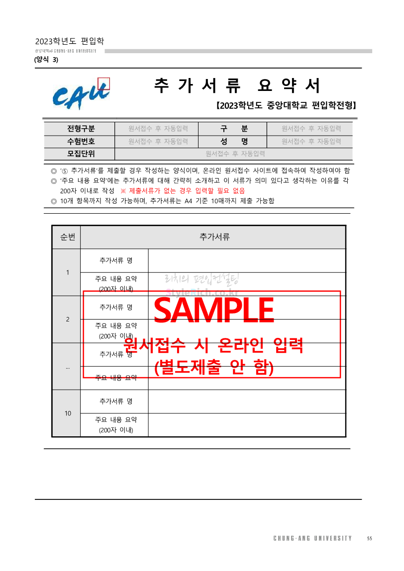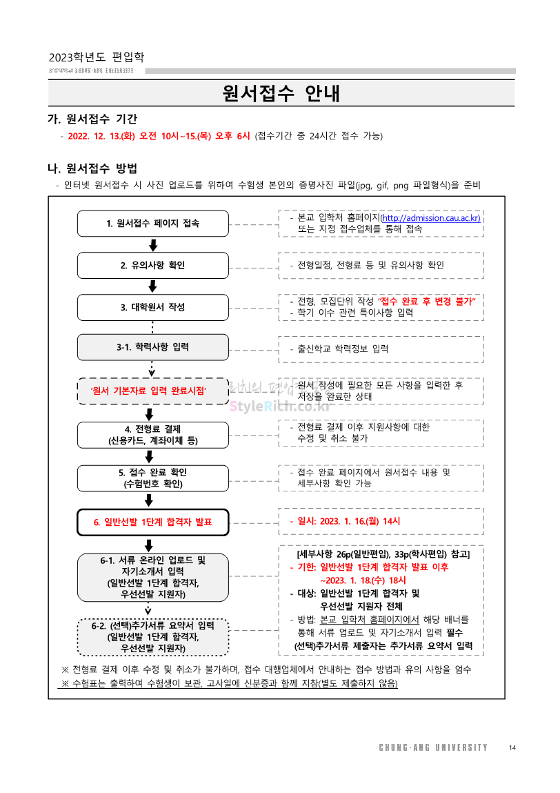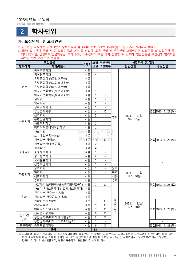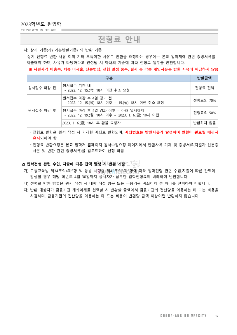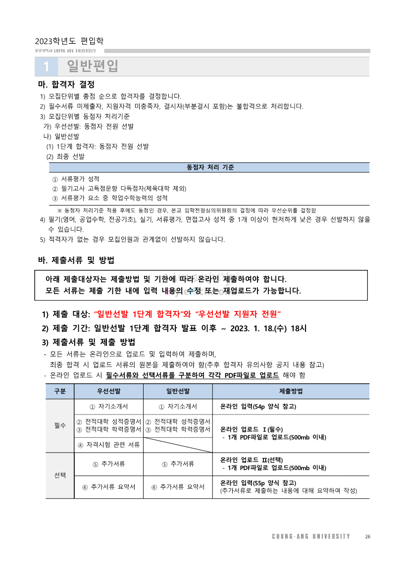 중앙대 편입 2023학년도 모집요강 간편하게 보자! 2022.12.05 23:45 편입 모집요강/2023학년도 모집요강 2023학년도 중앙대 편입 모집요강(2022.12.14 기준)을 간편하게 확인하세요. * 최종 모집요강 발표 이후에도 내용의 일부가 변경될 수 있으니 지원 전 반드시 중앙대 입학처에서 확인 바랍니다. 중앙대 편입 최신 모집요강 확인하기 <출처: 중앙대> 공유하기 게시글 관리 리치의 편입컨설팅 저작자표시 비영리 변경금지 (새창열림) '편입 모집요강 > 2023학년도 모집요강' 카테고리의 다른 글 경북대 편입 2023학년도 모집요강 간편하게 보자! (0) 2022.12.06 홍익대 편입 2023학년도 모집요강 간편하게 보자! (0) 2022.12.05 숙명여대 편입 2023학년도 모집요강 간편하게 보자! (0) 2022.12.05 대구가톨릭대 편입 2023학년도 모집요강 간편하게 보자! (0) 2022.12.03 인하대 편입 2023학년도 모집요강 간편하게 보자! (0) 2022.12.03 댓글 공유하기 다른 글 댓글 이 글 공유하기 구독하기 구독하기 카카오톡 카카오톡 라인 라인 트위터 트위터 Facebook Facebook 카카오스토리 카카오스토리 밴드 밴드 네이버 블로그 네이버 블로그 Pocket Pocket Evernote Evernote 다른 글 경북대 편입 2023학년도 모집요강 간편하게 보자! 경북대 편입 2023학년도 모집요강 간편하게 보자! 2022.12.06 홍익대 편입 2023학년도 모집요강 간편하게 보자! 홍익대 편입 2023학년도 모집요강 간편하게 보자! 2022.12.05 숙명여대 편입 2023학년도 모집요강 간편하게 보자! 숙명여대 편입 2023학년도 모집요강 간편하게 보자! 2022.12.05 대구가톨릭대 편입 2023학년도 모집요강 간편하게 보자! 대구가톨릭대 편입 2023학년도 모집요강 간편하게 보자! 2022.12.03 다른 글 더 둘러보기