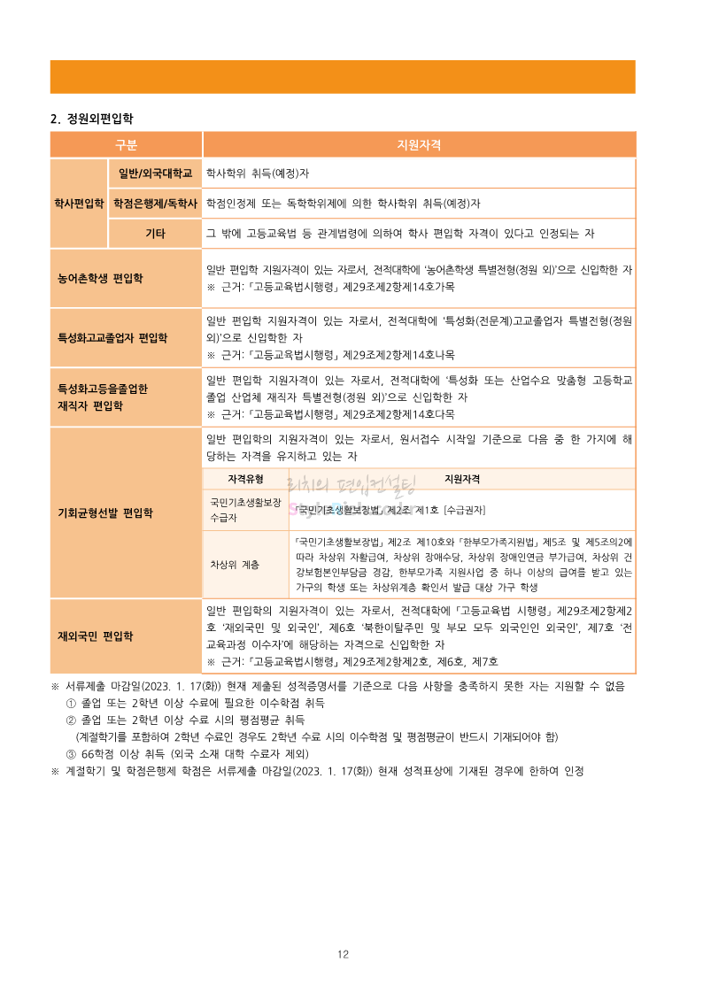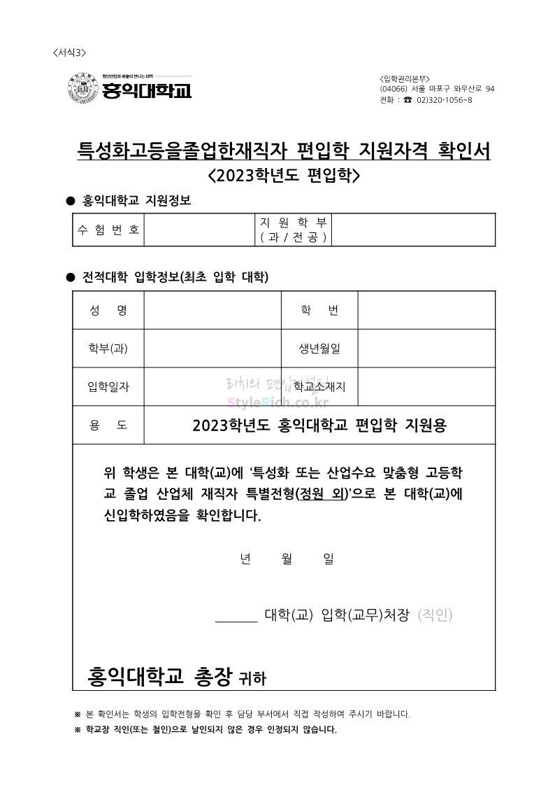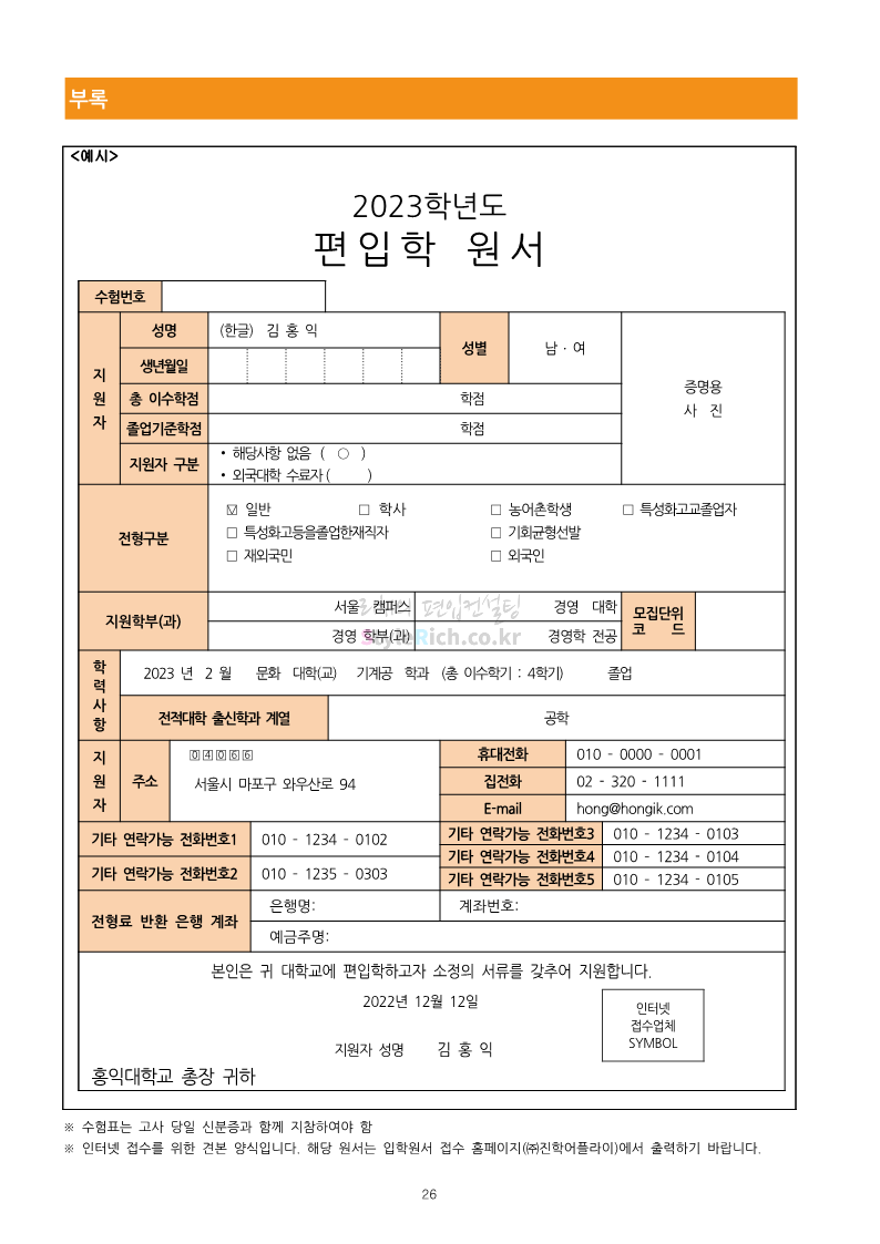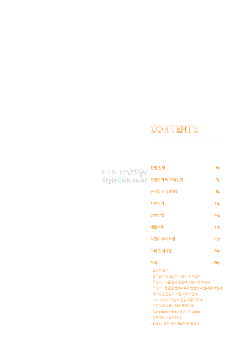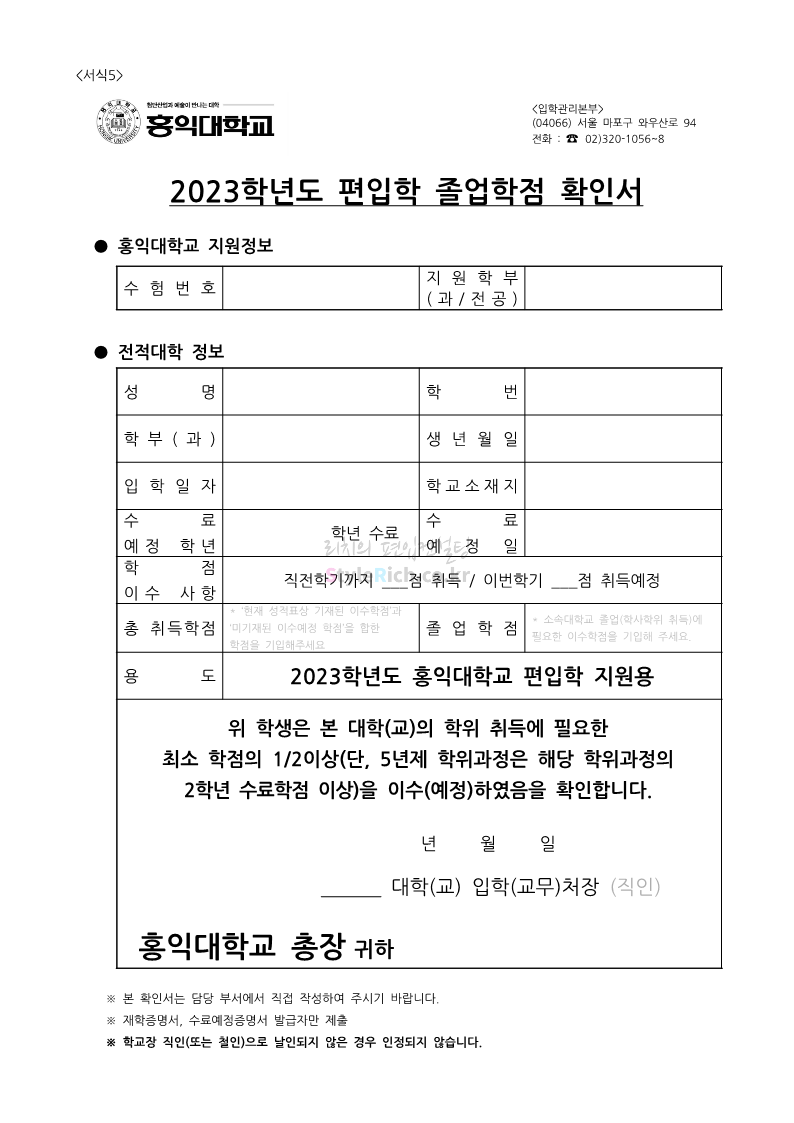 홍익대 편입 2023학년도 모집요강 간편하게 보자! 2022.12.05 23:58 편입 모집요강/2023학년도 모집요강 2023학년도 홍익대 편입 모집요강(2022.12.05 기준)을 간편하게 확인하세요. * 최종 모집요강 발표 이후에도 내용의 일부가 변경될 수 있으니 지원 전 반드시 홍익대 입학처에서 확인 바랍니다. 홍익대 편입 최신 모집요강 확인하기 <출처: 홍익대> 공유하기 게시글 관리 리치의 편입컨설팅 저작자표시 비영리 변경금지 (새창열림) '편입 모집요강 > 2023학년도 모집요강' 카테고리의 다른 글 원광대 편입 2023학년도 모집요강 간편하게 보자! (0) 2022.12.06 경북대 편입 2023학년도 모집요강 간편하게 보자! (0) 2022.12.06 중앙대 편입 2023학년도 모집요강 간편하게 보자! (0) 2022.12.05 숙명여대 편입 2023학년도 모집요강 간편하게 보자! (0) 2022.12.05 대구가톨릭대 편입 2023학년도 모집요강 간편하게 보자! (0) 2022.12.03 댓글 공유하기 다른 글 댓글 이 글 공유하기 구독하기 구독하기 카카오톡 카카오톡 라인 라인 트위터 트위터 Facebook Facebook 카카오스토리 카카오스토리 밴드 밴드 네이버 블로그 네이버 블로그 Pocket Pocket Evernote Evernote 다른 글 원광대 편입 2023학년도 모집요강 간편하게 보자! 원광대 편입 2023학년도 모집요강 간편하게 보자! 2022.12.06 경북대 편입 2023학년도 모집요강 간편하게 보자! 경북대 편입 2023학년도 모집요강 간편하게 보자! 2022.12.06 중앙대 편입 2023학년도 모집요강 간편하게 보자! 중앙대 편입 2023학년도 모집요강 간편하게 보자! 2022.12.05 숙명여대 편입 2023학년도 모집요강 간편하게 보자! 숙명여대 편입 2023학년도 모집요강 간편하게 보자! 2022.12.05 다른 글 더 둘러보기