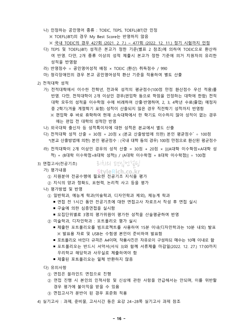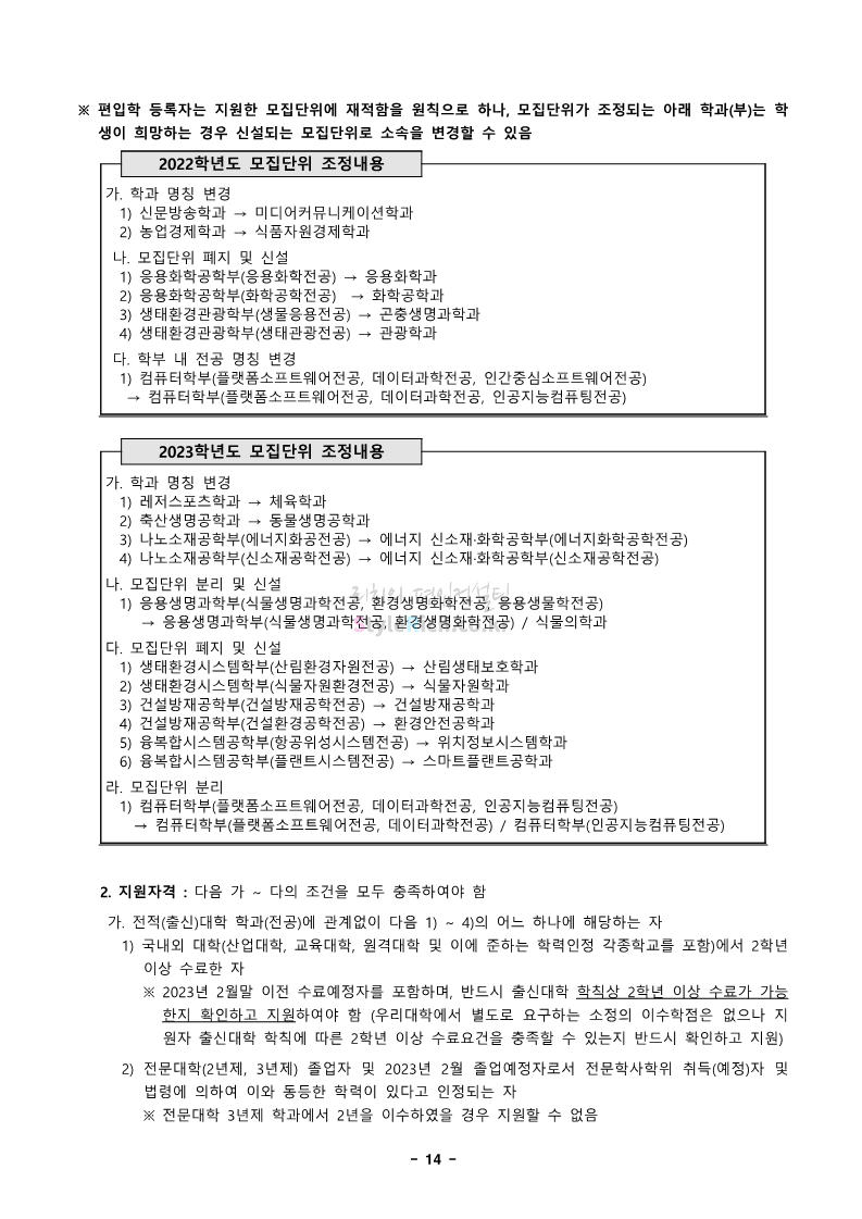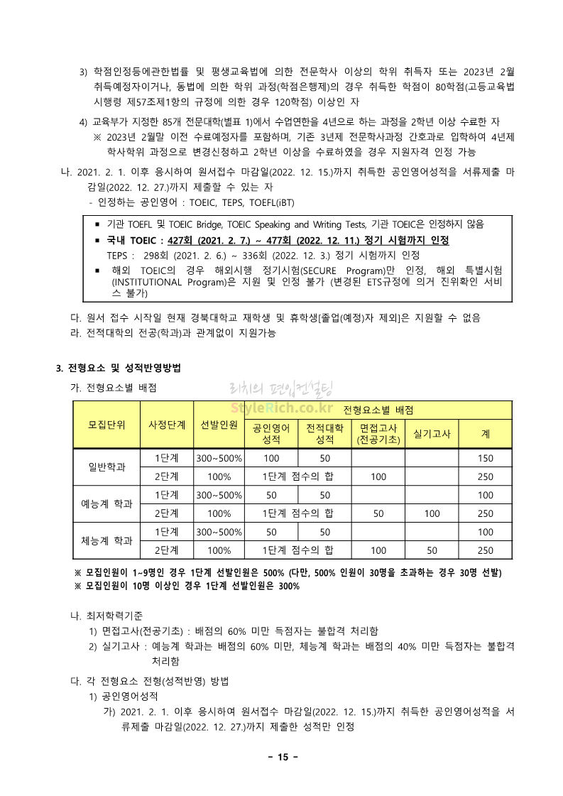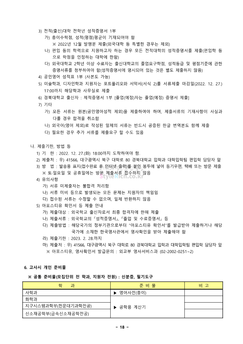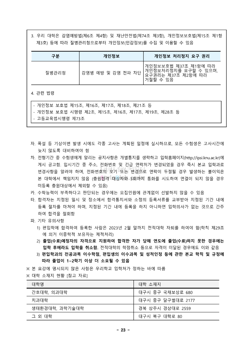 경북대 편입 2023학년도 모집요강 간편하게 보자! 2022.12.06 00:13 편입 모집요강/2023학년도 모집요강 2023학년도 경북대 편입 모집요강(2022.12.05 기준)을 간편하게 확인하세요. * 최종 모집요강 발표 이후에도 내용의 일부가 변경될 수 있으니 지원 전 반드시 경북대 입학처에서 확인 바랍니다. 경북대 편입 최신 모집요강 확인하기 <출처: 경북대> 공유하기 게시글 관리 리치의 편입컨설팅 저작자표시 비영리 변경금지 (새창열림) '편입 모집요강 > 2023학년도 모집요강' 카테고리의 다른 글 전남대 편입 2023학년도 모집요강 간편하게 보자! (0) 2022.12.06 원광대 편입 2023학년도 모집요강 간편하게 보자! (0) 2022.12.06 홍익대 편입 2023학년도 모집요강 간편하게 보자! (0) 2022.12.05 중앙대 편입 2023학년도 모집요강 간편하게 보자! (0) 2022.12.05 숙명여대 편입 2023학년도 모집요강 간편하게 보자! (0) 2022.12.05 댓글 공유하기 다른 글 댓글 이 글 공유하기 구독하기 구독하기 카카오톡 카카오톡 라인 라인 트위터 트위터 Facebook Facebook 카카오스토리 카카오스토리 밴드 밴드 네이버 블로그 네이버 블로그 Pocket Pocket Evernote Evernote 다른 글 전남대 편입 2023학년도 모집요강 간편하게 보자! 전남대 편입 2023학년도 모집요강 간편하게 보자! 2022.12.06 원광대 편입 2023학년도 모집요강 간편하게 보자! 원광대 편입 2023학년도 모집요강 간편하게 보자! 2022.12.06 홍익대 편입 2023학년도 모집요강 간편하게 보자! 홍익대 편입 2023학년도 모집요강 간편하게 보자! 2022.12.05 중앙대 편입 2023학년도 모집요강 간편하게 보자! 중앙대 편입 2023학년도 모집요강 간편하게 보자! 2022.12.05 다른 글 더 둘러보기