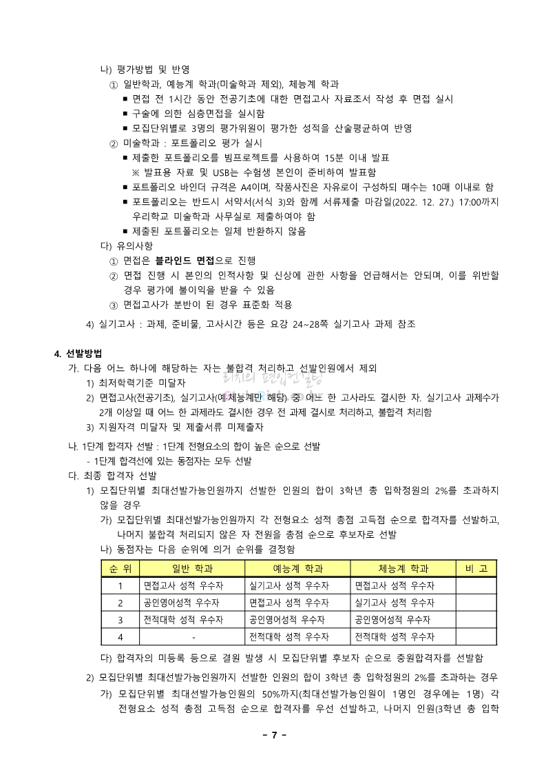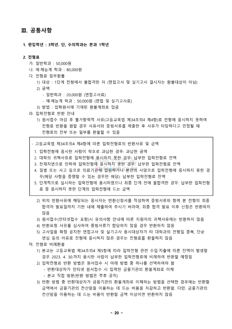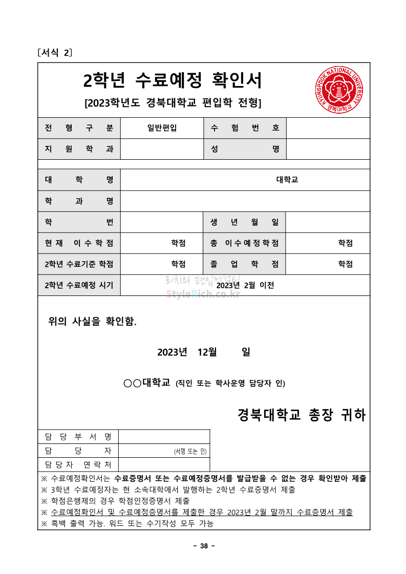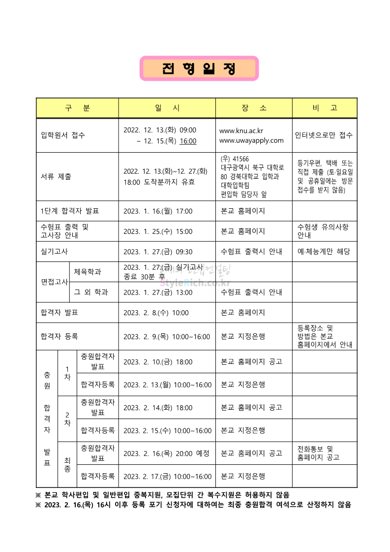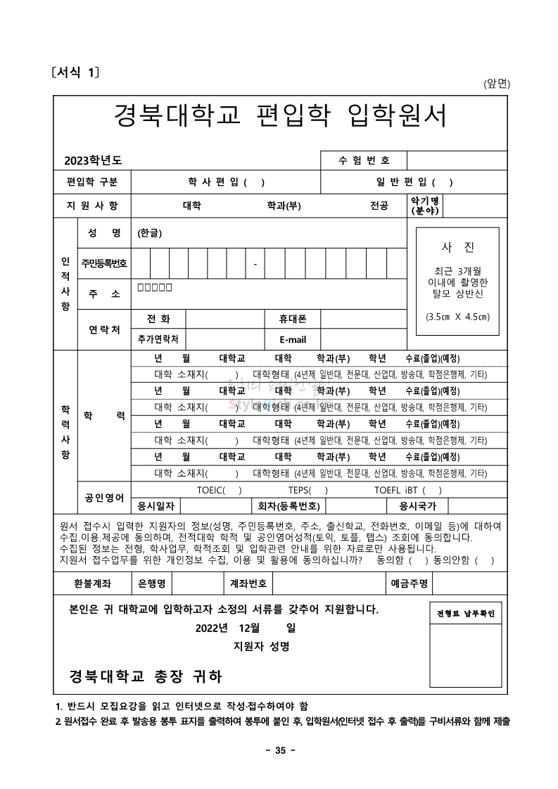 경북대 편입 2023학년도 모집요강 간편하게 보자! 2022.12.06 00:13 편입 모집요강/2023학년도 모집요강 2023학년도 경북대 편입 모집요강(2022.12.05 기준)을 간편하게 확인하세요. * 최종 모집요강 발표 이후에도 내용의 일부가 변경될 수 있으니 지원 전 반드시 경북대 입학처에서 확인 바랍니다. 경북대 편입 최신 모집요강 확인하기 <출처: 경북대> 공유하기 게시글 관리 리치의 편입컨설팅 저작자표시 비영리 변경금지 (새창열림) '편입 모집요강 > 2023학년도 모집요강' 카테고리의 다른 글 전남대 편입 2023학년도 모집요강 간편하게 보자! (0) 2022.12.06 원광대 편입 2023학년도 모집요강 간편하게 보자! (0) 2022.12.06 홍익대 편입 2023학년도 모집요강 간편하게 보자! (0) 2022.12.05 중앙대 편입 2023학년도 모집요강 간편하게 보자! (0) 2022.12.05 숙명여대 편입 2023학년도 모집요강 간편하게 보자! (0) 2022.12.05 댓글 공유하기 다른 글 댓글 이 글 공유하기 구독하기 구독하기 카카오톡 카카오톡 라인 라인 트위터 트위터 Facebook Facebook 카카오스토리 카카오스토리 밴드 밴드 네이버 블로그 네이버 블로그 Pocket Pocket Evernote Evernote 다른 글 전남대 편입 2023학년도 모집요강 간편하게 보자! 전남대 편입 2023학년도 모집요강 간편하게 보자! 2022.12.06 원광대 편입 2023학년도 모집요강 간편하게 보자! 원광대 편입 2023학년도 모집요강 간편하게 보자! 2022.12.06 홍익대 편입 2023학년도 모집요강 간편하게 보자! 홍익대 편입 2023학년도 모집요강 간편하게 보자! 2022.12.05 중앙대 편입 2023학년도 모집요강 간편하게 보자! 중앙대 편입 2023학년도 모집요강 간편하게 보자! 2022.12.05 다른 글 더 둘러보기