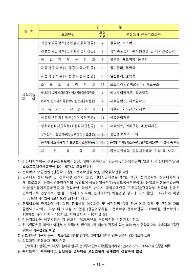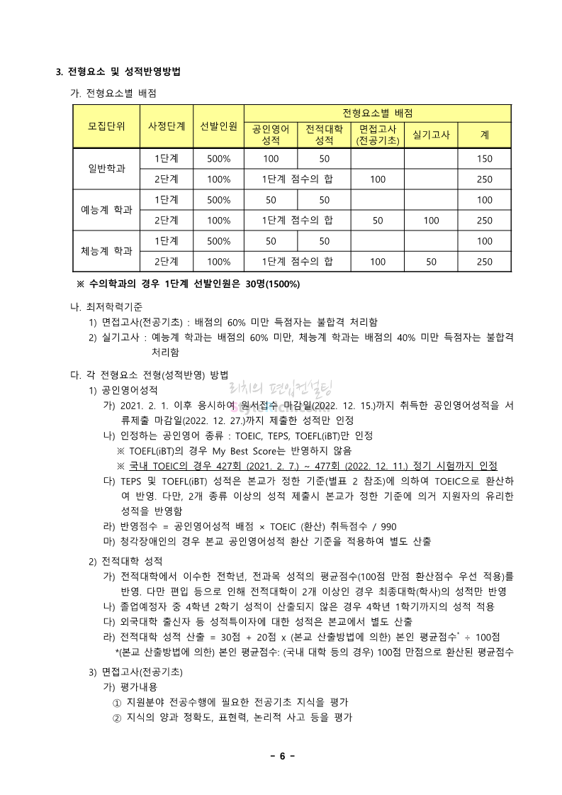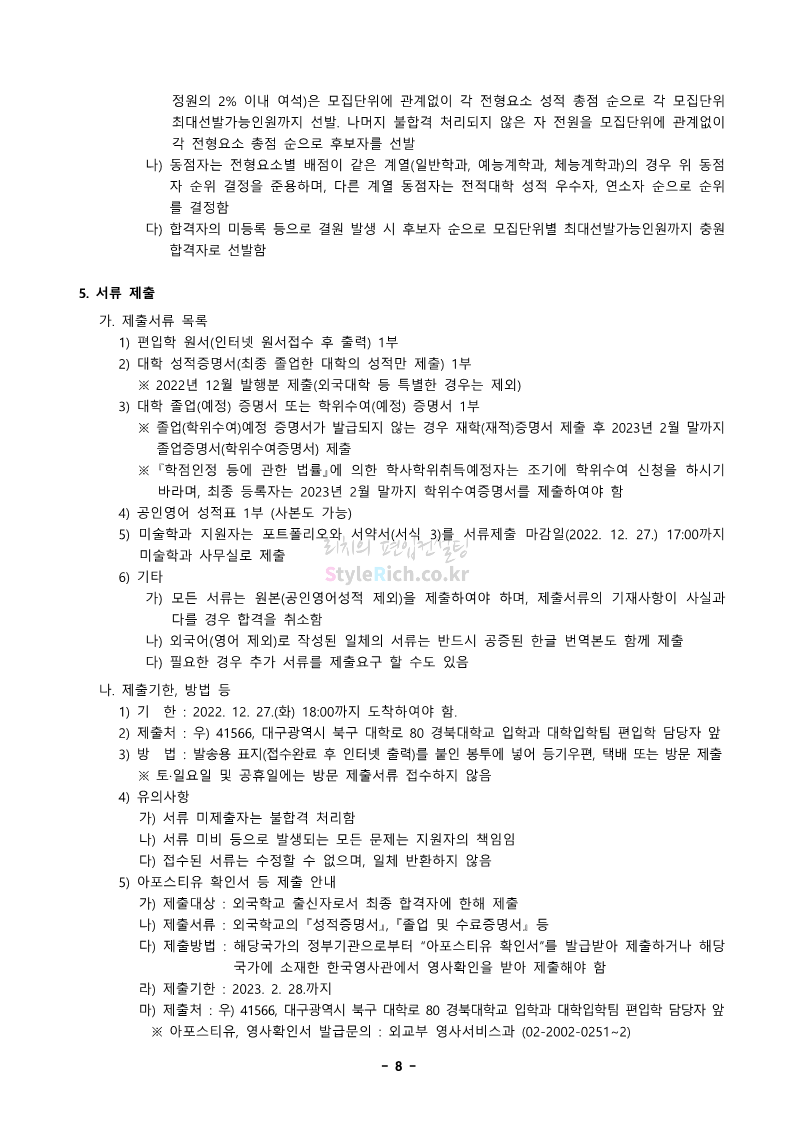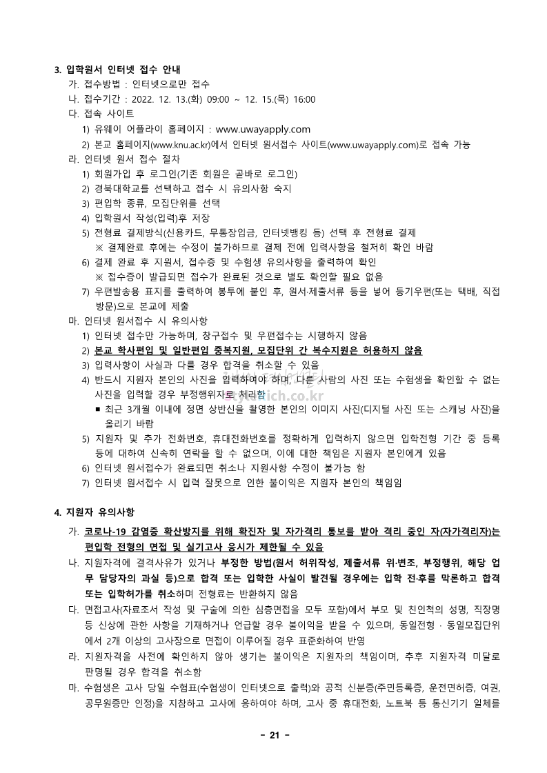 경북대 편입 2023학년도 모집요강 간편하게 보자! 2022.12.06 00:13 편입 모집요강/2023학년도 모집요강 2023학년도 경북대 편입 모집요강(2022.12.05 기준)을 간편하게 확인하세요. * 최종 모집요강 발표 이후에도 내용의 일부가 변경될 수 있으니 지원 전 반드시 경북대 입학처에서 확인 바랍니다. 경북대 편입 최신 모집요강 확인하기 <출처: 경북대> 공유하기 게시글 관리 리치의 편입컨설팅 저작자표시 비영리 변경금지 (새창열림) '편입 모집요강 > 2023학년도 모집요강' 카테고리의 다른 글 전남대 편입 2023학년도 모집요강 간편하게 보자! (0) 2022.12.06 원광대 편입 2023학년도 모집요강 간편하게 보자! (0) 2022.12.06 홍익대 편입 2023학년도 모집요강 간편하게 보자! (0) 2022.12.05 중앙대 편입 2023학년도 모집요강 간편하게 보자! (0) 2022.12.05 숙명여대 편입 2023학년도 모집요강 간편하게 보자! (0) 2022.12.05 댓글 공유하기 다른 글 댓글 이 글 공유하기 구독하기 구독하기 카카오톡 카카오톡 라인 라인 트위터 트위터 Facebook Facebook 카카오스토리 카카오스토리 밴드 밴드 네이버 블로그 네이버 블로그 Pocket Pocket Evernote Evernote 다른 글 전남대 편입 2023학년도 모집요강 간편하게 보자! 전남대 편입 2023학년도 모집요강 간편하게 보자! 2022.12.06 원광대 편입 2023학년도 모집요강 간편하게 보자! 원광대 편입 2023학년도 모집요강 간편하게 보자! 2022.12.06 홍익대 편입 2023학년도 모집요강 간편하게 보자! 홍익대 편입 2023학년도 모집요강 간편하게 보자! 2022.12.05 중앙대 편입 2023학년도 모집요강 간편하게 보자! 중앙대 편입 2023학년도 모집요강 간편하게 보자! 2022.12.05 다른 글 더 둘러보기