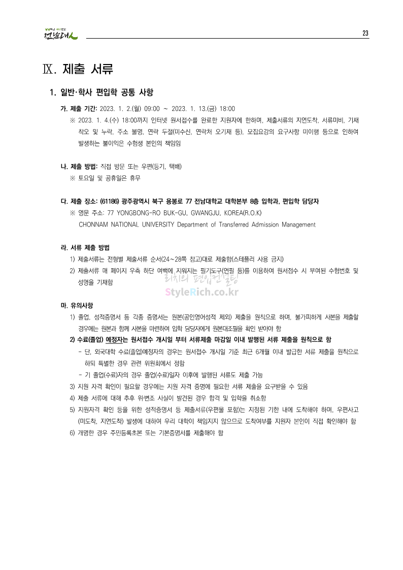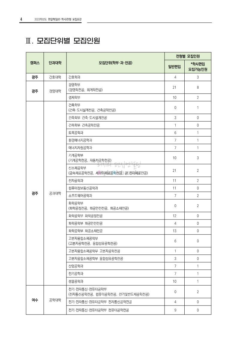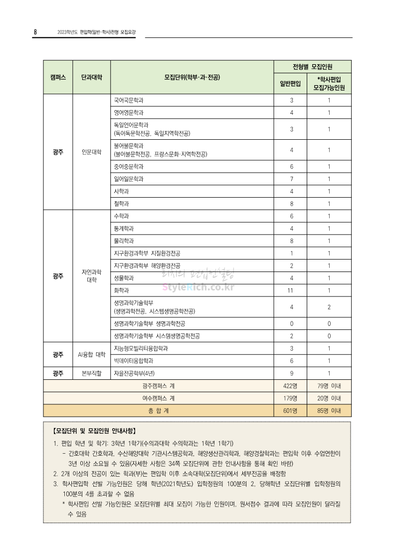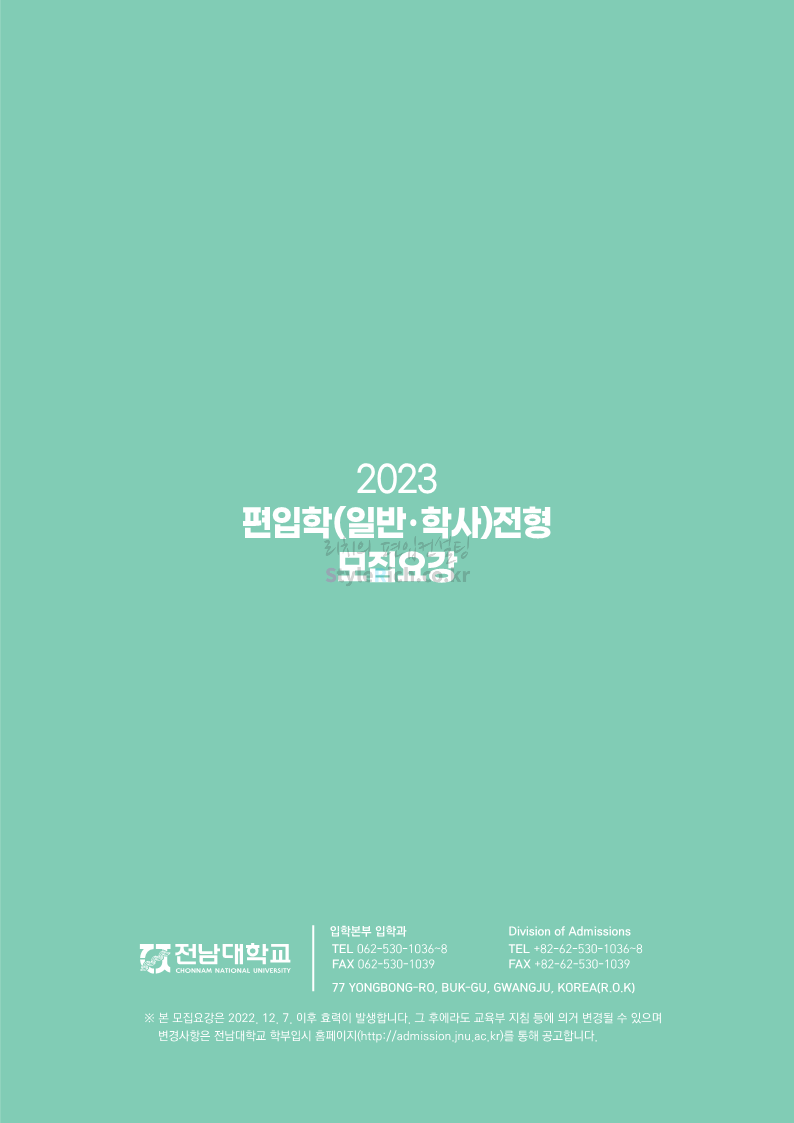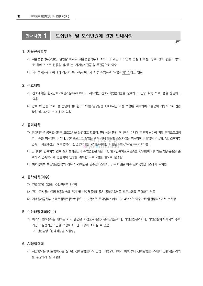 전남대 편입 2023학년도 모집요강 간편하게 보자! 2022.12.06 00:45 편입 모집요강/2023학년도 모집요강 2023학년도 전남대 편입 모집요강(2022.12.05 기준)을 간편하게 확인하세요. * 최종 모집요강 발표 이후에도 내용의 일부가 변경될 수 있으니 지원 전 반드시 전남대 입학처에서 확인 바랍니다. 전남대 편입 최신 모집요강 확인하기 <출처: 전남대> 공유하기 게시글 관리 리치의 편입컨설팅 저작자표시 비영리 변경금지 (새창열림) '편입 모집요강 > 2023학년도 모집요강' 카테고리의 다른 글 동덕여대 편입 2023학년도 모집요강 간편하게 보자! (0) 2022.12.06 충북대 편입 2023학년도 모집요강 간편하게 보자! (0) 2022.12.06 원광대 편입 2023학년도 모집요강 간편하게 보자! (0) 2022.12.06 경북대 편입 2023학년도 모집요강 간편하게 보자! (0) 2022.12.06 홍익대 편입 2023학년도 모집요강 간편하게 보자! (0) 2022.12.05 댓글 공유하기 다른 글 댓글 이 글 공유하기 구독하기 구독하기 카카오톡 카카오톡 라인 라인 트위터 트위터 Facebook Facebook 카카오스토리 카카오스토리 밴드 밴드 네이버 블로그 네이버 블로그 Pocket Pocket Evernote Evernote 다른 글 동덕여대 편입 2023학년도 모집요강 간편하게 보자! 동덕여대 편입 2023학년도 모집요강 간편하게 보자! 2022.12.06 충북대 편입 2023학년도 모집요강 간편하게 보자! 충북대 편입 2023학년도 모집요강 간편하게 보자! 2022.12.06 원광대 편입 2023학년도 모집요강 간편하게 보자! 원광대 편입 2023학년도 모집요강 간편하게 보자! 2022.12.06 경북대 편입 2023학년도 모집요강 간편하게 보자! 경북대 편입 2023학년도 모집요강 간편하게 보자! 2022.12.06 다른 글 더 둘러보기