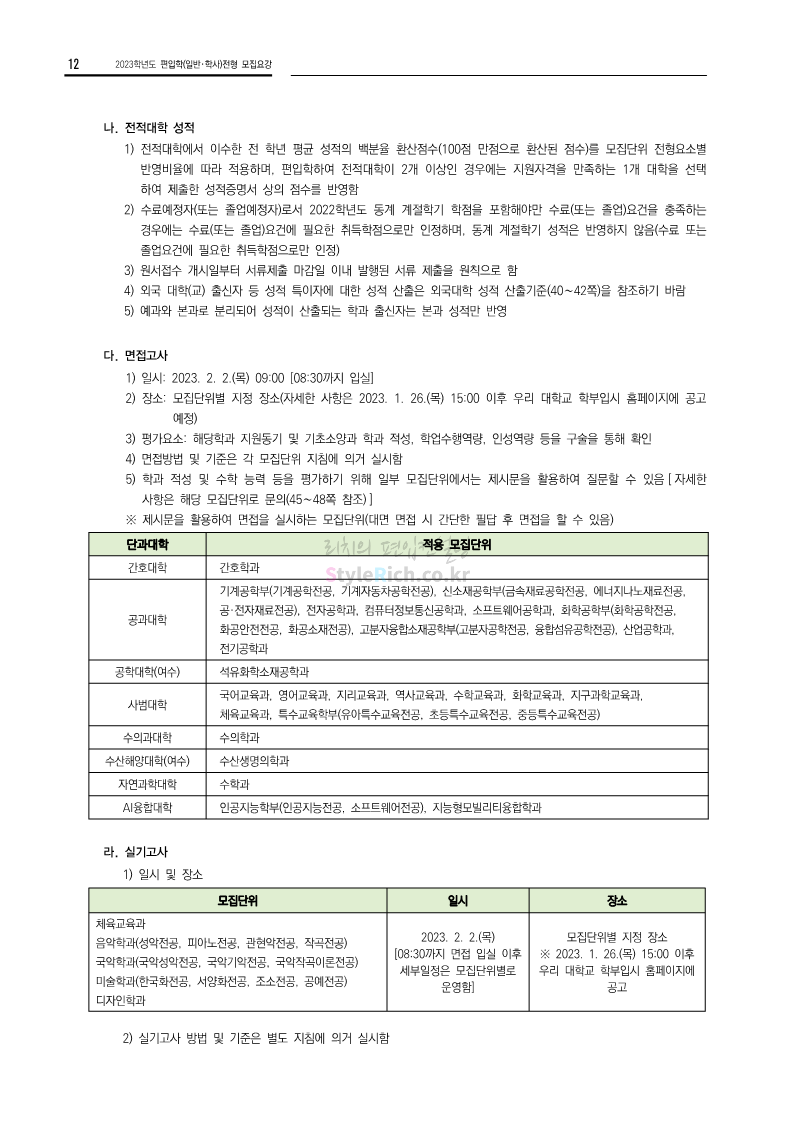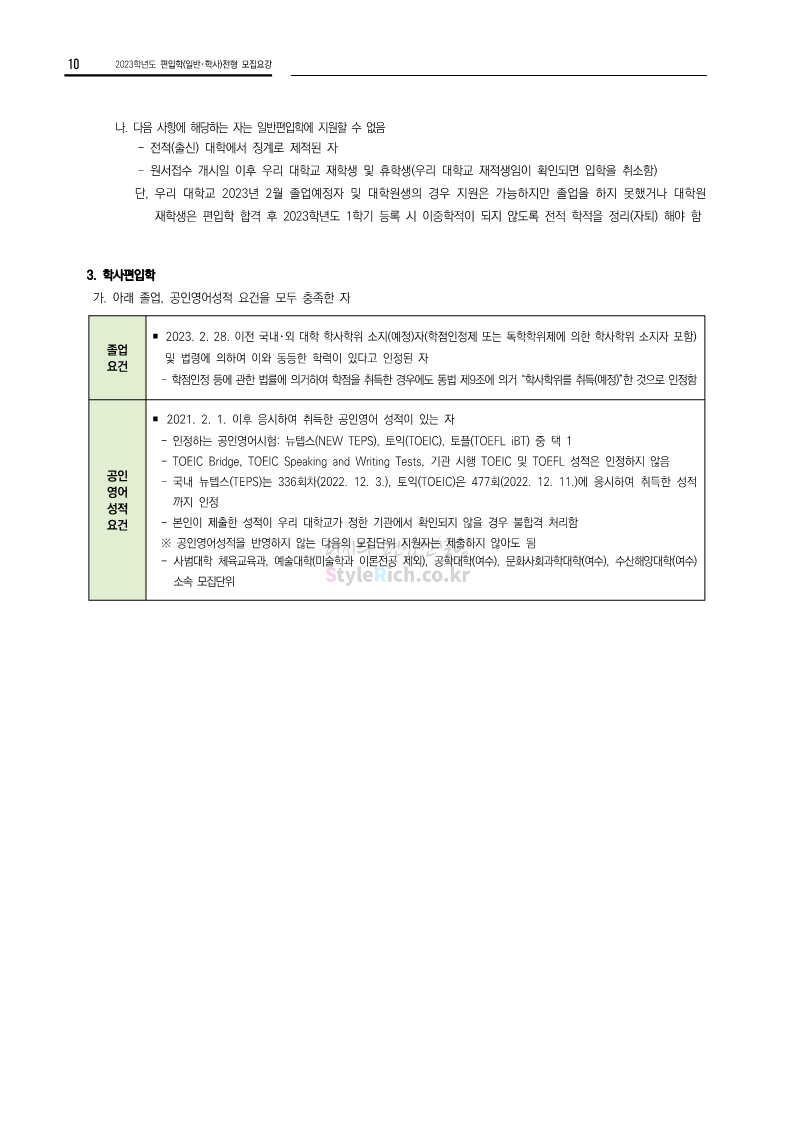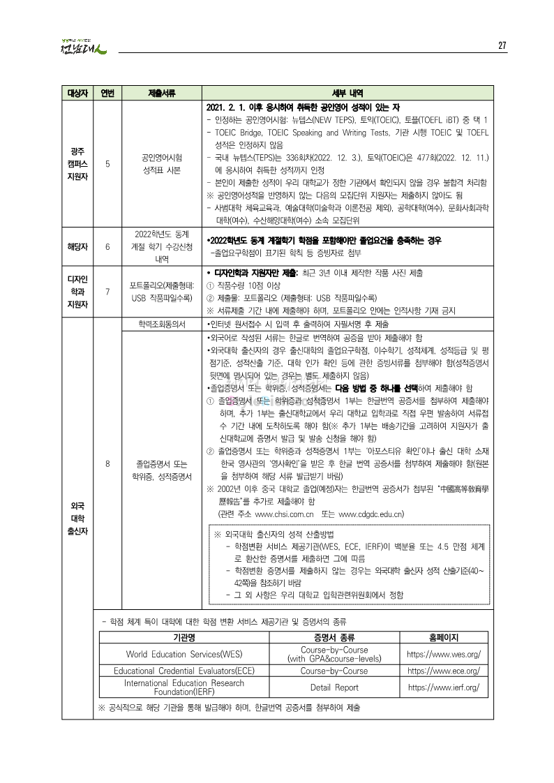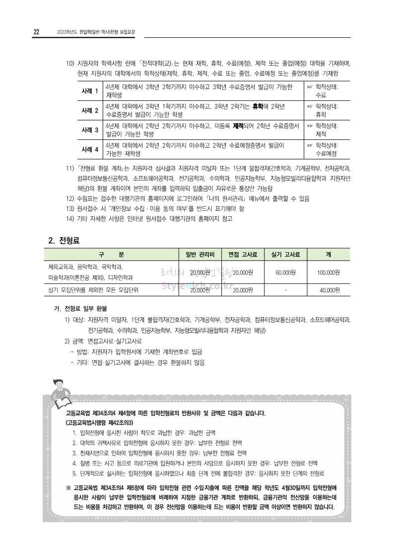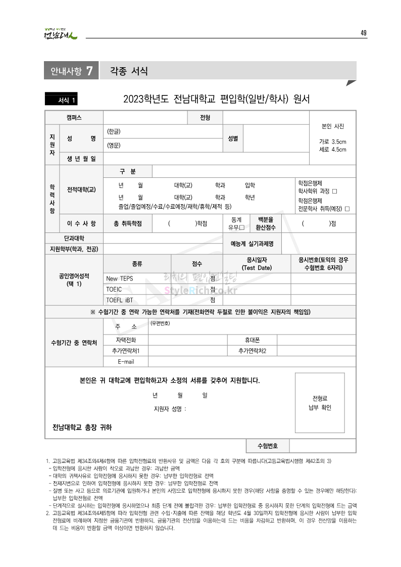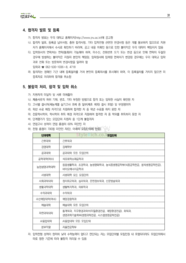 전남대 편입 2023학년도 모집요강 간편하게 보자! 2022.12.06 00:45 편입 모집요강/2023학년도 모집요강 2023학년도 전남대 편입 모집요강(2022.12.05 기준)을 간편하게 확인하세요. * 최종 모집요강 발표 이후에도 내용의 일부가 변경될 수 있으니 지원 전 반드시 전남대 입학처에서 확인 바랍니다. 전남대 편입 최신 모집요강 확인하기 <출처: 전남대> 공유하기 게시글 관리 리치의 편입컨설팅 저작자표시 비영리 변경금지 (새창열림) '편입 모집요강 > 2023학년도 모집요강' 카테고리의 다른 글 동덕여대 편입 2023학년도 모집요강 간편하게 보자! (0) 2022.12.06 충북대 편입 2023학년도 모집요강 간편하게 보자! (0) 2022.12.06 원광대 편입 2023학년도 모집요강 간편하게 보자! (0) 2022.12.06 경북대 편입 2023학년도 모집요강 간편하게 보자! (0) 2022.12.06 홍익대 편입 2023학년도 모집요강 간편하게 보자! (0) 2022.12.05 댓글 공유하기 다른 글 댓글 이 글 공유하기 구독하기 구독하기 카카오톡 카카오톡 라인 라인 트위터 트위터 Facebook Facebook 카카오스토리 카카오스토리 밴드 밴드 네이버 블로그 네이버 블로그 Pocket Pocket Evernote Evernote 다른 글 동덕여대 편입 2023학년도 모집요강 간편하게 보자! 동덕여대 편입 2023학년도 모집요강 간편하게 보자! 2022.12.06 충북대 편입 2023학년도 모집요강 간편하게 보자! 충북대 편입 2023학년도 모집요강 간편하게 보자! 2022.12.06 원광대 편입 2023학년도 모집요강 간편하게 보자! 원광대 편입 2023학년도 모집요강 간편하게 보자! 2022.12.06 경북대 편입 2023학년도 모집요강 간편하게 보자! 경북대 편입 2023학년도 모집요강 간편하게 보자! 2022.12.06 다른 글 더 둘러보기