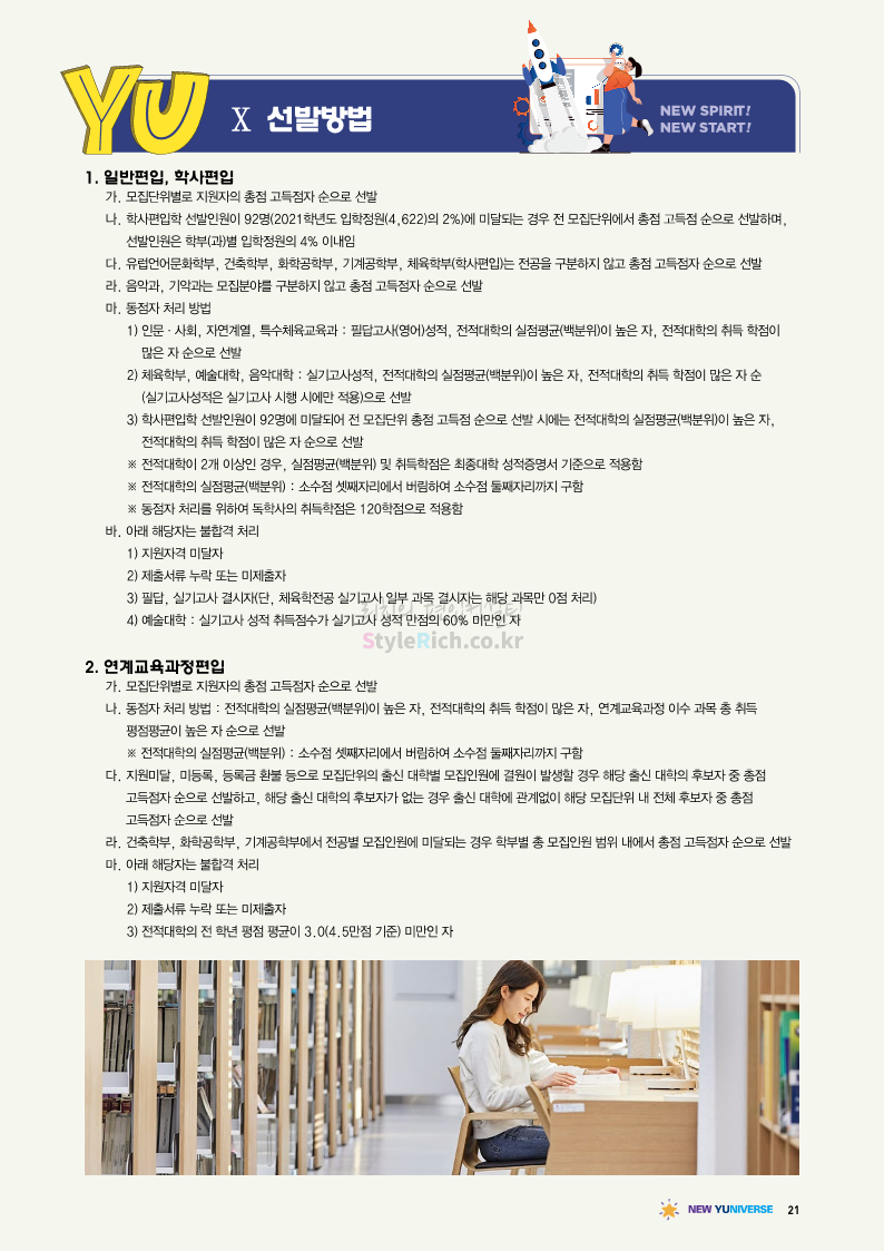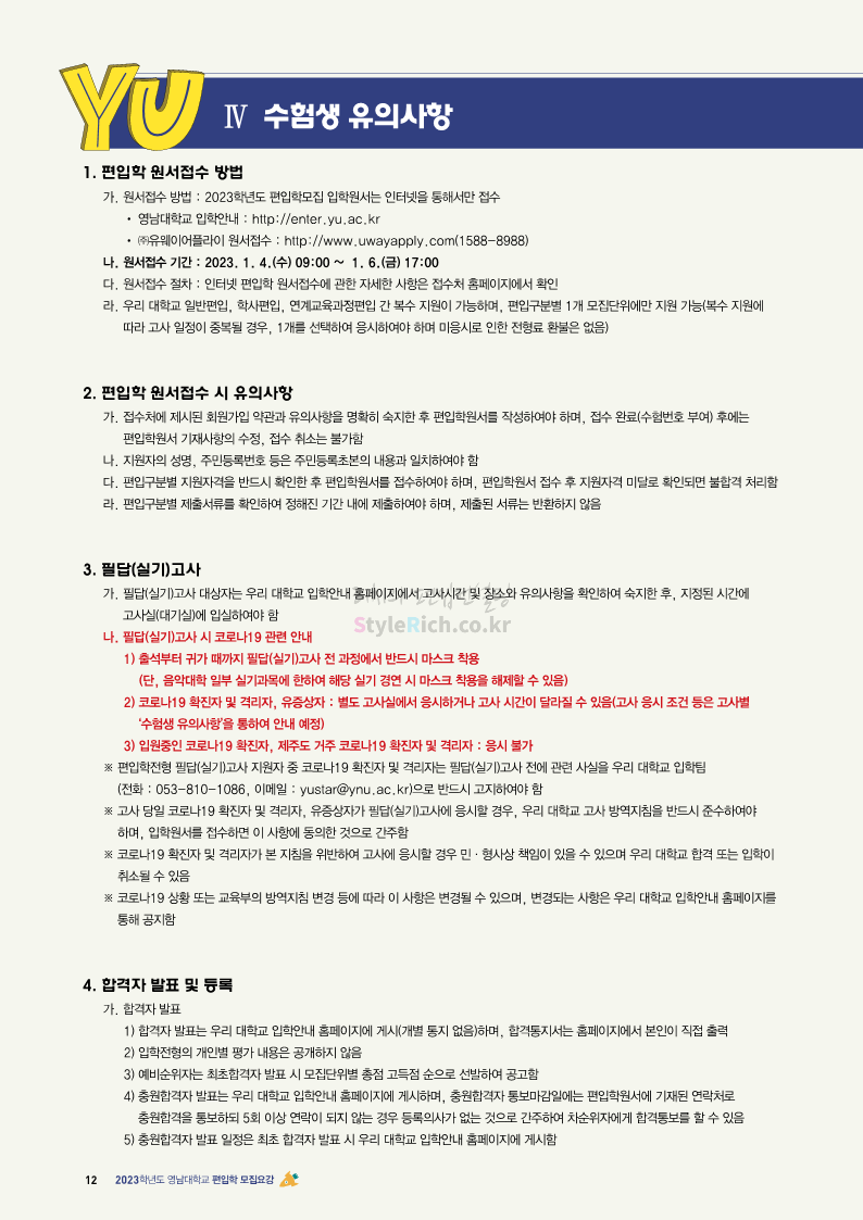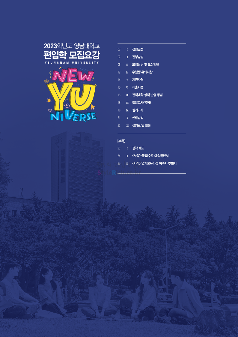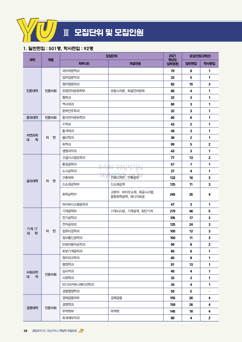 영남대 편입 2023학년도 모집요강 간편하게 보자! 2022.12.06 23:34 편입 모집요강/2023학년도 모집요강 2023학년도 영남대 편입 모집요강(2022.12.06 기준)을 간편하게 확인하세요. * 최종 모집요강 발표 이후에도 내용의 일부가 변경될 수 있으니 지원 전 반드시 영남대 입학처에서 확인 바랍니다. 영남대 편입 최신 모집요강 확인하기 <출처: 영남대> 공유하기 게시글 관리 리치의 편입컨설팅 저작자표시 비영리 변경금지 (새창열림) '편입 모집요강 > 2023학년도 모집요강' 카테고리의 다른 글 동국대 편입 2023학년도 모집요강 간편하게 보자! (0) 2022.12.07 인제대 편입 2023학년도 모집요강 간편하게 보자! (0) 2022.12.06 성균관대 편입 2023학년도 모집요강 간편하게 보자! (0) 2022.12.06 서강대 편입 2023학년도 모집요강 간편하게 보자! (0) 2022.12.06 동덕여대 편입 2023학년도 모집요강 간편하게 보자! (0) 2022.12.06 댓글 공유하기 다른 글 댓글 이 글 공유하기 구독하기 구독하기 카카오톡 카카오톡 라인 라인 트위터 트위터 Facebook Facebook 카카오스토리 카카오스토리 밴드 밴드 네이버 블로그 네이버 블로그 Pocket Pocket Evernote Evernote 다른 글 동국대 편입 2023학년도 모집요강 간편하게 보자! 동국대 편입 2023학년도 모집요강 간편하게 보자! 2022.12.07 인제대 편입 2023학년도 모집요강 간편하게 보자! 인제대 편입 2023학년도 모집요강 간편하게 보자! 2022.12.06 성균관대 편입 2023학년도 모집요강 간편하게 보자! 성균관대 편입 2023학년도 모집요강 간편하게 보자! 2022.12.06 서강대 편입 2023학년도 모집요강 간편하게 보자! 서강대 편입 2023학년도 모집요강 간편하게 보자! 2022.12.06 다른 글 더 둘러보기