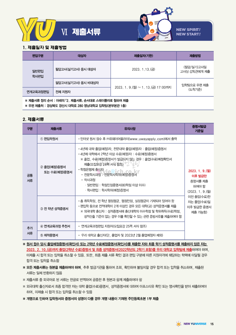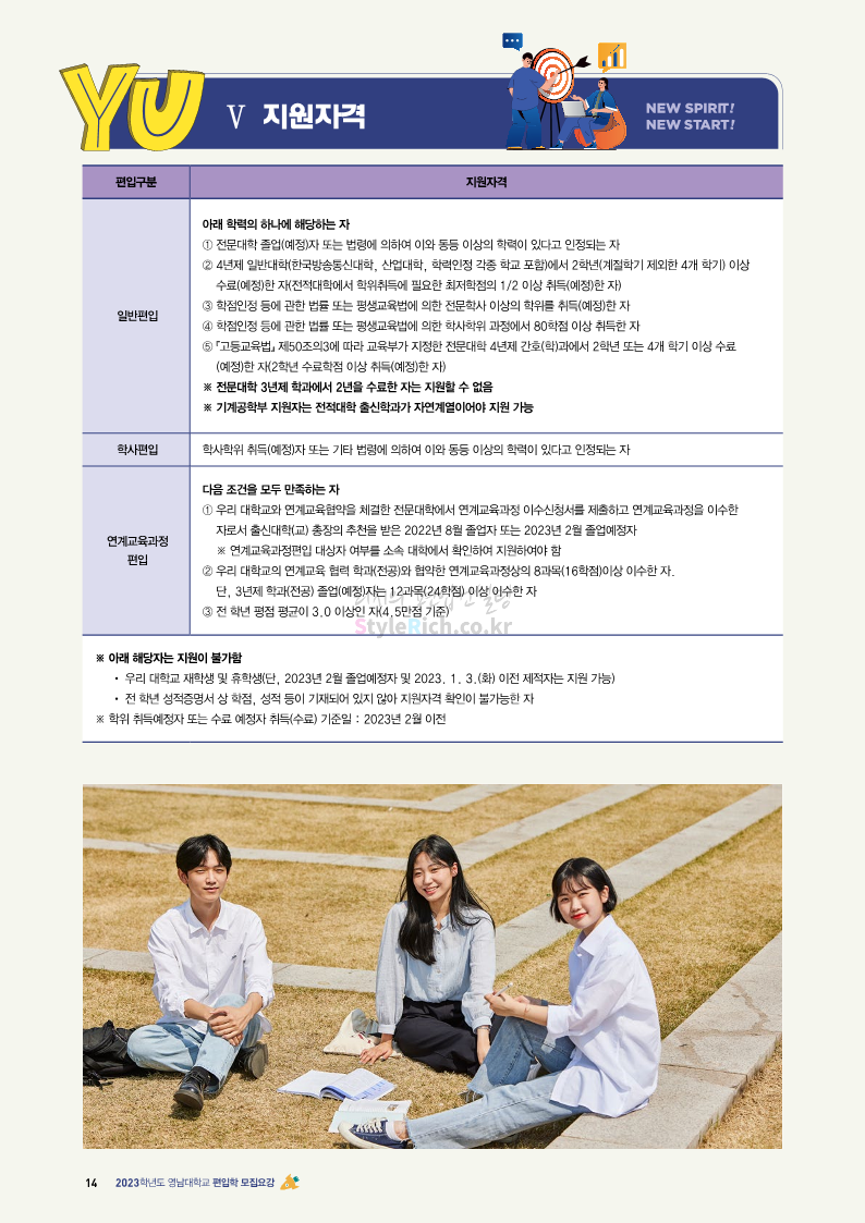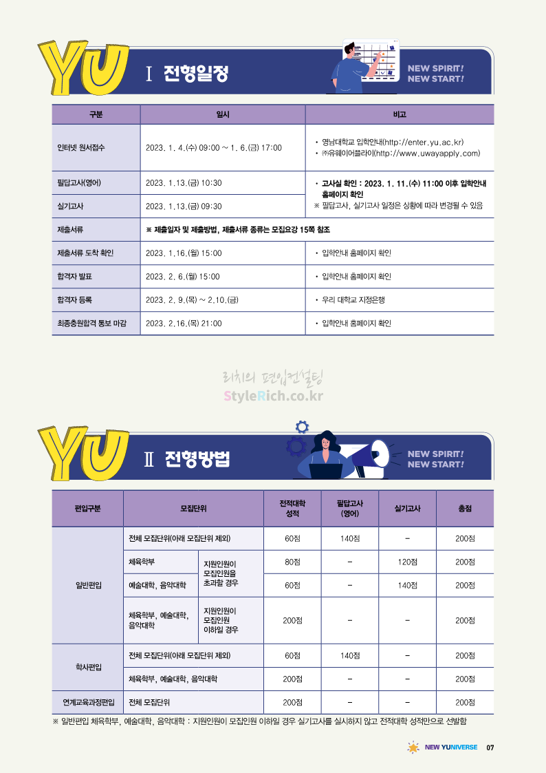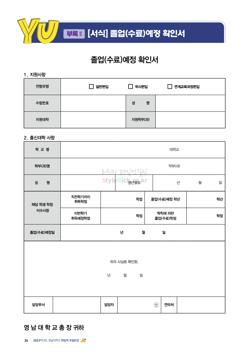 영남대 편입 2023학년도 모집요강 간편하게 보자! 2022.12.06 23:34 편입 모집요강/2023학년도 모집요강 2023학년도 영남대 편입 모집요강(2022.12.06 기준)을 간편하게 확인하세요. * 최종 모집요강 발표 이후에도 내용의 일부가 변경될 수 있으니 지원 전 반드시 영남대 입학처에서 확인 바랍니다. 영남대 편입 최신 모집요강 확인하기 <출처: 영남대> 공유하기 게시글 관리 리치의 편입컨설팅 저작자표시 비영리 변경금지 (새창열림) '편입 모집요강 > 2023학년도 모집요강' 카테고리의 다른 글 동국대 편입 2023학년도 모집요강 간편하게 보자! (0) 2022.12.07 인제대 편입 2023학년도 모집요강 간편하게 보자! (0) 2022.12.06 성균관대 편입 2023학년도 모집요강 간편하게 보자! (0) 2022.12.06 서강대 편입 2023학년도 모집요강 간편하게 보자! (0) 2022.12.06 동덕여대 편입 2023학년도 모집요강 간편하게 보자! (0) 2022.12.06 댓글 공유하기 다른 글 댓글 이 글 공유하기 구독하기 구독하기 카카오톡 카카오톡 라인 라인 트위터 트위터 Facebook Facebook 카카오스토리 카카오스토리 밴드 밴드 네이버 블로그 네이버 블로그 Pocket Pocket Evernote Evernote 다른 글 동국대 편입 2023학년도 모집요강 간편하게 보자! 동국대 편입 2023학년도 모집요강 간편하게 보자! 2022.12.07 인제대 편입 2023학년도 모집요강 간편하게 보자! 인제대 편입 2023학년도 모집요강 간편하게 보자! 2022.12.06 성균관대 편입 2023학년도 모집요강 간편하게 보자! 성균관대 편입 2023학년도 모집요강 간편하게 보자! 2022.12.06 서강대 편입 2023학년도 모집요강 간편하게 보자! 서강대 편입 2023학년도 모집요강 간편하게 보자! 2022.12.06 다른 글 더 둘러보기