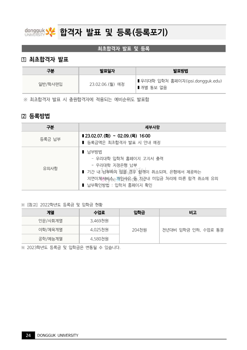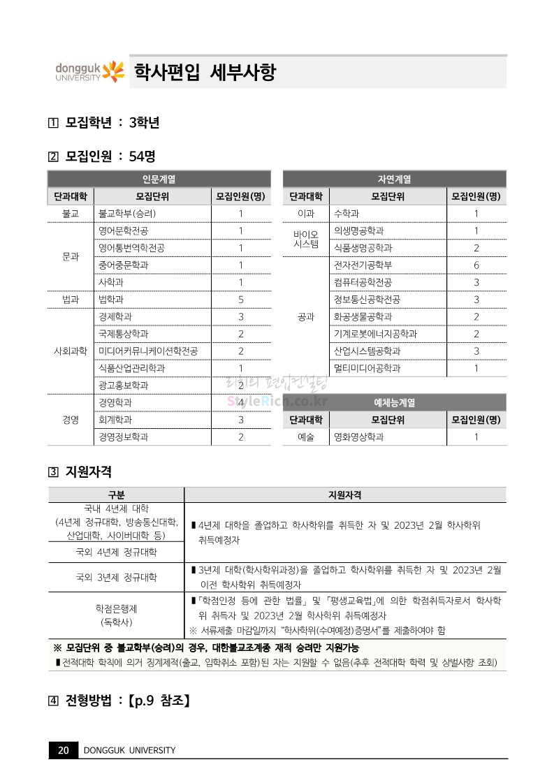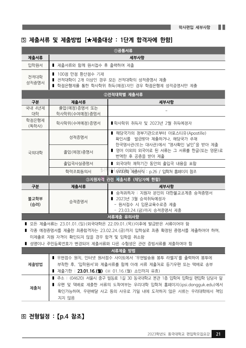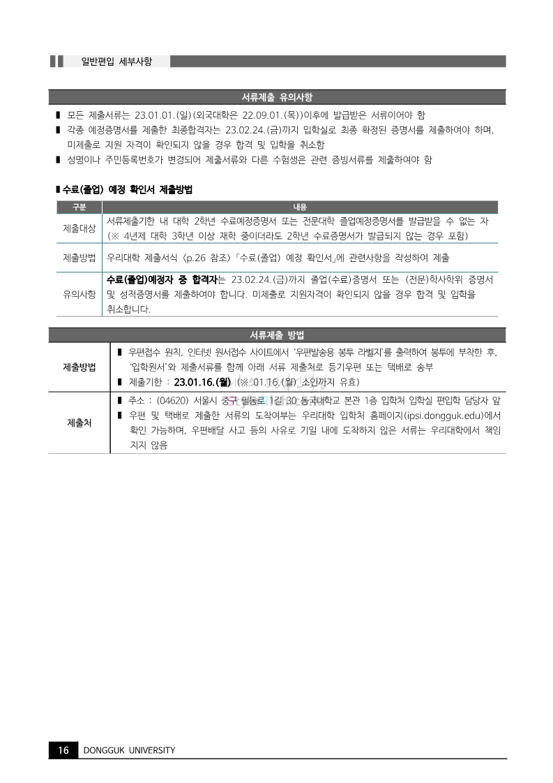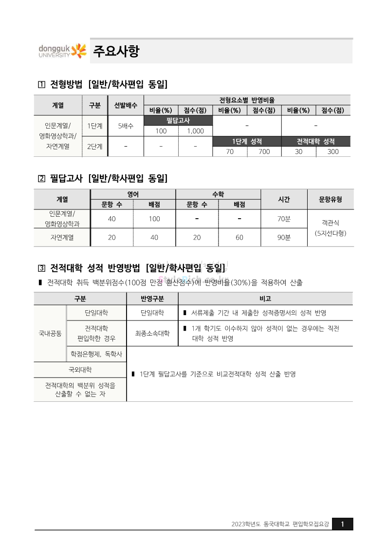 동국대 편입 2023학년도 모집요강 간편하게 보자! 2022.12.07 23:39 편입 모집요강/2023학년도 모집요강 2023학년도 동국대 편입 모집요강(2022.12.07 기준)을 간편하게 확인하세요. * 최종 모집요강 발표 이후에도 내용의 일부가 변경될 수 있으니 지원 전 반드시 동국대 입학처에서 확인 바랍니다. 동국대 편입 최신 모집요강 확인하기 <출처: 동국대> 공유하기 게시글 관리 리치의 편입컨설팅 저작자표시 비영리 변경금지 (새창열림) '편입 모집요강 > 2023학년도 모집요강' 카테고리의 다른 글 한양대 편입 2023학년도 모집요강 간편하게 보자! (0) 2022.12.08 서울과학기술대 편입 2023학년도 모집요강 간편하게 보자! (0) 2022.12.08 인제대 편입 2023학년도 모집요강 간편하게 보자! (0) 2022.12.06 영남대 편입 2023학년도 모집요강 간편하게 보자! (0) 2022.12.06 성균관대 편입 2023학년도 모집요강 간편하게 보자! (0) 2022.12.06 댓글 공유하기 다른 글 댓글 이 글 공유하기 구독하기 구독하기 카카오톡 카카오톡 라인 라인 트위터 트위터 Facebook Facebook 카카오스토리 카카오스토리 밴드 밴드 네이버 블로그 네이버 블로그 Pocket Pocket Evernote Evernote 다른 글 한양대 편입 2023학년도 모집요강 간편하게 보자! 한양대 편입 2023학년도 모집요강 간편하게 보자! 2022.12.08 서울과학기술대 편입 2023학년도 모집요강 간편하게 보자! 서울과학기술대 편입 2023학년도 모집요강 간편하게 보자! 2022.12.08 인제대 편입 2023학년도 모집요강 간편하게 보자! 인제대 편입 2023학년도 모집요강 간편하게 보자! 2022.12.06 영남대 편입 2023학년도 모집요강 간편하게 보자! 영남대 편입 2023학년도 모집요강 간편하게 보자! 2022.12.06 다른 글 더 둘러보기