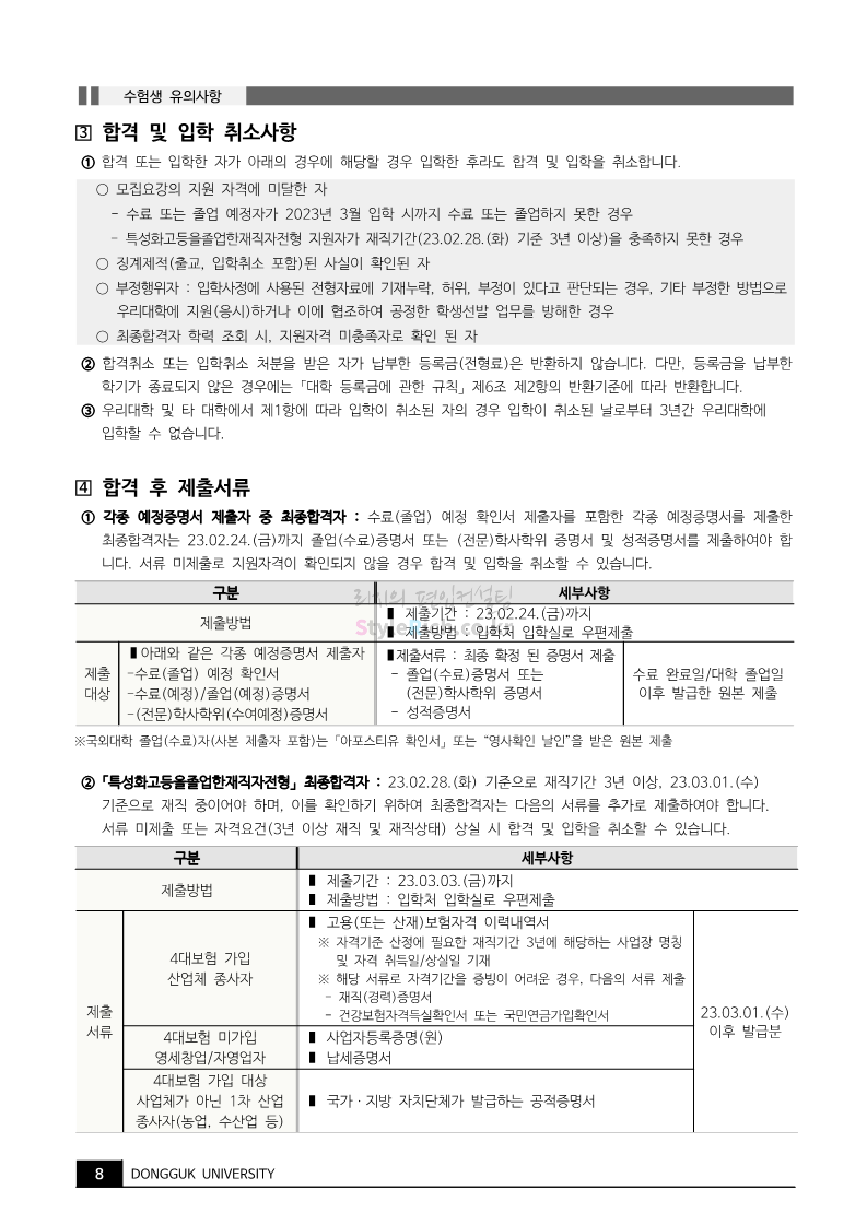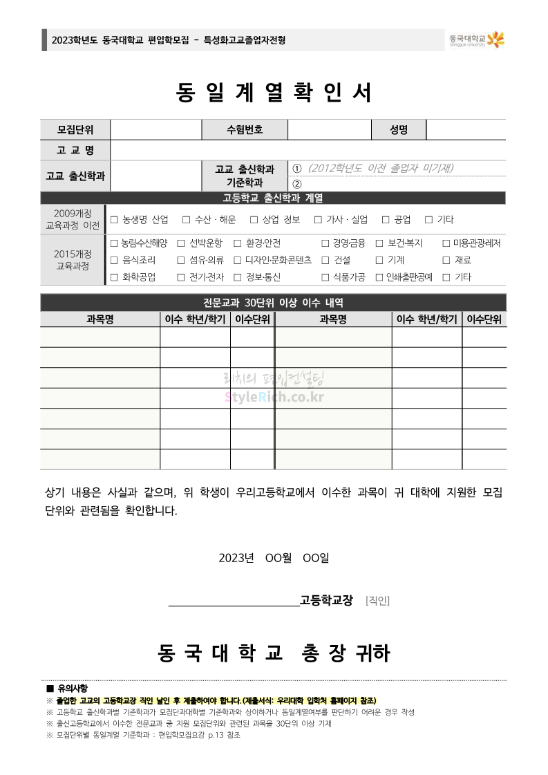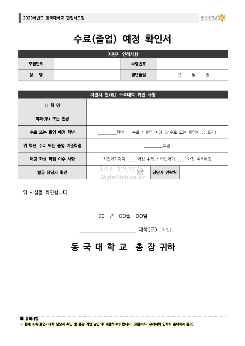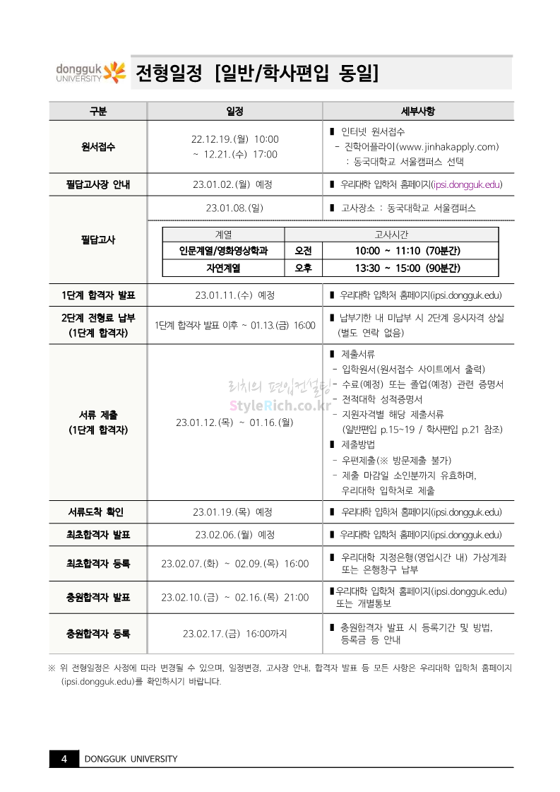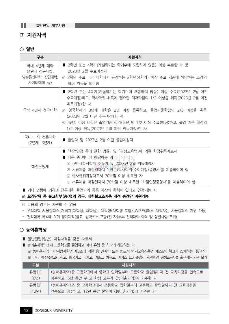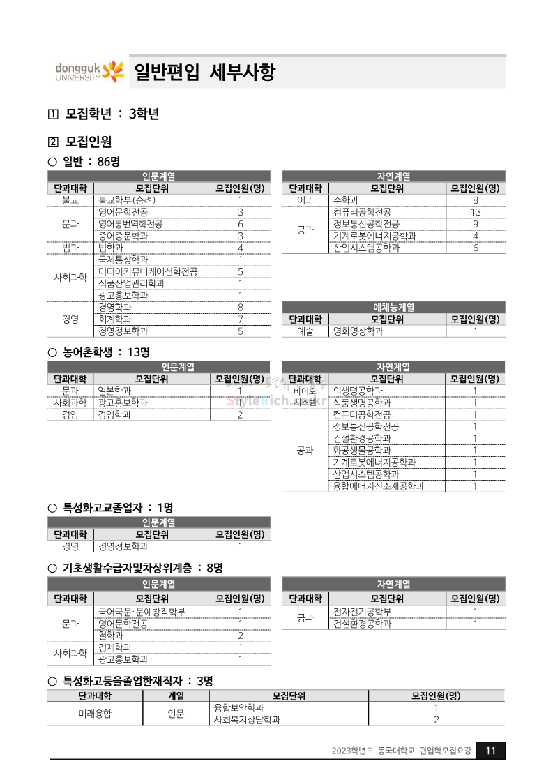 동국대 편입 2023학년도 모집요강 간편하게 보자! 2022.12.07 23:39 편입 모집요강/2023학년도 모집요강 2023학년도 동국대 편입 모집요강(2022.12.07 기준)을 간편하게 확인하세요. * 최종 모집요강 발표 이후에도 내용의 일부가 변경될 수 있으니 지원 전 반드시 동국대 입학처에서 확인 바랍니다. 동국대 편입 최신 모집요강 확인하기 <출처: 동국대> 공유하기 게시글 관리 리치의 편입컨설팅 저작자표시 비영리 변경금지 (새창열림) '편입 모집요강 > 2023학년도 모집요강' 카테고리의 다른 글 한양대 편입 2023학년도 모집요강 간편하게 보자! (0) 2022.12.08 서울과학기술대 편입 2023학년도 모집요강 간편하게 보자! (0) 2022.12.08 인제대 편입 2023학년도 모집요강 간편하게 보자! (0) 2022.12.06 영남대 편입 2023학년도 모집요강 간편하게 보자! (0) 2022.12.06 성균관대 편입 2023학년도 모집요강 간편하게 보자! (0) 2022.12.06 댓글 공유하기 다른 글 댓글 이 글 공유하기 구독하기 구독하기 카카오톡 카카오톡 라인 라인 트위터 트위터 Facebook Facebook 카카오스토리 카카오스토리 밴드 밴드 네이버 블로그 네이버 블로그 Pocket Pocket Evernote Evernote 다른 글 한양대 편입 2023학년도 모집요강 간편하게 보자! 한양대 편입 2023학년도 모집요강 간편하게 보자! 2022.12.08 서울과학기술대 편입 2023학년도 모집요강 간편하게 보자! 서울과학기술대 편입 2023학년도 모집요강 간편하게 보자! 2022.12.08 인제대 편입 2023학년도 모집요강 간편하게 보자! 인제대 편입 2023학년도 모집요강 간편하게 보자! 2022.12.06 영남대 편입 2023학년도 모집요강 간편하게 보자! 영남대 편입 2023학년도 모집요강 간편하게 보자! 2022.12.06 다른 글 더 둘러보기