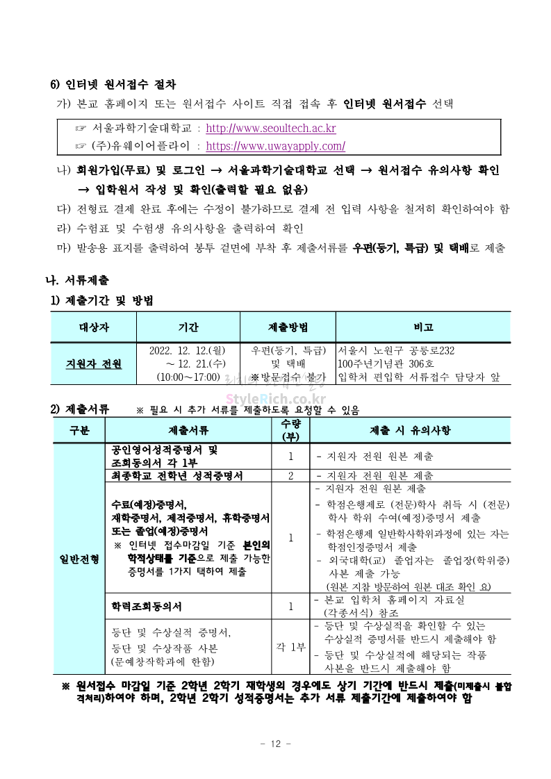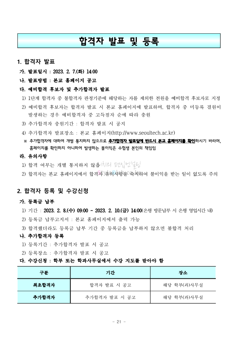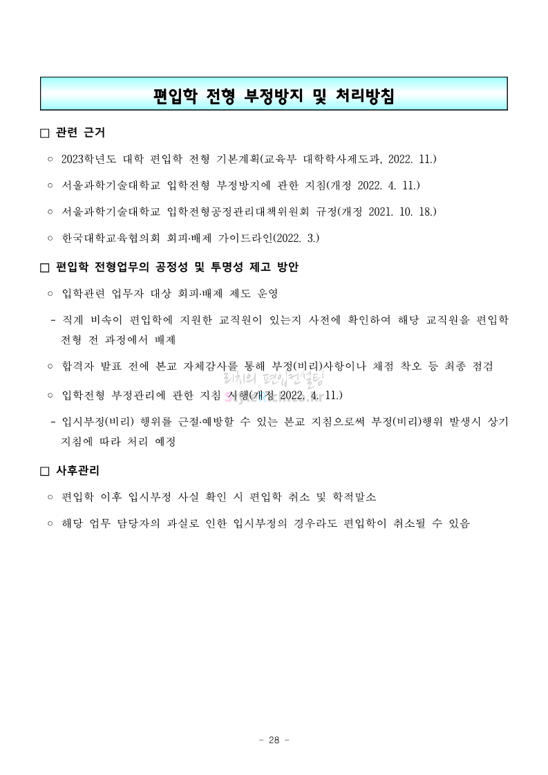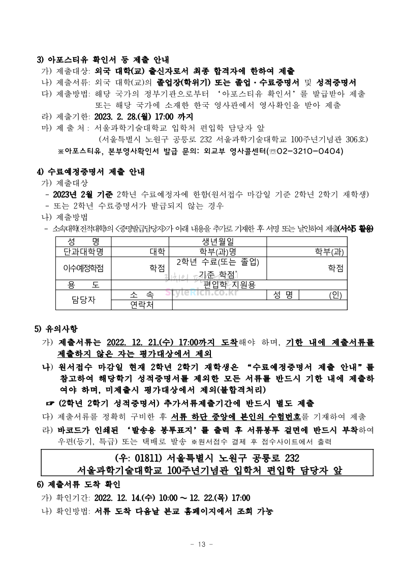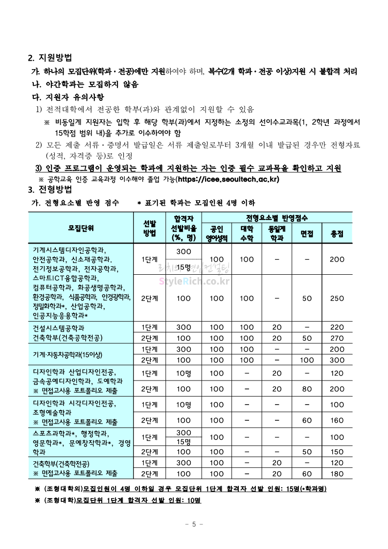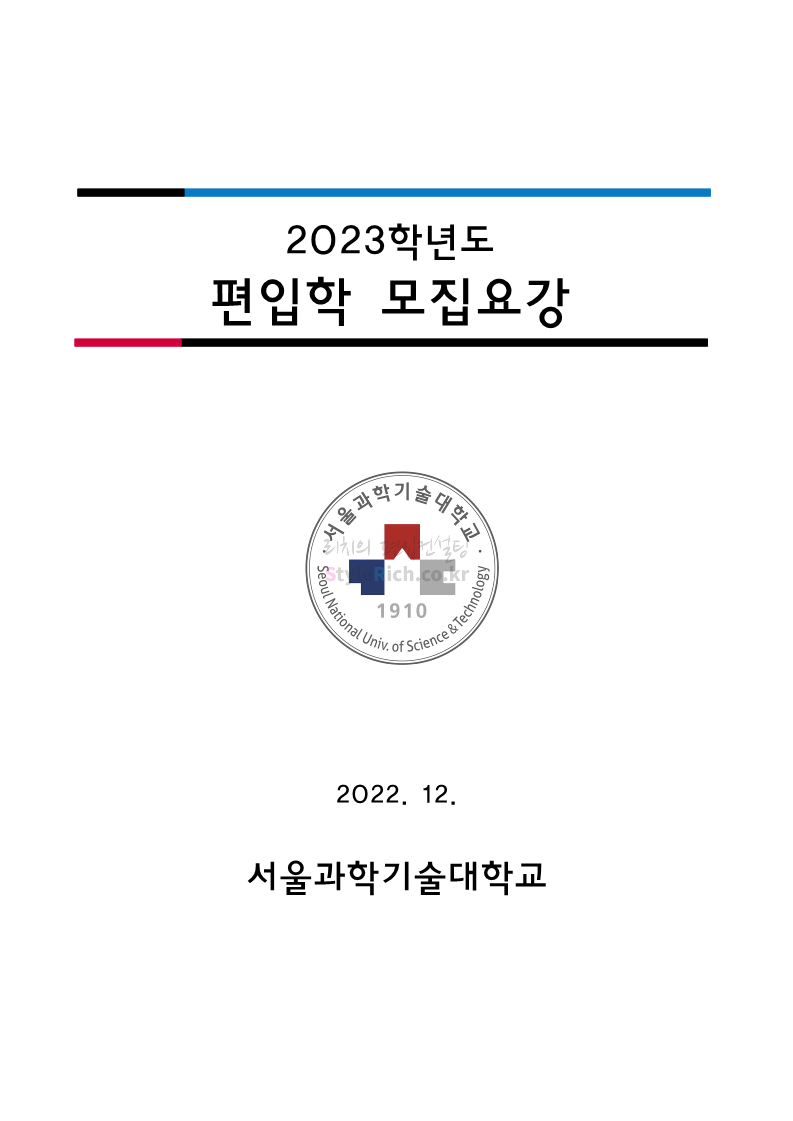 서울과학기술대 편입 2023학년도 모집요강 간편하게 보자! 2022.12.08 00:07 편입 모집요강/2023학년도 모집요강 2023학년도 서울과학기술대 편입 모집요강(2022.12.07 기준)을 간편하게 확인하세요. * 최종 모집요강 발표 이후에도 내용의 일부가 변경될 수 있으니 지원 전 반드시 서울과학기술대 입학처에서 확인 바랍니다. 서울과학기술대 편입 최신 모집요강 확인하기 <출처: 서울과학기술대> 공유하기 게시글 관리 리치의 편입컨설팅 저작자표시 비영리 변경금지 (새창열림) '편입 모집요강 > 2023학년도 모집요강' 카테고리의 다른 글 부산대 편입 2023학년도 모집요강 간편하게 보자! (0) 2022.12.08 한양대 편입 2023학년도 모집요강 간편하게 보자! (0) 2022.12.08 동국대 편입 2023학년도 모집요강 간편하게 보자! (0) 2022.12.07 인제대 편입 2023학년도 모집요강 간편하게 보자! (0) 2022.12.06 영남대 편입 2023학년도 모집요강 간편하게 보자! (0) 2022.12.06 댓글 공유하기 다른 글 댓글 이 글 공유하기 구독하기 구독하기 카카오톡 카카오톡 라인 라인 트위터 트위터 Facebook Facebook 카카오스토리 카카오스토리 밴드 밴드 네이버 블로그 네이버 블로그 Pocket Pocket Evernote Evernote 다른 글 부산대 편입 2023학년도 모집요강 간편하게 보자! 부산대 편입 2023학년도 모집요강 간편하게 보자! 2022.12.08 한양대 편입 2023학년도 모집요강 간편하게 보자! 한양대 편입 2023학년도 모집요강 간편하게 보자! 2022.12.08 동국대 편입 2023학년도 모집요강 간편하게 보자! 동국대 편입 2023학년도 모집요강 간편하게 보자! 2022.12.07 인제대 편입 2023학년도 모집요강 간편하게 보자! 인제대 편입 2023학년도 모집요강 간편하게 보자! 2022.12.06 다른 글 더 둘러보기