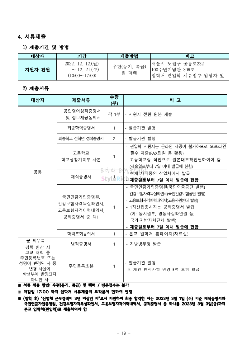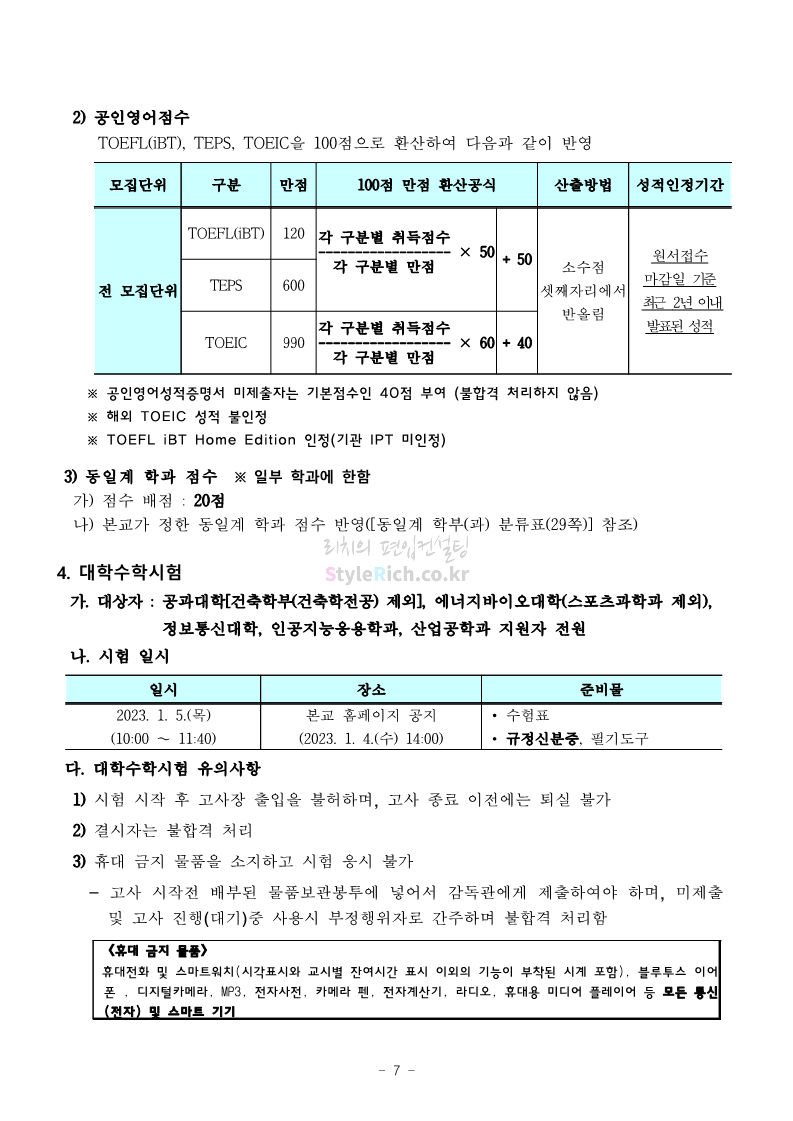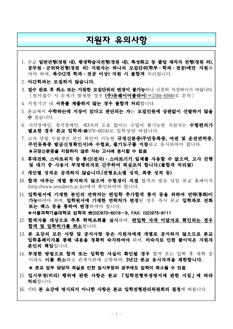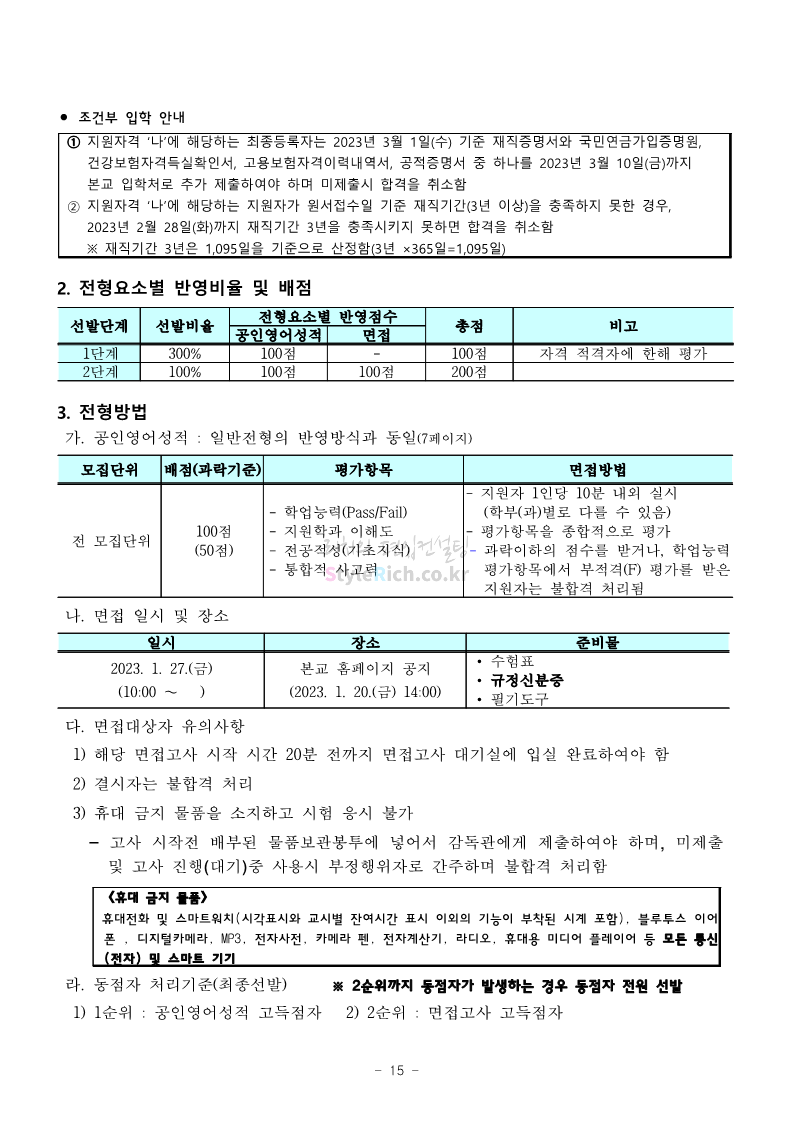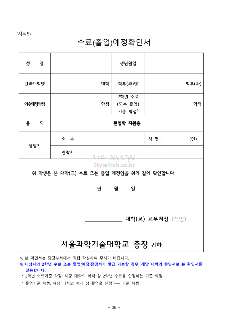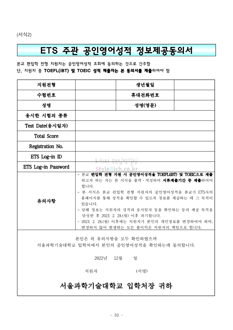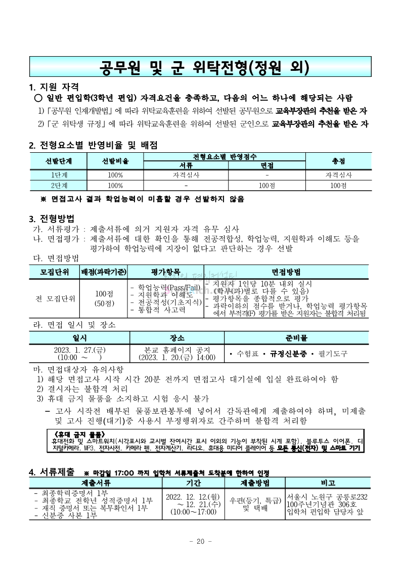 서울과학기술대 편입 2023학년도 모집요강 간편하게 보자! 2022.12.08 00:07 편입 모집요강/2023학년도 모집요강 2023학년도 서울과학기술대 편입 모집요강(2022.12.07 기준)을 간편하게 확인하세요. * 최종 모집요강 발표 이후에도 내용의 일부가 변경될 수 있으니 지원 전 반드시 서울과학기술대 입학처에서 확인 바랍니다. 서울과학기술대 편입 최신 모집요강 확인하기 <출처: 서울과학기술대> 공유하기 게시글 관리 리치의 편입컨설팅 저작자표시 비영리 변경금지 (새창열림) '편입 모집요강 > 2023학년도 모집요강' 카테고리의 다른 글 부산대 편입 2023학년도 모집요강 간편하게 보자! (0) 2022.12.08 한양대 편입 2023학년도 모집요강 간편하게 보자! (0) 2022.12.08 동국대 편입 2023학년도 모집요강 간편하게 보자! (0) 2022.12.07 인제대 편입 2023학년도 모집요강 간편하게 보자! (0) 2022.12.06 영남대 편입 2023학년도 모집요강 간편하게 보자! (0) 2022.12.06 댓글 공유하기 다른 글 댓글 이 글 공유하기 구독하기 구독하기 카카오톡 카카오톡 라인 라인 트위터 트위터 Facebook Facebook 카카오스토리 카카오스토리 밴드 밴드 네이버 블로그 네이버 블로그 Pocket Pocket Evernote Evernote 다른 글 부산대 편입 2023학년도 모집요강 간편하게 보자! 부산대 편입 2023학년도 모집요강 간편하게 보자! 2022.12.08 한양대 편입 2023학년도 모집요강 간편하게 보자! 한양대 편입 2023학년도 모집요강 간편하게 보자! 2022.12.08 동국대 편입 2023학년도 모집요강 간편하게 보자! 동국대 편입 2023학년도 모집요강 간편하게 보자! 2022.12.07 인제대 편입 2023학년도 모집요강 간편하게 보자! 인제대 편입 2023학년도 모집요강 간편하게 보자! 2022.12.06 다른 글 더 둘러보기