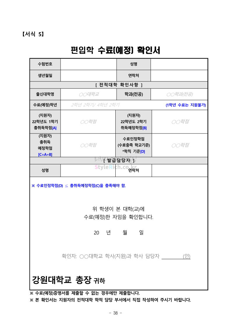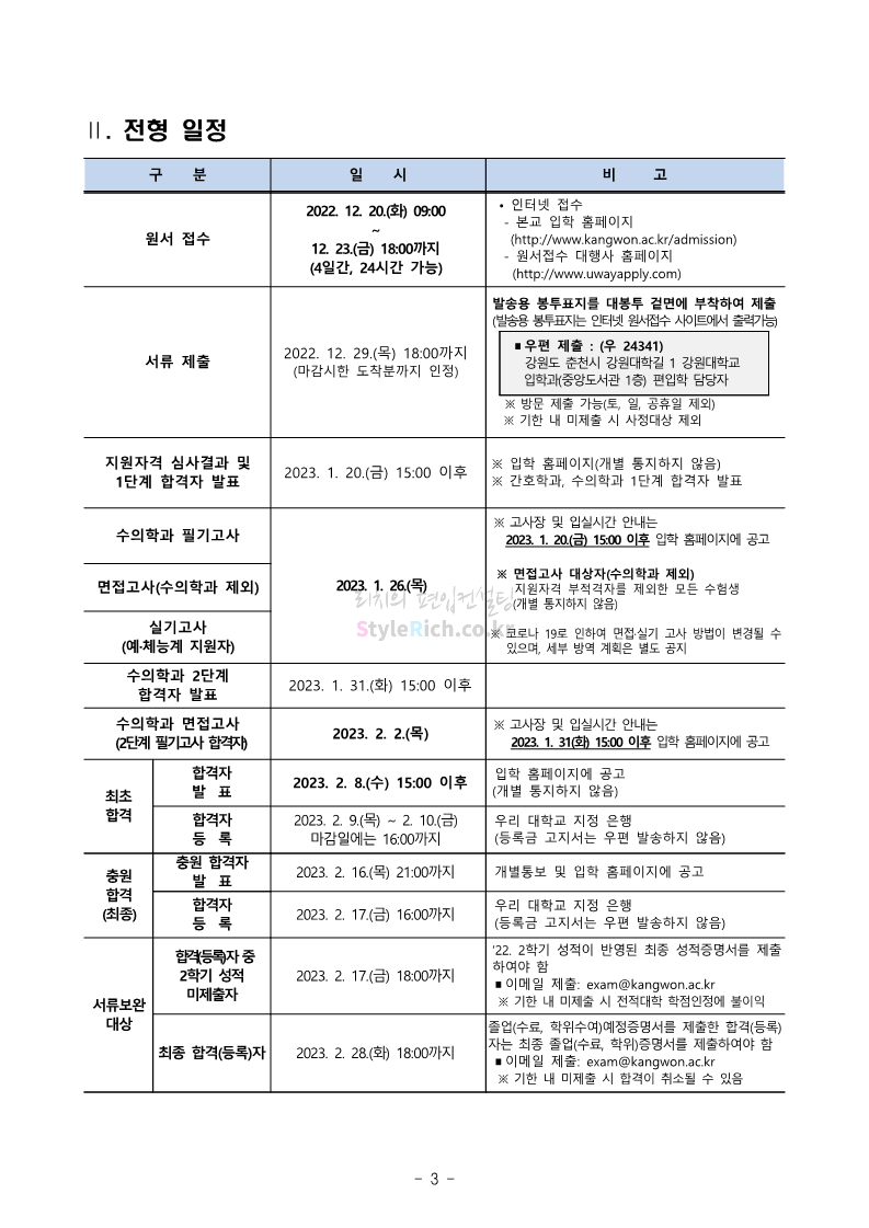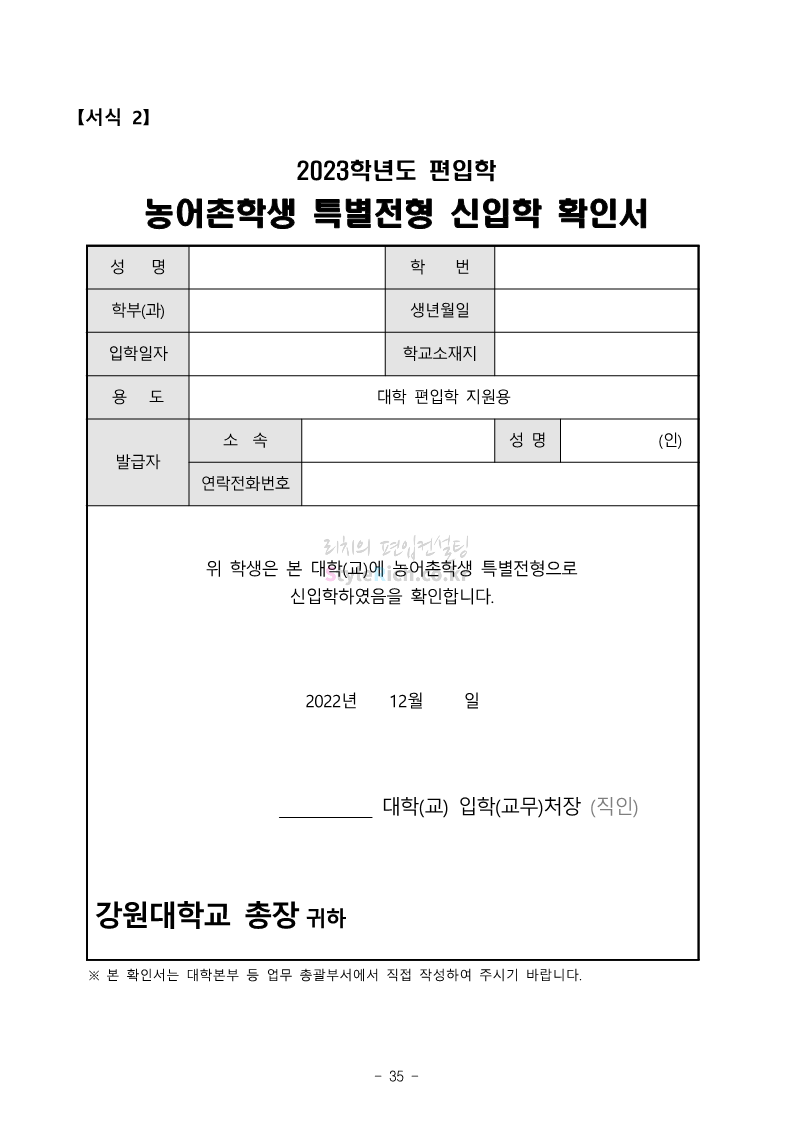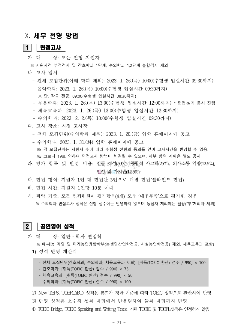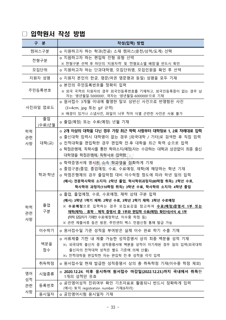 강원대(춘천) 편입 2023학년도 모집요강 간편하게 보자! 2022.12.11 00:29 편입 모집요강/2023학년도 모집요강 2023학년도 강원대(춘천) 편입 모집요강(2022.12.22 기준)을 간편하게 확인하세요. * 최종 모집요강 발표 이후에도 내용의 일부가 변경될 수 있으니 지원 전 반드시 강원대 입학처에서 확인 바랍니다. 강원대(춘천) 편입 최신 모집요강 확인하기 <출처: 강원대> 공유하기 게시글 관리 리치의 편입컨설팅 저작자표시 비영리 변경금지 (새창열림) '편입 모집요강 > 2023학년도 모집요강' 카테고리의 다른 글 한국외대 편입 2023학년도 모집요강 간편하게 보자! (0) 2022.12.12 강원대(삼척/도계) 편입 2023학년도 모집요강 간편하게 보자! (0) 2022.12.11 서울여대 편입 2023학년도 모집요강 간편하게 보자! (0) 2022.12.10 서울시립대 편입 2023학년도 모집요강 간편하게 보자! (0) 2022.12.09 충남대 편입 2023학년도 모집요강 간편하게 보자! (0) 2022.12.08 댓글 공유하기 다른 글 댓글 이 글 공유하기 구독하기 구독하기 카카오톡 카카오톡 라인 라인 트위터 트위터 Facebook Facebook 카카오스토리 카카오스토리 밴드 밴드 네이버 블로그 네이버 블로그 Pocket Pocket Evernote Evernote 다른 글 한국외대 편입 2023학년도 모집요강 간편하게 보자! 한국외대 편입 2023학년도 모집요강 간편하게 보자! 2022.12.12 강원대(삼척/도계) 편입 2023학년도 모집요강 간편하게 보자! 강원대(삼척/도계) 편입 2023학년도 모집요강 간편하게 보자! 2022.12.11 서울여대 편입 2023학년도 모집요강 간편하게 보자! 서울여대 편입 2023학년도 모집요강 간편하게 보자! 2022.12.10 서울시립대 편입 2023학년도 모집요강 간편하게 보자! 서울시립대 편입 2023학년도 모집요강 간편하게 보자! 2022.12.09 다른 글 더 둘러보기