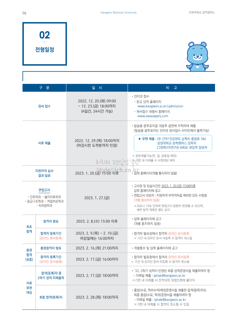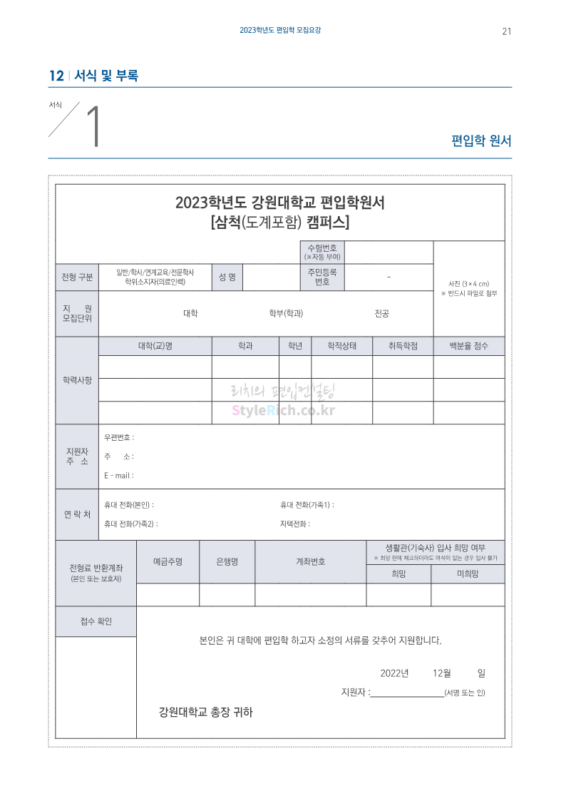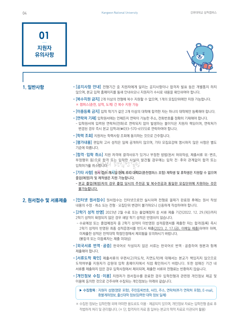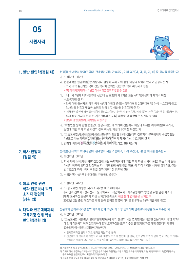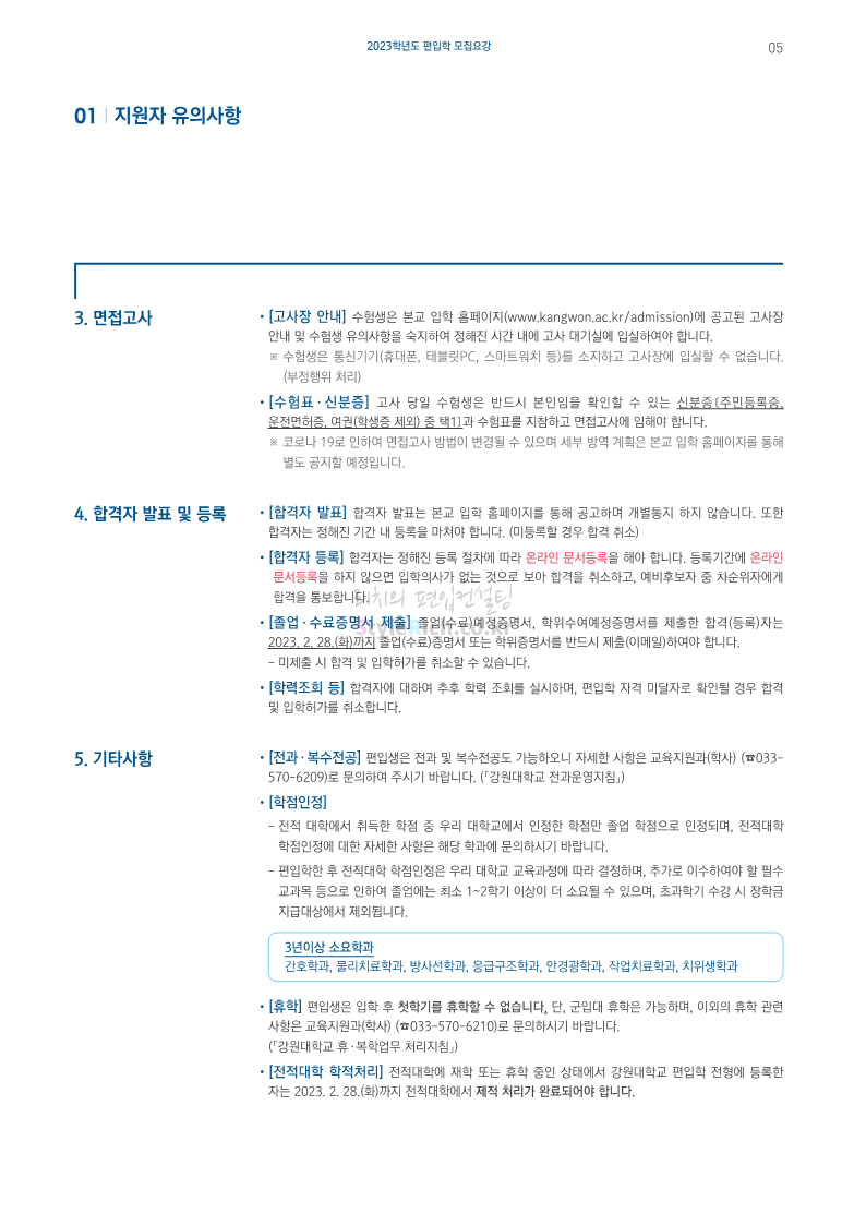 강원대(삼척/도계) 편입 2023학년도 모집요강 간편하게 보자! 2022.12.11 09:00 편입 모집요강/2023학년도 모집요강 2023학년도 강원대(삼척/도계) 편입 모집요강(2022.12.09 기준)을 간편하게 확인하세요. * 최종 모집요강 발표 이후에도 내용의 일부가 변경될 수 있으니 지원 전 반드시 강원대 입학처에서 확인 바랍니다. 강원대 편입 최신 모집요강 확인하기 < 출처: 강원대> 공유하기 게시글 관리 리치의 편입컨설팅 저작자표시 비영리 변경금지 (새창열림) '편입 모집요강 > 2023학년도 모집요강' 카테고리의 다른 글 삼육대 편입 2023학년도 모집요강 간편하게 보자! (0) 2022.12.13 한국외대 편입 2023학년도 모집요강 간편하게 보자! (0) 2022.12.12 강원대(춘천) 편입 2023학년도 모집요강 간편하게 보자! (0) 2022.12.11 서울여대 편입 2023학년도 모집요강 간편하게 보자! (0) 2022.12.10 서울시립대 편입 2023학년도 모집요강 간편하게 보자! (0) 2022.12.09 댓글 공유하기 다른 글 댓글 이 글 공유하기 구독하기 구독하기 카카오톡 카카오톡 라인 라인 트위터 트위터 Facebook Facebook 카카오스토리 카카오스토리 밴드 밴드 네이버 블로그 네이버 블로그 Pocket Pocket Evernote Evernote 다른 글 삼육대 편입 2023학년도 모집요강 간편하게 보자! 삼육대 편입 2023학년도 모집요강 간편하게 보자! 2022.12.13 한국외대 편입 2023학년도 모집요강 간편하게 보자! 한국외대 편입 2023학년도 모집요강 간편하게 보자! 2022.12.12 강원대(춘천) 편입 2023학년도 모집요강 간편하게 보자! 강원대(춘천) 편입 2023학년도 모집요강 간편하게 보자! 2022.12.11 서울여대 편입 2023학년도 모집요강 간편하게 보자! 서울여대 편입 2023학년도 모집요강 간편하게 보자! 2022.12.10 다른 글 더 둘러보기