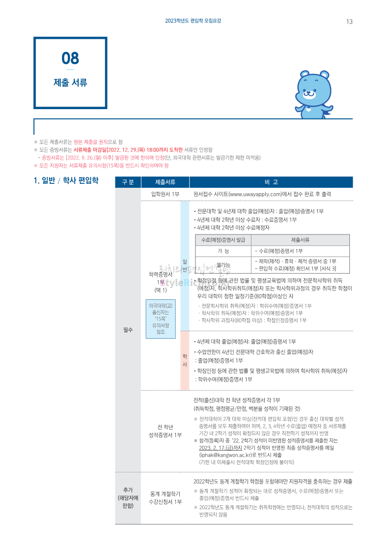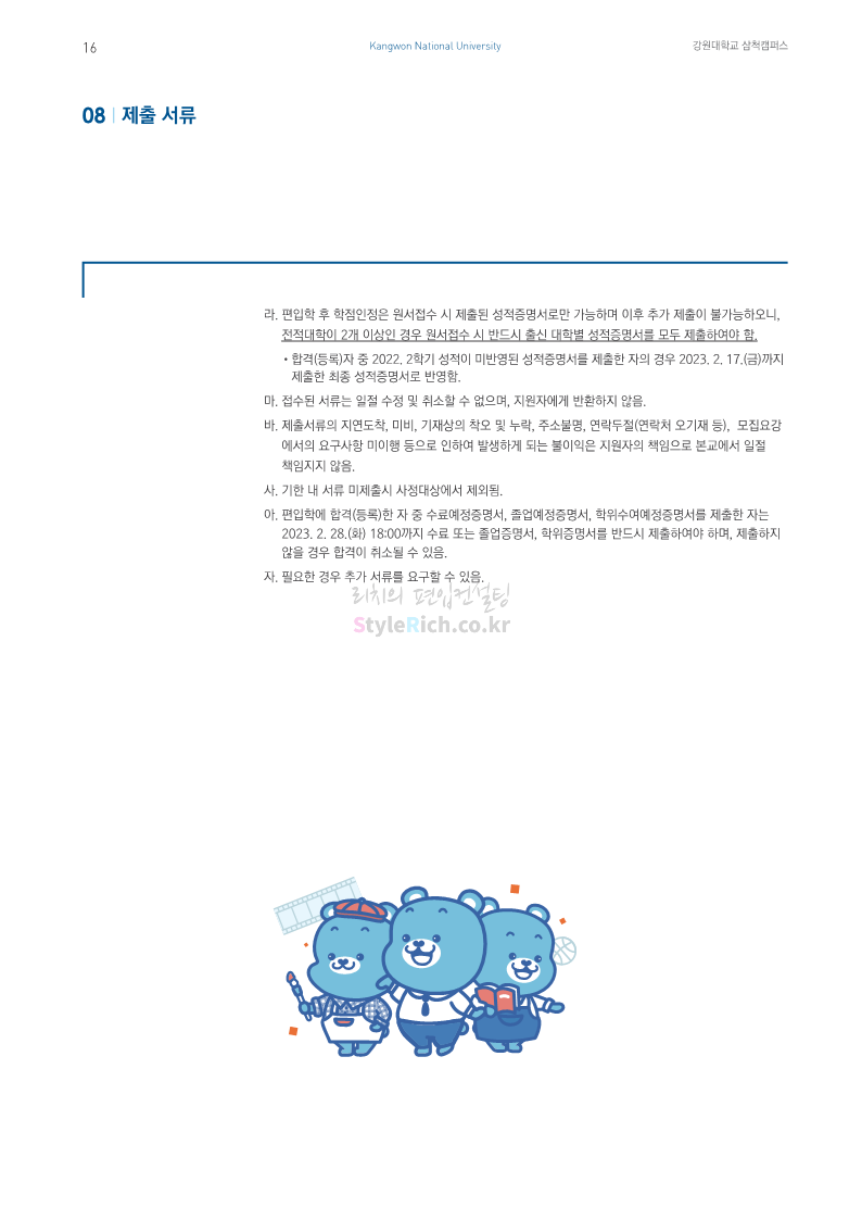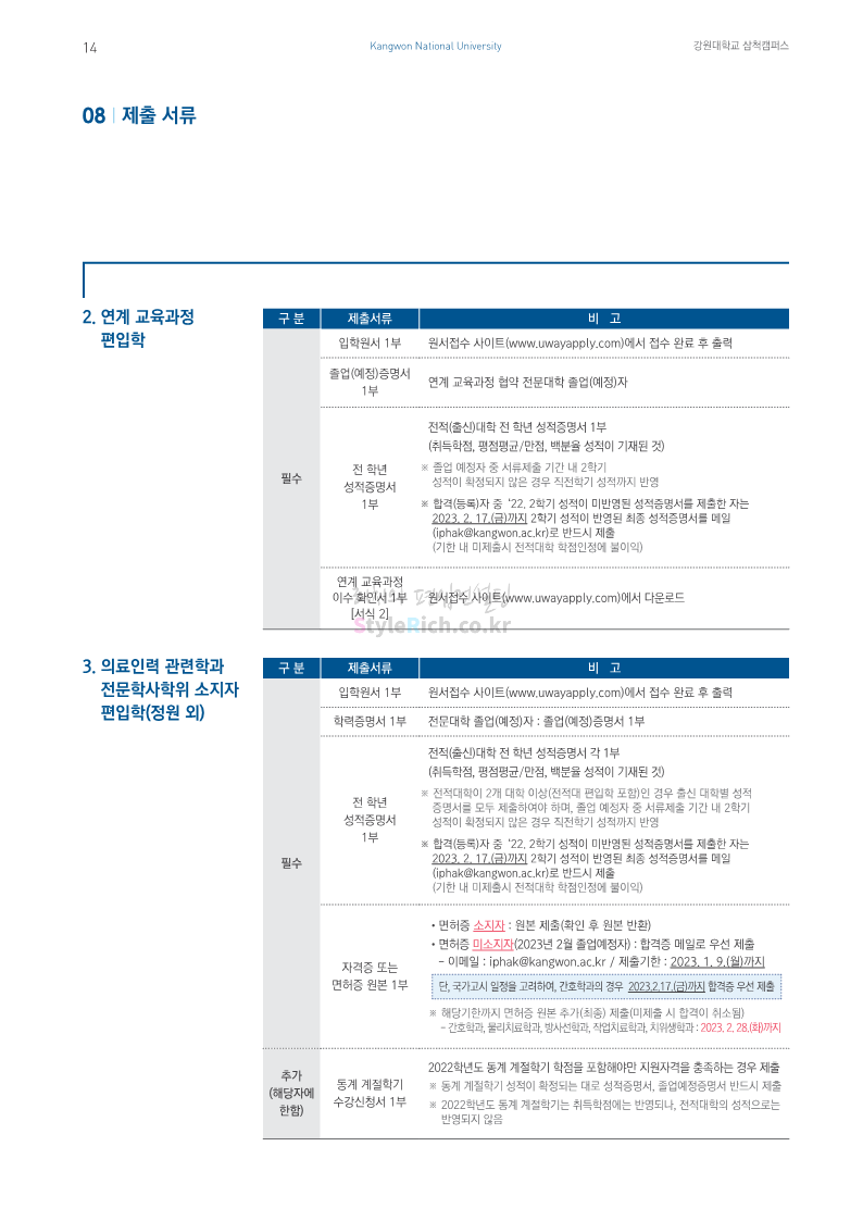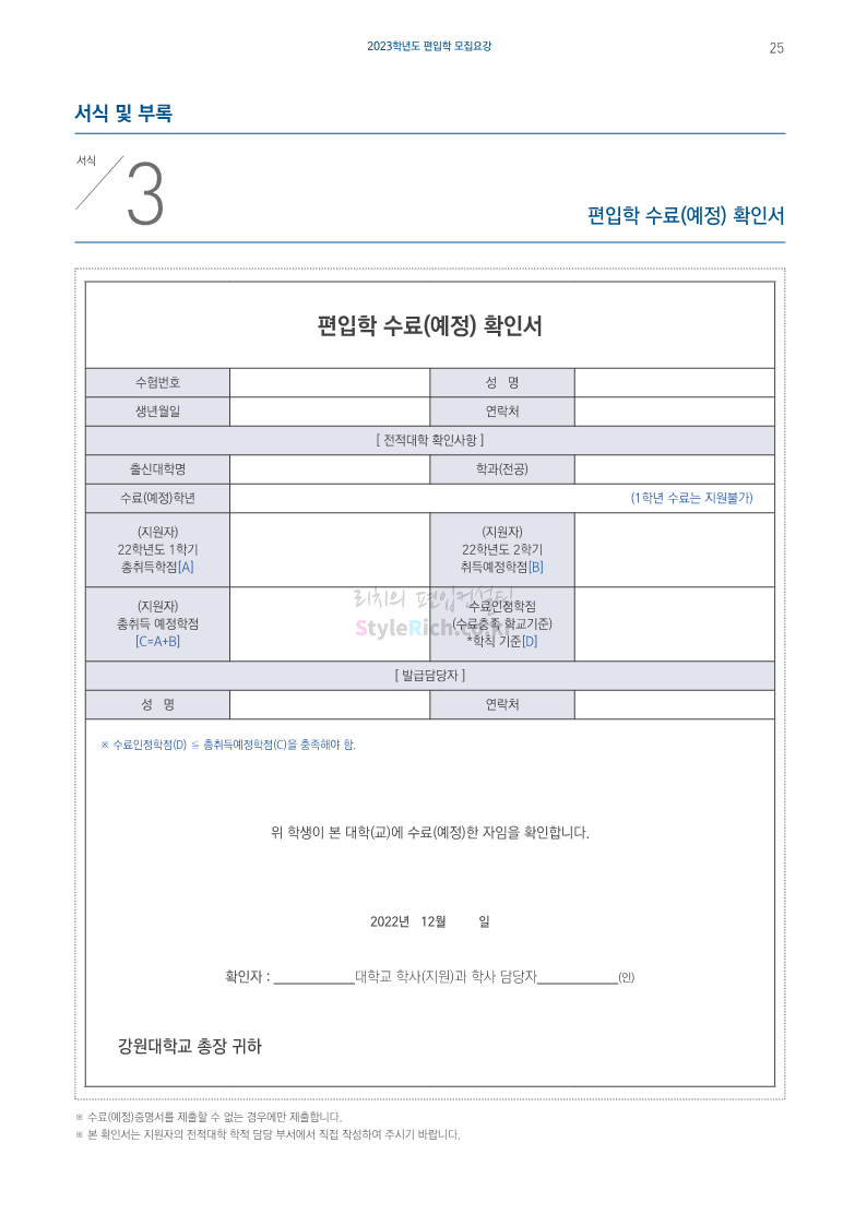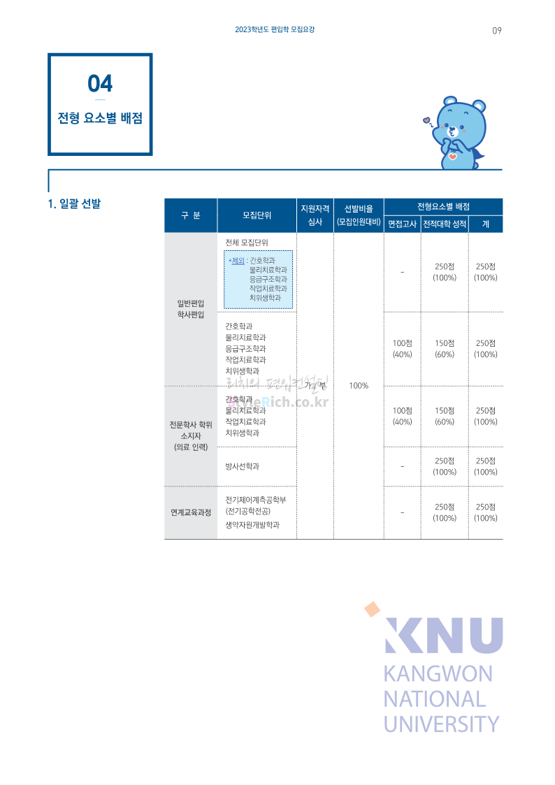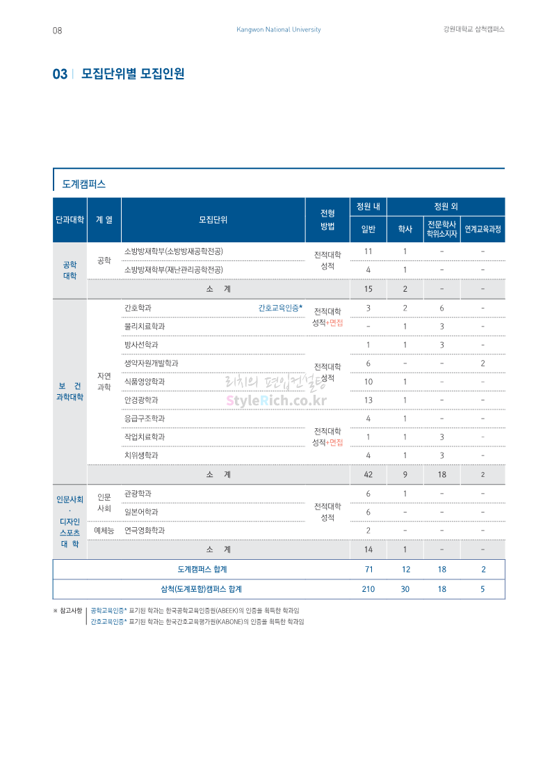 강원대(삼척/도계) 편입 2023학년도 모집요강 간편하게 보자! 2022.12.11 09:00 편입 모집요강/2023학년도 모집요강 2023학년도 강원대(삼척/도계) 편입 모집요강(2022.12.09 기준)을 간편하게 확인하세요. * 최종 모집요강 발표 이후에도 내용의 일부가 변경될 수 있으니 지원 전 반드시 강원대 입학처에서 확인 바랍니다. 강원대 편입 최신 모집요강 확인하기 < 출처: 강원대> 공유하기 게시글 관리 리치의 편입컨설팅 저작자표시 비영리 변경금지 (새창열림) '편입 모집요강 > 2023학년도 모집요강' 카테고리의 다른 글 삼육대 편입 2023학년도 모집요강 간편하게 보자! (0) 2022.12.13 한국외대 편입 2023학년도 모집요강 간편하게 보자! (0) 2022.12.12 강원대(춘천) 편입 2023학년도 모집요강 간편하게 보자! (0) 2022.12.11 서울여대 편입 2023학년도 모집요강 간편하게 보자! (0) 2022.12.10 서울시립대 편입 2023학년도 모집요강 간편하게 보자! (0) 2022.12.09 댓글 공유하기 다른 글 댓글 이 글 공유하기 구독하기 구독하기 카카오톡 카카오톡 라인 라인 트위터 트위터 Facebook Facebook 카카오스토리 카카오스토리 밴드 밴드 네이버 블로그 네이버 블로그 Pocket Pocket Evernote Evernote 다른 글 삼육대 편입 2023학년도 모집요강 간편하게 보자! 삼육대 편입 2023학년도 모집요강 간편하게 보자! 2022.12.13 한국외대 편입 2023학년도 모집요강 간편하게 보자! 한국외대 편입 2023학년도 모집요강 간편하게 보자! 2022.12.12 강원대(춘천) 편입 2023학년도 모집요강 간편하게 보자! 강원대(춘천) 편입 2023학년도 모집요강 간편하게 보자! 2022.12.11 서울여대 편입 2023학년도 모집요강 간편하게 보자! 서울여대 편입 2023학년도 모집요강 간편하게 보자! 2022.12.10 다른 글 더 둘러보기