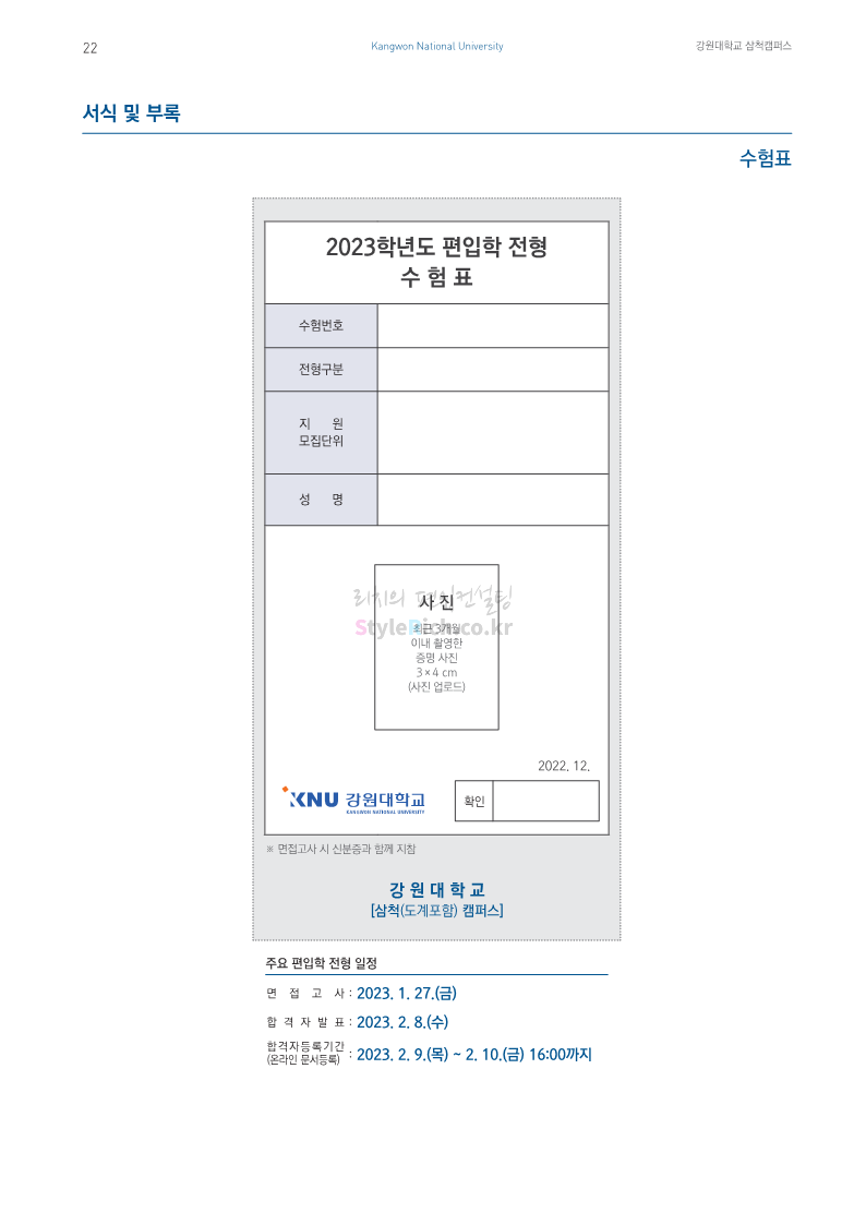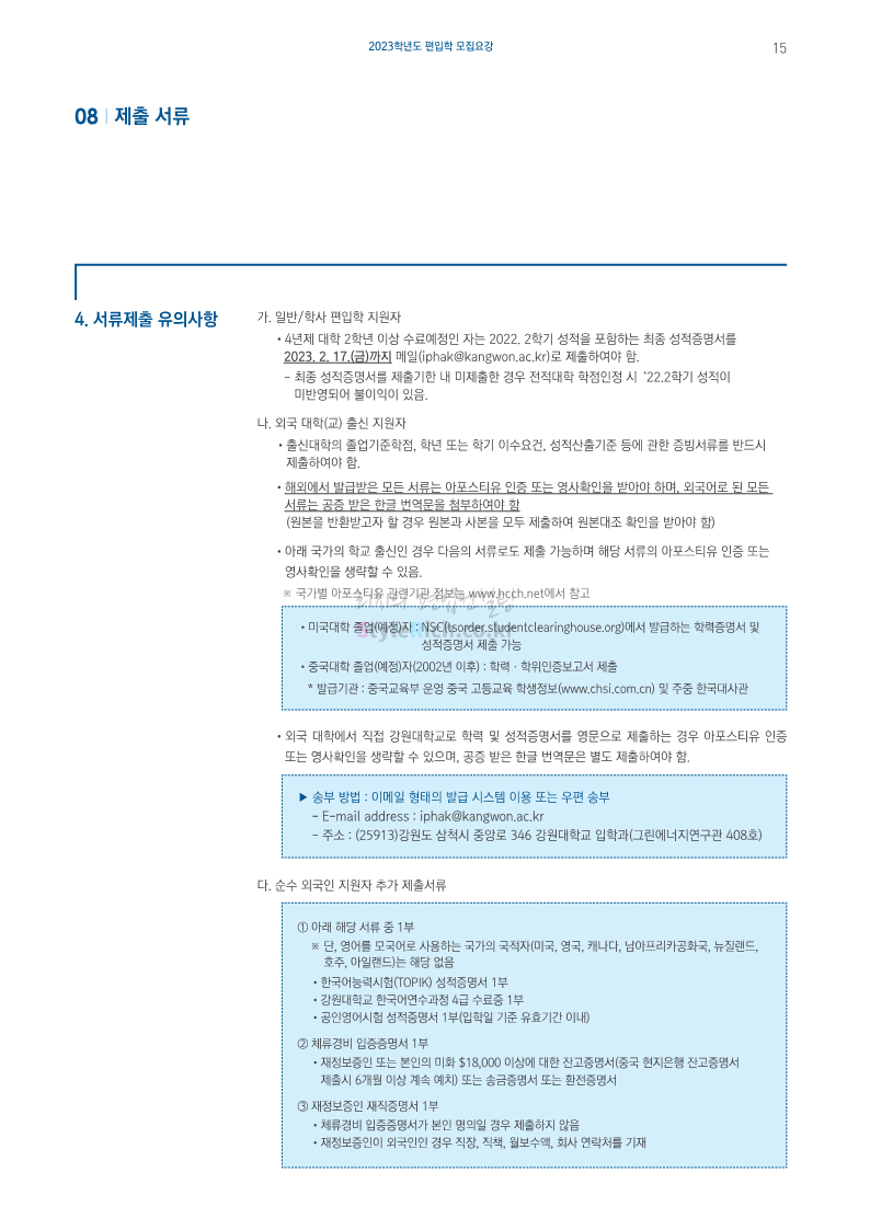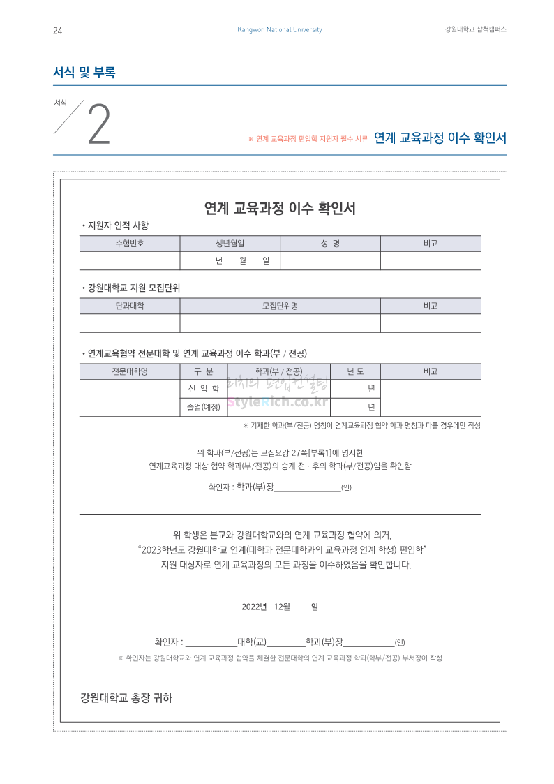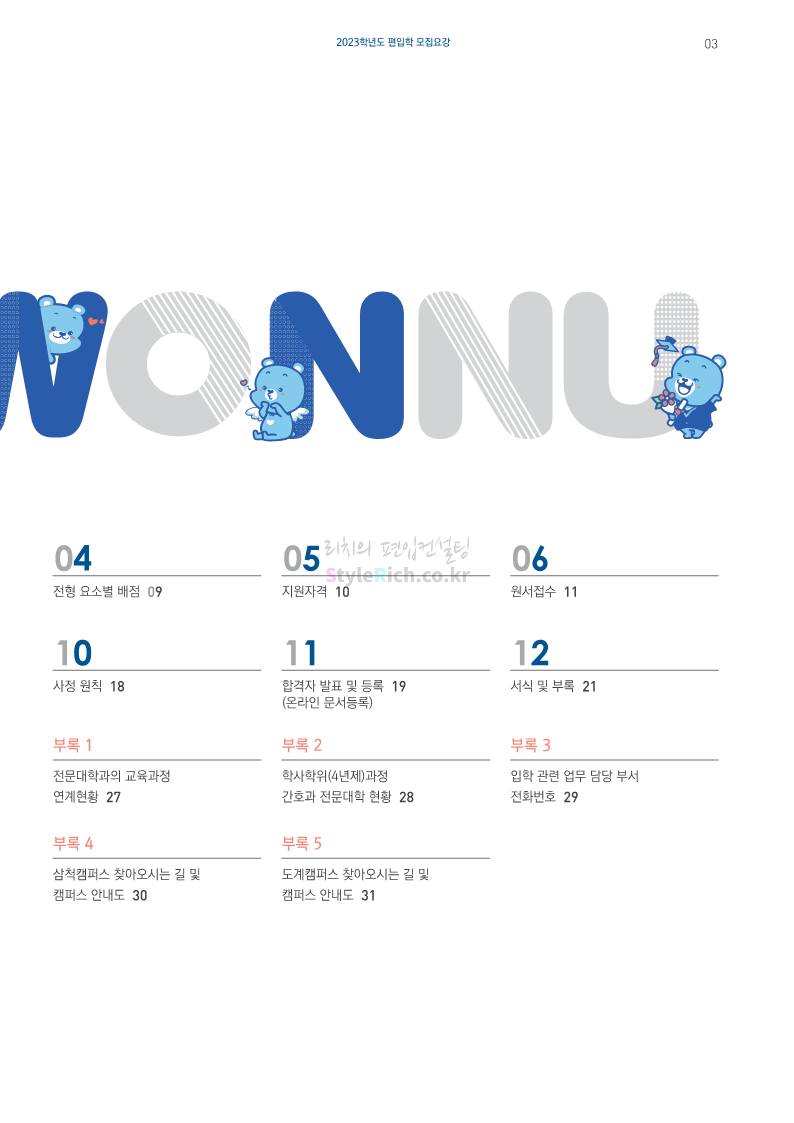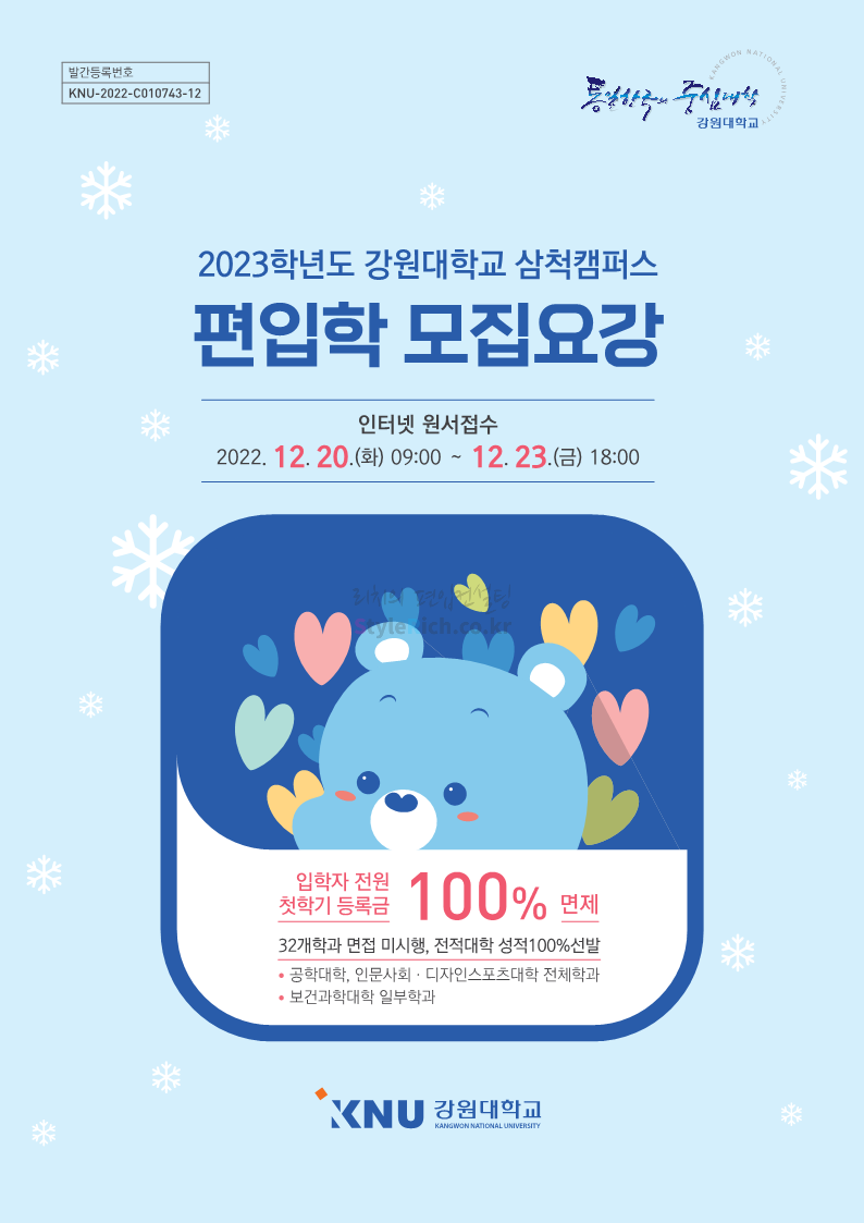 강원대(삼척/도계) 편입 2023학년도 모집요강 간편하게 보자! 2022.12.11 09:00 편입 모집요강/2023학년도 모집요강 2023학년도 강원대(삼척/도계) 편입 모집요강(2022.12.09 기준)을 간편하게 확인하세요. * 최종 모집요강 발표 이후에도 내용의 일부가 변경될 수 있으니 지원 전 반드시 강원대 입학처에서 확인 바랍니다. 강원대 편입 최신 모집요강 확인하기 < 출처: 강원대> 공유하기 게시글 관리 리치의 편입컨설팅 저작자표시 비영리 변경금지 (새창열림) '편입 모집요강 > 2023학년도 모집요강' 카테고리의 다른 글 삼육대 편입 2023학년도 모집요강 간편하게 보자! (0) 2022.12.13 한국외대 편입 2023학년도 모집요강 간편하게 보자! (0) 2022.12.12 강원대(춘천) 편입 2023학년도 모집요강 간편하게 보자! (0) 2022.12.11 서울여대 편입 2023학년도 모집요강 간편하게 보자! (0) 2022.12.10 서울시립대 편입 2023학년도 모집요강 간편하게 보자! (0) 2022.12.09 댓글 공유하기 다른 글 댓글 이 글 공유하기 구독하기 구독하기 카카오톡 카카오톡 라인 라인 트위터 트위터 Facebook Facebook 카카오스토리 카카오스토리 밴드 밴드 네이버 블로그 네이버 블로그 Pocket Pocket Evernote Evernote 다른 글 삼육대 편입 2023학년도 모집요강 간편하게 보자! 삼육대 편입 2023학년도 모집요강 간편하게 보자! 2022.12.13 한국외대 편입 2023학년도 모집요강 간편하게 보자! 한국외대 편입 2023학년도 모집요강 간편하게 보자! 2022.12.12 강원대(춘천) 편입 2023학년도 모집요강 간편하게 보자! 강원대(춘천) 편입 2023학년도 모집요강 간편하게 보자! 2022.12.11 서울여대 편입 2023학년도 모집요강 간편하게 보자! 서울여대 편입 2023학년도 모집요강 간편하게 보자! 2022.12.10 다른 글 더 둘러보기