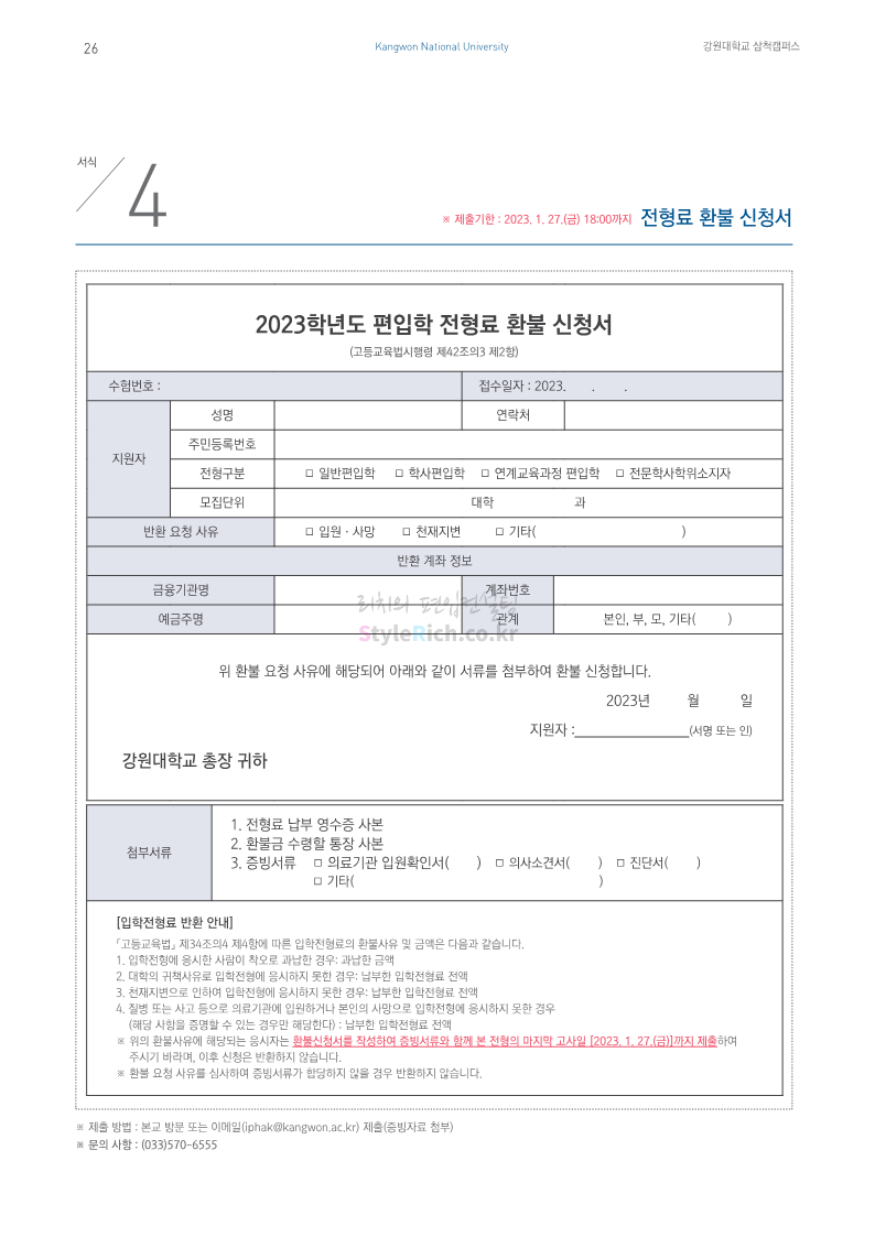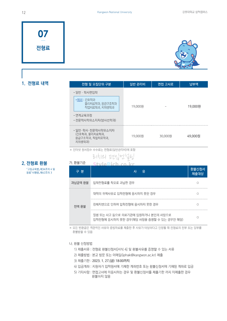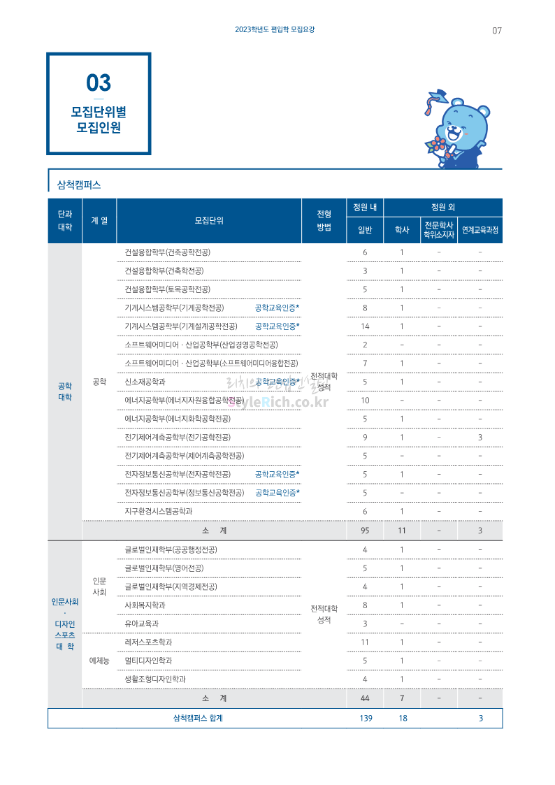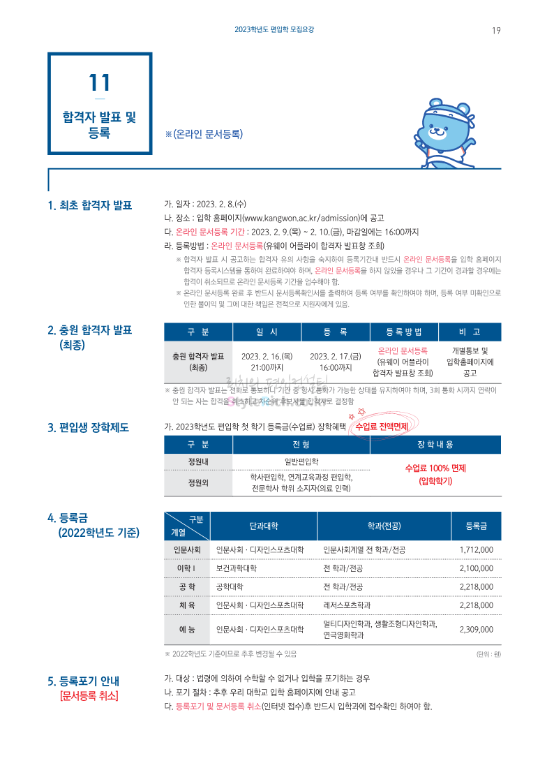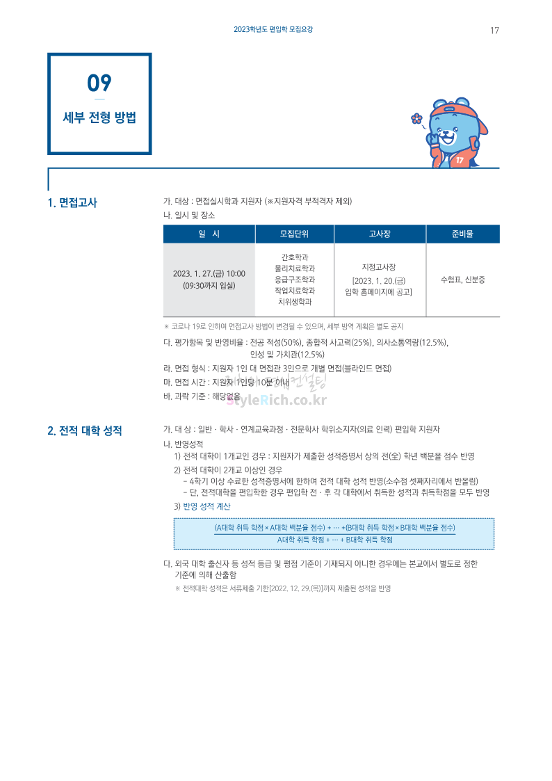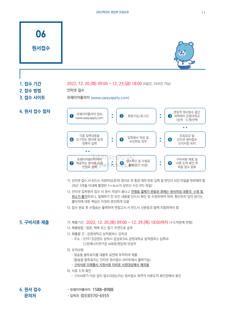 강원대(삼척/도계) 편입 2023학년도 모집요강 간편하게 보자! 2022.12.11 09:00 편입 모집요강/2023학년도 모집요강 2023학년도 강원대(삼척/도계) 편입 모집요강(2022.12.09 기준)을 간편하게 확인하세요. * 최종 모집요강 발표 이후에도 내용의 일부가 변경될 수 있으니 지원 전 반드시 강원대 입학처에서 확인 바랍니다. 강원대 편입 최신 모집요강 확인하기 < 출처: 강원대> 공유하기 게시글 관리 리치의 편입컨설팅 저작자표시 비영리 변경금지 (새창열림) '편입 모집요강 > 2023학년도 모집요강' 카테고리의 다른 글 삼육대 편입 2023학년도 모집요강 간편하게 보자! (0) 2022.12.13 한국외대 편입 2023학년도 모집요강 간편하게 보자! (0) 2022.12.12 강원대(춘천) 편입 2023학년도 모집요강 간편하게 보자! (0) 2022.12.11 서울여대 편입 2023학년도 모집요강 간편하게 보자! (0) 2022.12.10 서울시립대 편입 2023학년도 모집요강 간편하게 보자! (0) 2022.12.09 댓글 공유하기 다른 글 댓글 이 글 공유하기 구독하기 구독하기 카카오톡 카카오톡 라인 라인 트위터 트위터 Facebook Facebook 카카오스토리 카카오스토리 밴드 밴드 네이버 블로그 네이버 블로그 Pocket Pocket Evernote Evernote 다른 글 삼육대 편입 2023학년도 모집요강 간편하게 보자! 삼육대 편입 2023학년도 모집요강 간편하게 보자! 2022.12.13 한국외대 편입 2023학년도 모집요강 간편하게 보자! 한국외대 편입 2023학년도 모집요강 간편하게 보자! 2022.12.12 강원대(춘천) 편입 2023학년도 모집요강 간편하게 보자! 강원대(춘천) 편입 2023학년도 모집요강 간편하게 보자! 2022.12.11 서울여대 편입 2023학년도 모집요강 간편하게 보자! 서울여대 편입 2023학년도 모집요강 간편하게 보자! 2022.12.10 다른 글 더 둘러보기