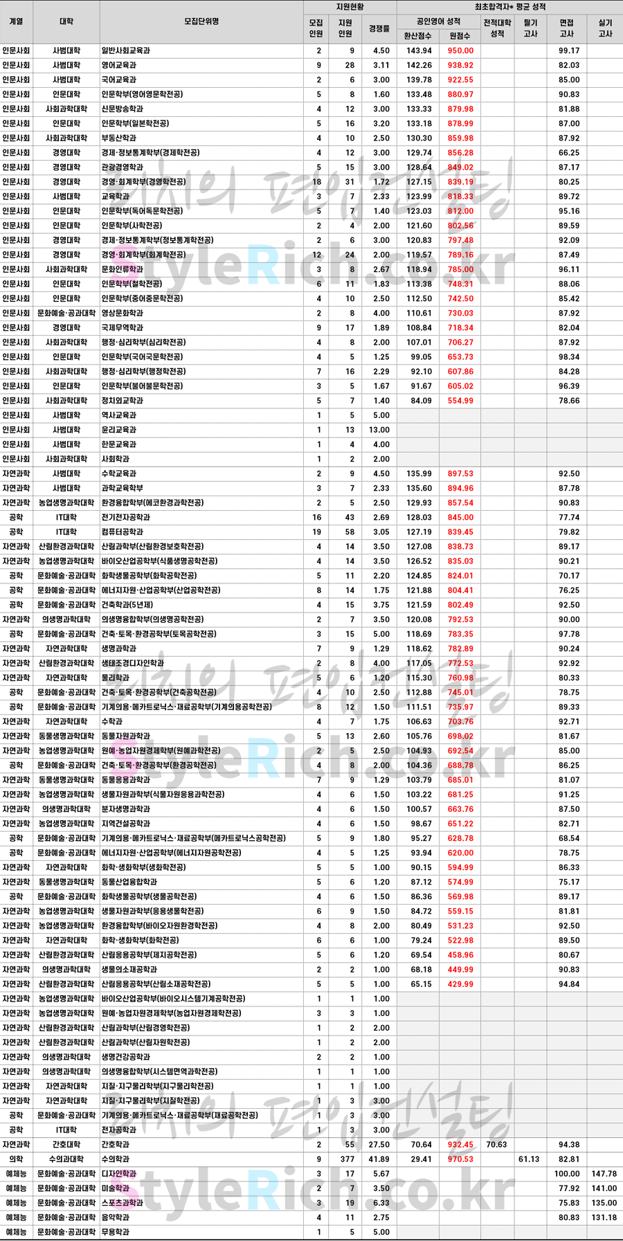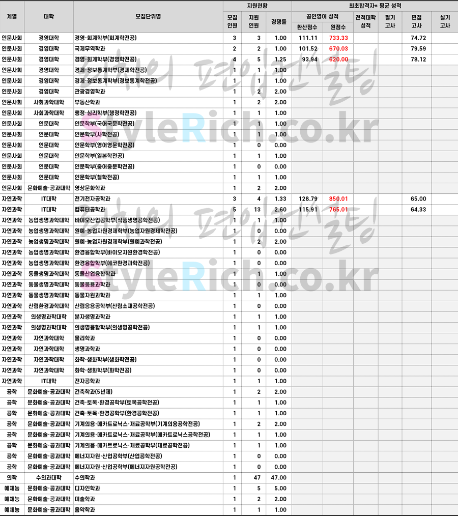 * 합격인원이 1명인 모집단위는 성적을 공개하지 않으며, 성적란를 연한 회색음영 처리함