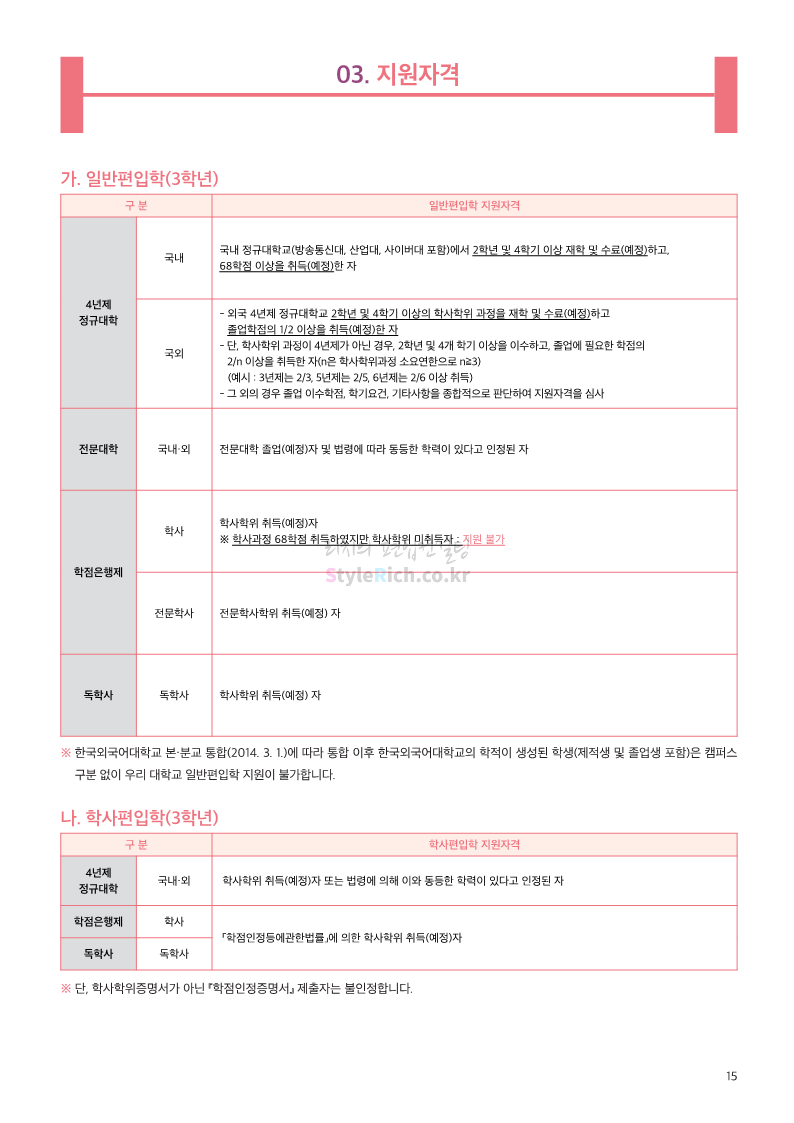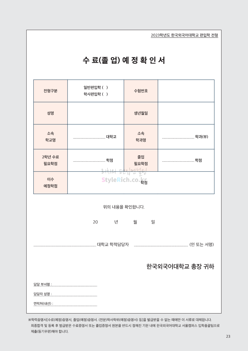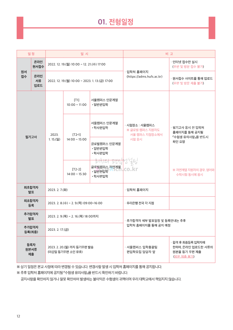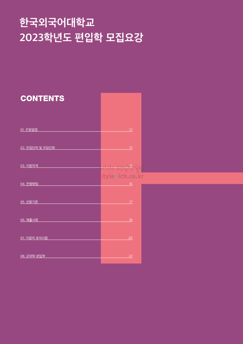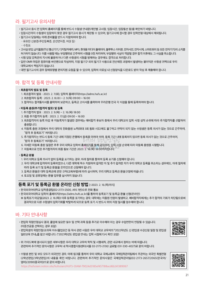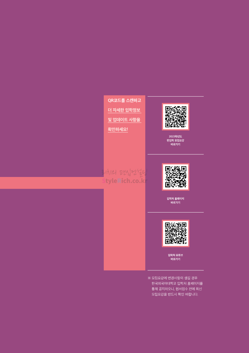 한국외대 편입 2023학년도 모집요강 간편하게 보자! 2022.12.12 23:56 편입 모집요강/2023학년도 모집요강 2023학년도 한국외대 편입 모집요강(2022.12.12 기준)을 간편하게 확인하세요. * 최종 모집요강 발표 이후에도 내용의 일부가 변경될 수 있으니 지원 전 반드시 한국외대 입학처에서 확인 바랍니다. 한국외대 편입 최신 모집요강 확인하기 <출처: 한국외대> 공유하기 게시글 관리 리치의 편입컨설팅 저작자표시 비영리 변경금지 (새창열림) '편입 모집요강 > 2023학년도 모집요강' 카테고리의 다른 글 서경대 편입 2023학년도 모집요강 간편하게 보자! (0) 2022.12.14 삼육대 편입 2023학년도 모집요강 간편하게 보자! (0) 2022.12.13 강원대(삼척/도계) 편입 2023학년도 모집요강 간편하게 보자! (0) 2022.12.11 강원대(춘천) 편입 2023학년도 모집요강 간편하게 보자! (0) 2022.12.11 서울여대 편입 2023학년도 모집요강 간편하게 보자! (0) 2022.12.10 댓글 공유하기 다른 글 댓글 이 글 공유하기 구독하기 구독하기 카카오톡 카카오톡 라인 라인 트위터 트위터 Facebook Facebook 카카오스토리 카카오스토리 밴드 밴드 네이버 블로그 네이버 블로그 Pocket Pocket Evernote Evernote 다른 글 서경대 편입 2023학년도 모집요강 간편하게 보자! 서경대 편입 2023학년도 모집요강 간편하게 보자! 2022.12.14 삼육대 편입 2023학년도 모집요강 간편하게 보자! 삼육대 편입 2023학년도 모집요강 간편하게 보자! 2022.12.13 강원대(삼척/도계) 편입 2023학년도 모집요강 간편하게 보자! 강원대(삼척/도계) 편입 2023학년도 모집요강 간편하게 보자! 2022.12.11 강원대(춘천) 편입 2023학년도 모집요강 간편하게 보자! 강원대(춘천) 편입 2023학년도 모집요강 간편하게 보자! 2022.12.11 다른 글 더 둘러보기