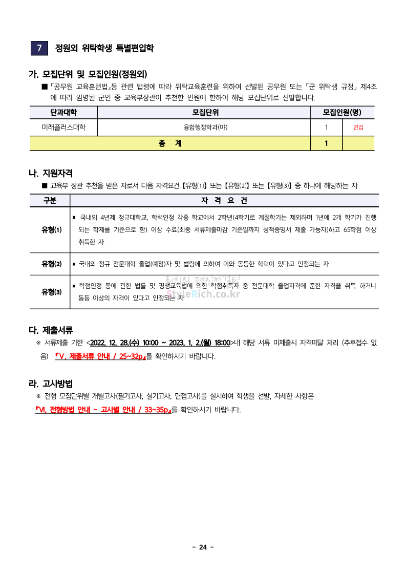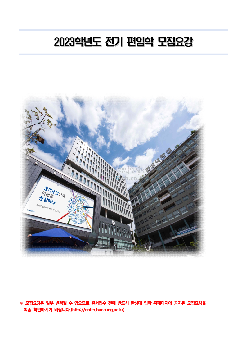 한성대 편입 2023학년도 모집요강 간편하게 보자! 2022.12.14 20:58 편입 모집요강/2023학년도 모집요강 2023학년도 한성대 편입 모집요강(2022.12.14 기준)을 간편하게 확인하세요. * 최종 모집요강 발표 이후에도 내용의 일부가 변경될 수 있으니 지원 전 반드시 한성대 입학처에서 확인 바랍니다. 한성대 편입 최신 모집요강 확인하기 <출처 한성대> 공유하기 게시글 관리 리치의 편입컨설팅 저작자표시 비영리 변경금지 (새창열림) '편입 모집요강 > 2023학년도 모집요강' 카테고리의 다른 글 전북대 편입 2023학년도 모집요강 간편하게 보자! (0) 2022.12.14 우석대 편입 2023학년도 모집요강 간편하게 보자! (0) 2022.12.14 고려대(세종) 편입 2023학년도 모집요강 간편하게 보자! (0) 2022.12.14 차의과학대 편입 2023학년도 모집요강 간편하게 보자! (0) 2022.12.14 조선대 편입 2023학년도 모집요강 간편하게 보자! (0) 2022.12.14 댓글 공유하기 다른 글 댓글 이 글 공유하기 구독하기 구독하기 카카오톡 카카오톡 라인 라인 트위터 트위터 Facebook Facebook 카카오스토리 카카오스토리 밴드 밴드 네이버 블로그 네이버 블로그 Pocket Pocket Evernote Evernote 다른 글 전북대 편입 2023학년도 모집요강 간편하게 보자! 전북대 편입 2023학년도 모집요강 간편하게 보자! 2022.12.14 우석대 편입 2023학년도 모집요강 간편하게 보자! 우석대 편입 2023학년도 모집요강 간편하게 보자! 2022.12.14 고려대(세종) 편입 2023학년도 모집요강 간편하게 보자! 고려대(세종) 편입 2023학년도 모집요강 간편하게 보자! 2022.12.14 차의과학대 편입 2023학년도 모집요강 간편하게 보자! 차의과학대 편입 2023학년도 모집요강 간편하게 보자! 2022.12.14 다른 글 더 둘러보기
