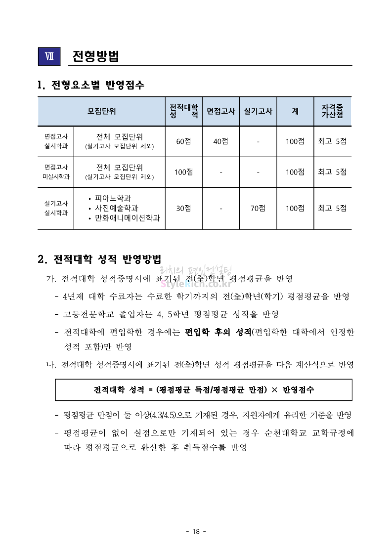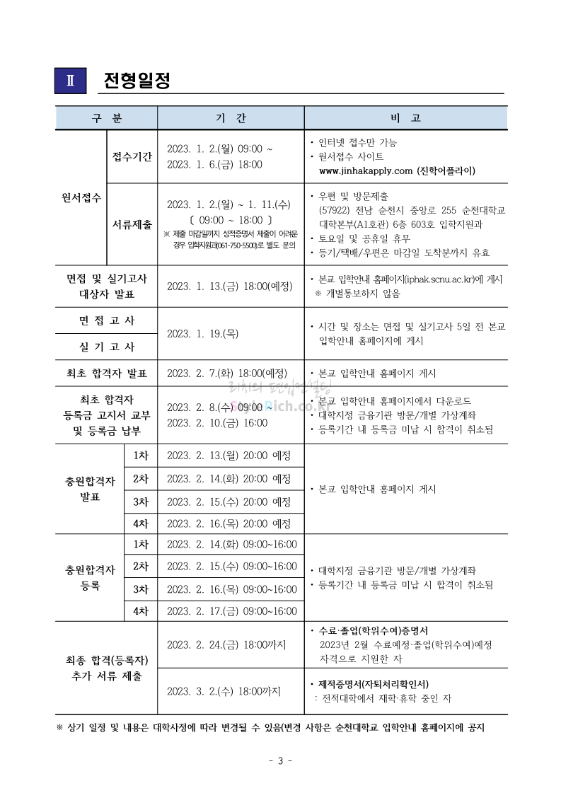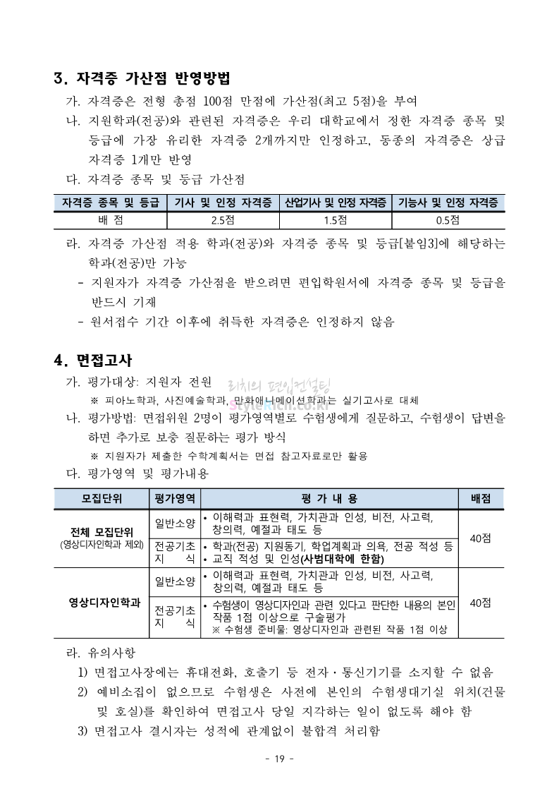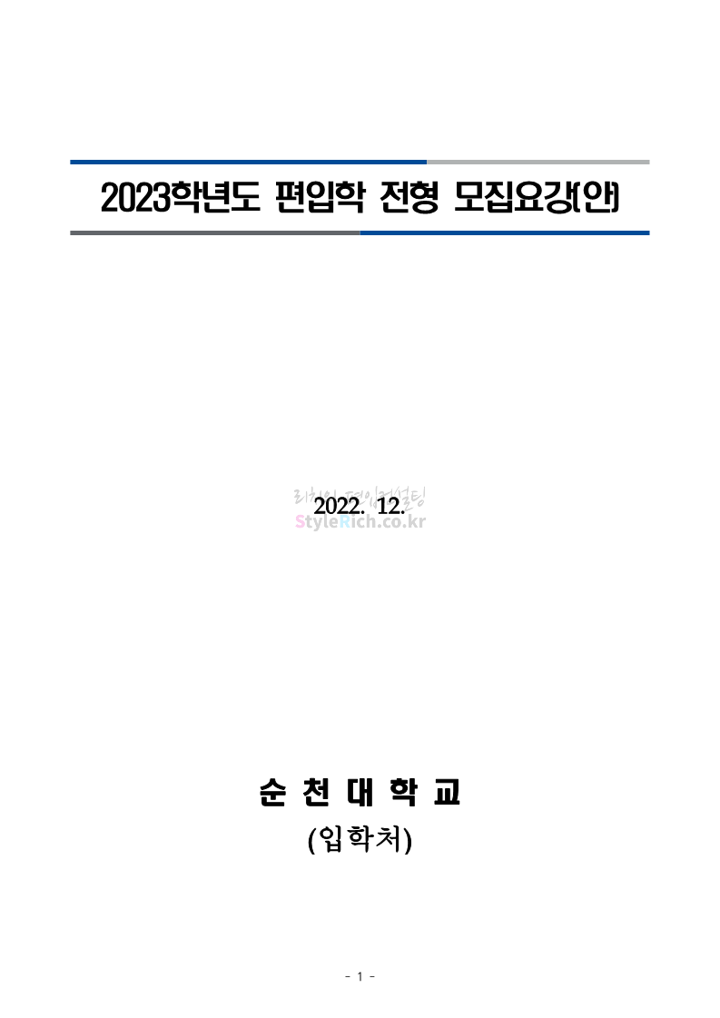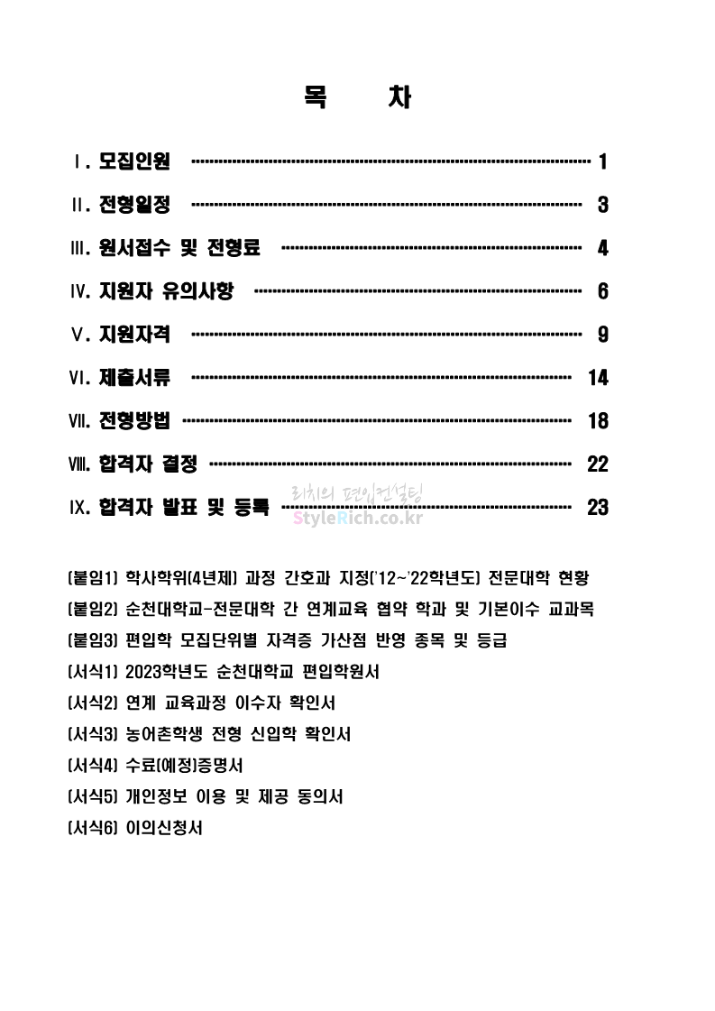 순천대 편입 2023학년도 모집요강 간편하게 보자! 2022.12.16 00:14 편입 모집요강/2023학년도 모집요강 2023학년도 순천대 편입 모집요강(2022.12.15 기준)을 간편하게 확인하세요. * 최종 모집요강 발표 이후에도 내용의 일부가 변경될 수 있으니 지원 전 반드시 순천대 입학처에서 확인하세요. 순천대 편입 최신 모집요강 확인하기 <출처: 순천대> 공유하기 게시글 관리 리치의 편입컨설팅 저작자표시 비영리 변경금지 (새창열림) '편입 모집요강 > 2023학년도 모집요강' 카테고리의 다른 글 인천대 편입 2023학년도 모집요강 간편하게 보자! (0) 2022.12.16 성신여대 편입 2023학년도 모집요강 간편하게 보자! (0) 2022.12.16 전북대 편입 2023학년도 모집요강 간편하게 보자! (0) 2022.12.14 우석대 편입 2023학년도 모집요강 간편하게 보자! (0) 2022.12.14 한성대 편입 2023학년도 모집요강 간편하게 보자! (0) 2022.12.14 댓글 공유하기 다른 글 댓글 이 글 공유하기 구독하기 구독하기 카카오톡 카카오톡 라인 라인 트위터 트위터 Facebook Facebook 카카오스토리 카카오스토리 밴드 밴드 네이버 블로그 네이버 블로그 Pocket Pocket Evernote Evernote 다른 글 인천대 편입 2023학년도 모집요강 간편하게 보자! 인천대 편입 2023학년도 모집요강 간편하게 보자! 2022.12.16 성신여대 편입 2023학년도 모집요강 간편하게 보자! 성신여대 편입 2023학년도 모집요강 간편하게 보자! 2022.12.16 전북대 편입 2023학년도 모집요강 간편하게 보자! 전북대 편입 2023학년도 모집요강 간편하게 보자! 2022.12.14 우석대 편입 2023학년도 모집요강 간편하게 보자! 우석대 편입 2023학년도 모집요강 간편하게 보자! 2022.12.14 다른 글 더 둘러보기