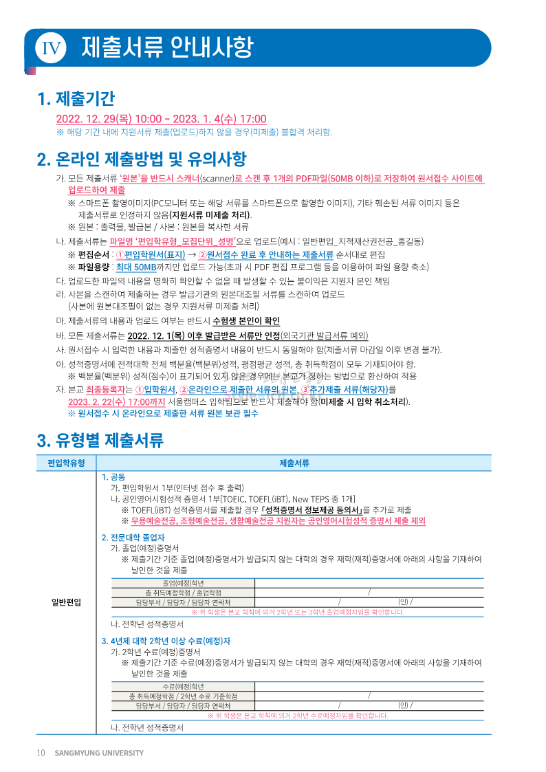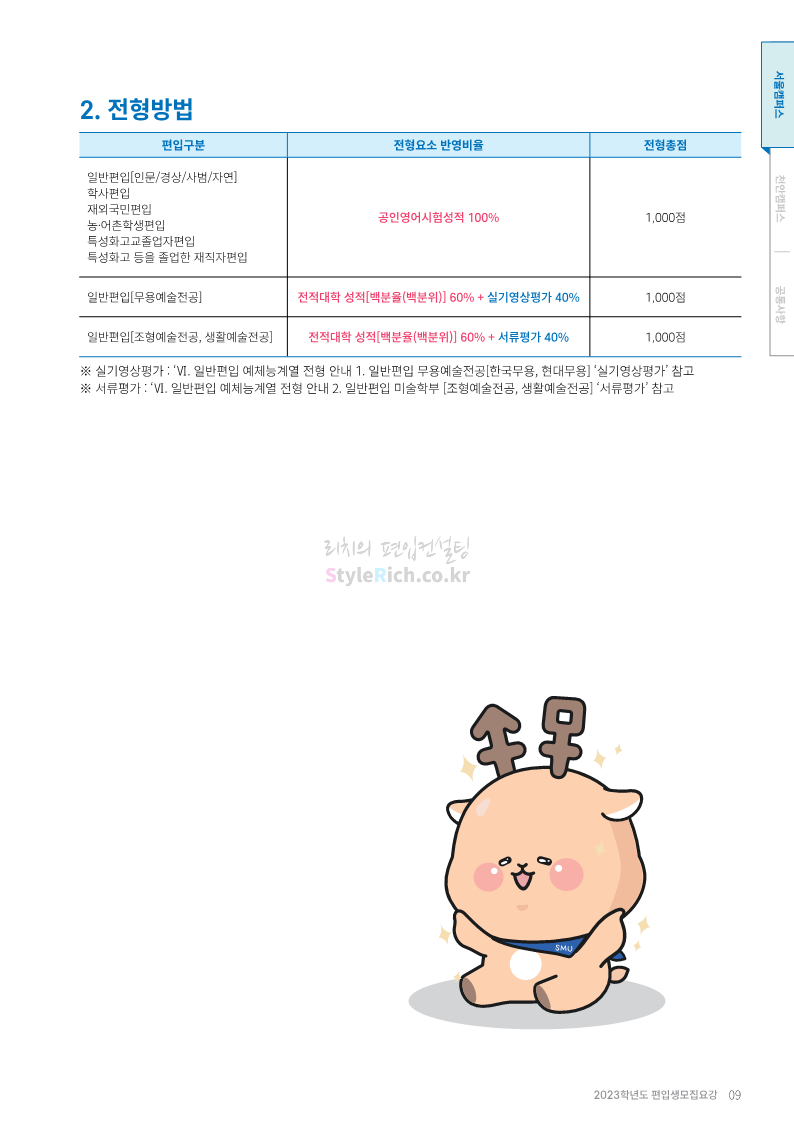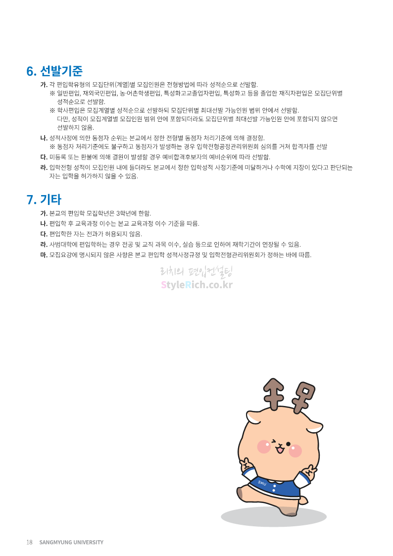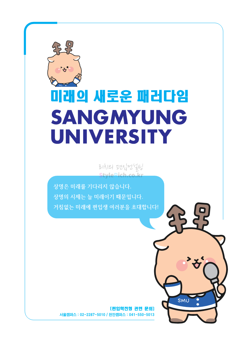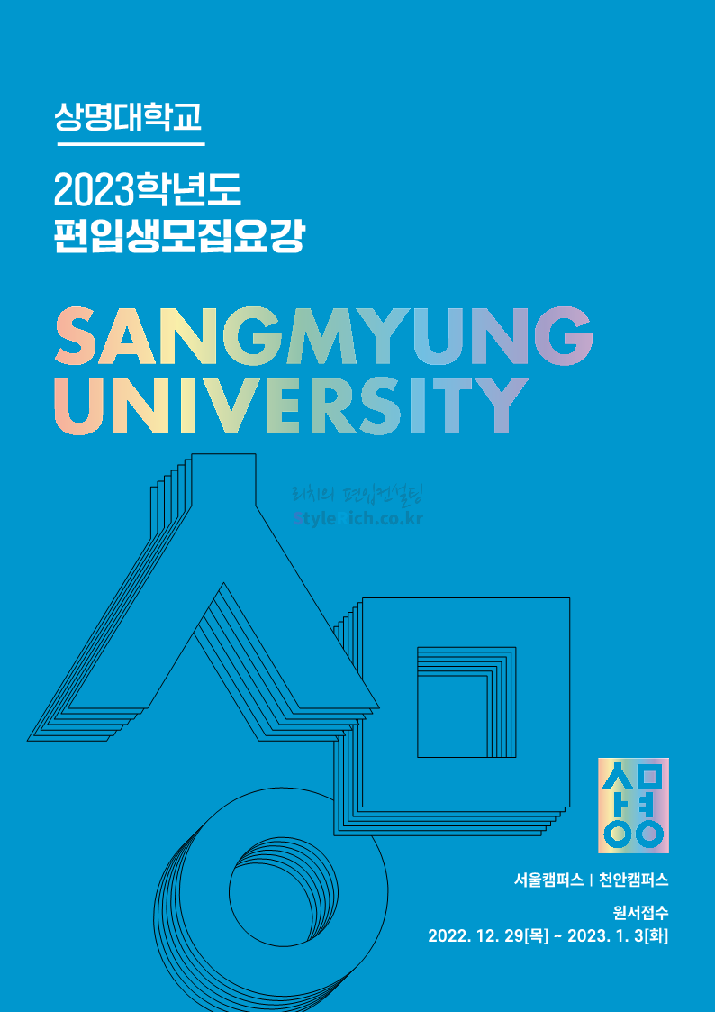 상명대 편입 2023학년도 모집요강 간편하게 보자! 2022.12.20 20:24 편입 모집요강/2023학년도 모집요강 2023학년도 상명대 편입 모집요강(2022.12.20 기준)을 간편하게 확인하세요. * 최종 모집요강 발표 이후에도 내용의 일부가 변경될 수 있으니 지원 전 반드시 상명대 편입 입학처에서 확인하세요. 상명대 편입 최신 모집요강 확인하기 <출처: 상명대> 공유하기 게시글 관리 리치의 편입컨설팅 저작자표시 비영리 변경금지 (새창열림) '편입 모집요강 > 2023학년도 모집요강' 카테고리의 다른 글 경성대 편입 2023학년도 모집요강 간편하게 보자! (0) 2022.12.20 한양대(에리카) 편입 2023학년도 모집요강 간편하게 보자! (0) 2022.12.20 상명대(천안) 편입 2023학년도 모집요강 간편하게 보자! (0) 2022.12.20 제주대 편입 2023학년도 모집요강 간편하게 보자! (0) 2022.12.16 인천대 편입 2023학년도 모집요강 간편하게 보자! (0) 2022.12.16 댓글 공유하기 다른 글 댓글 이 글 공유하기 구독하기 구독하기 카카오톡 카카오톡 라인 라인 트위터 트위터 Facebook Facebook 카카오스토리 카카오스토리 밴드 밴드 네이버 블로그 네이버 블로그 Pocket Pocket Evernote Evernote 다른 글 경성대 편입 2023학년도 모집요강 간편하게 보자! 경성대 편입 2023학년도 모집요강 간편하게 보자! 2022.12.20 한양대(에리카) 편입 2023학년도 모집요강 간편하게 보자! 한양대(에리카) 편입 2023학년도 모집요강 간편하게 보자! 2022.12.20 상명대(천안) 편입 2023학년도 모집요강 간편하게 보자! 상명대(천안) 편입 2023학년도 모집요강 간편하게 보자! 2022.12.20 제주대 편입 2023학년도 모집요강 간편하게 보자! 제주대 편입 2023학년도 모집요강 간편하게 보자! 2022.12.16 다른 글 더 둘러보기