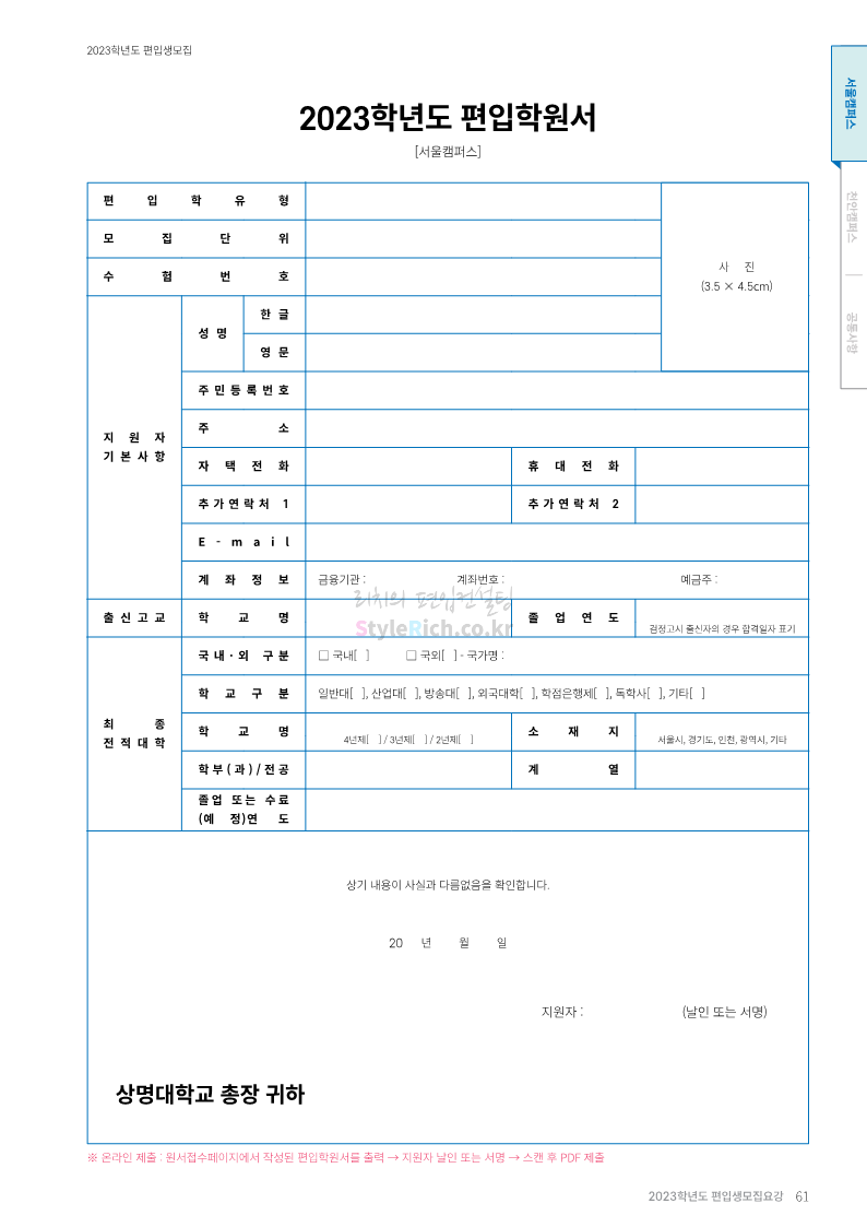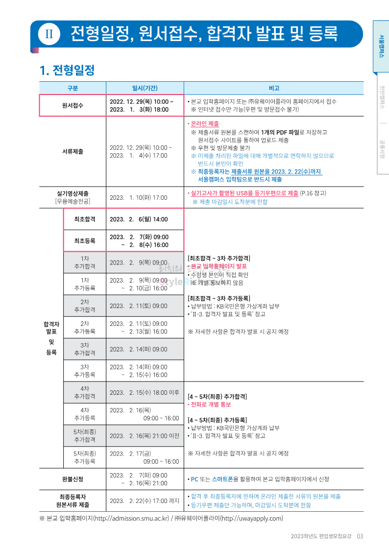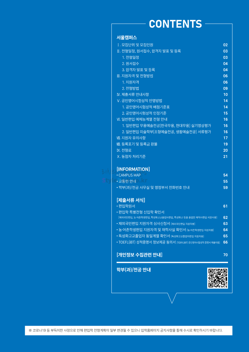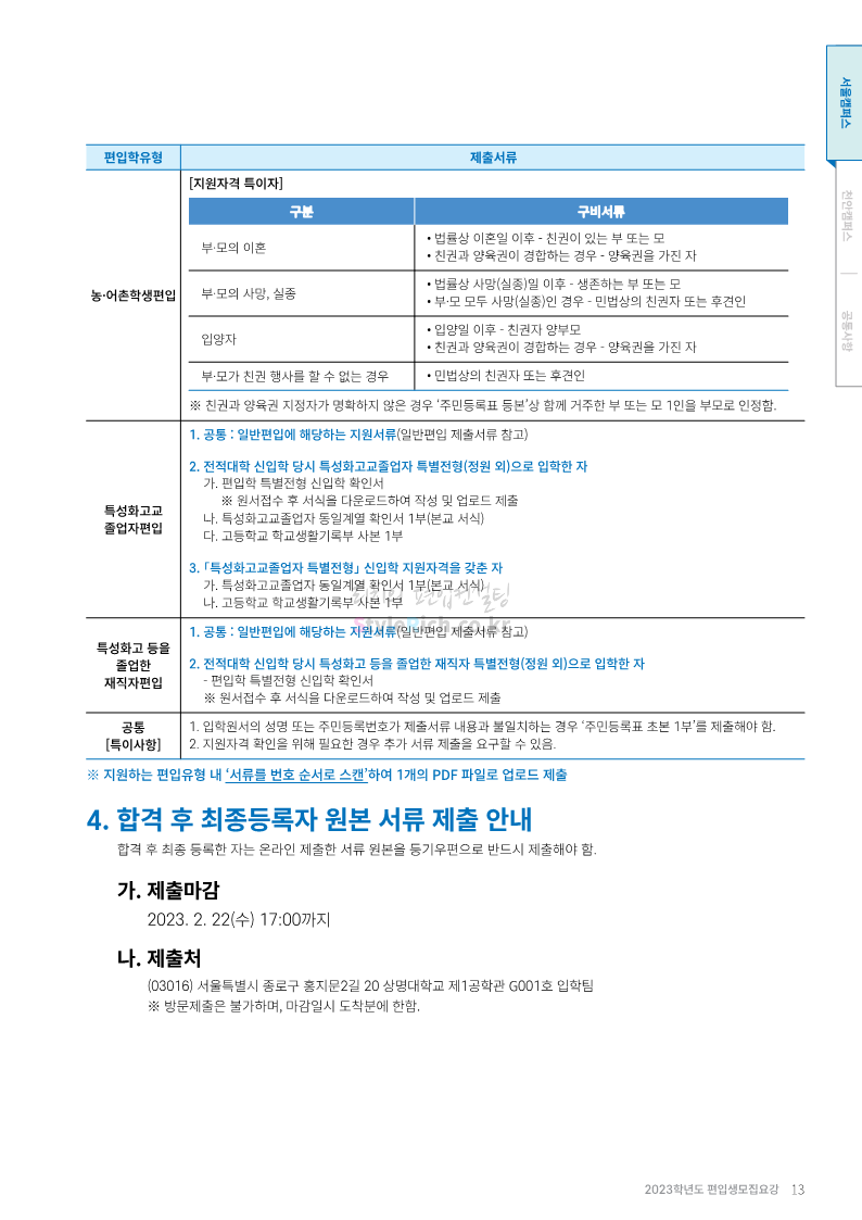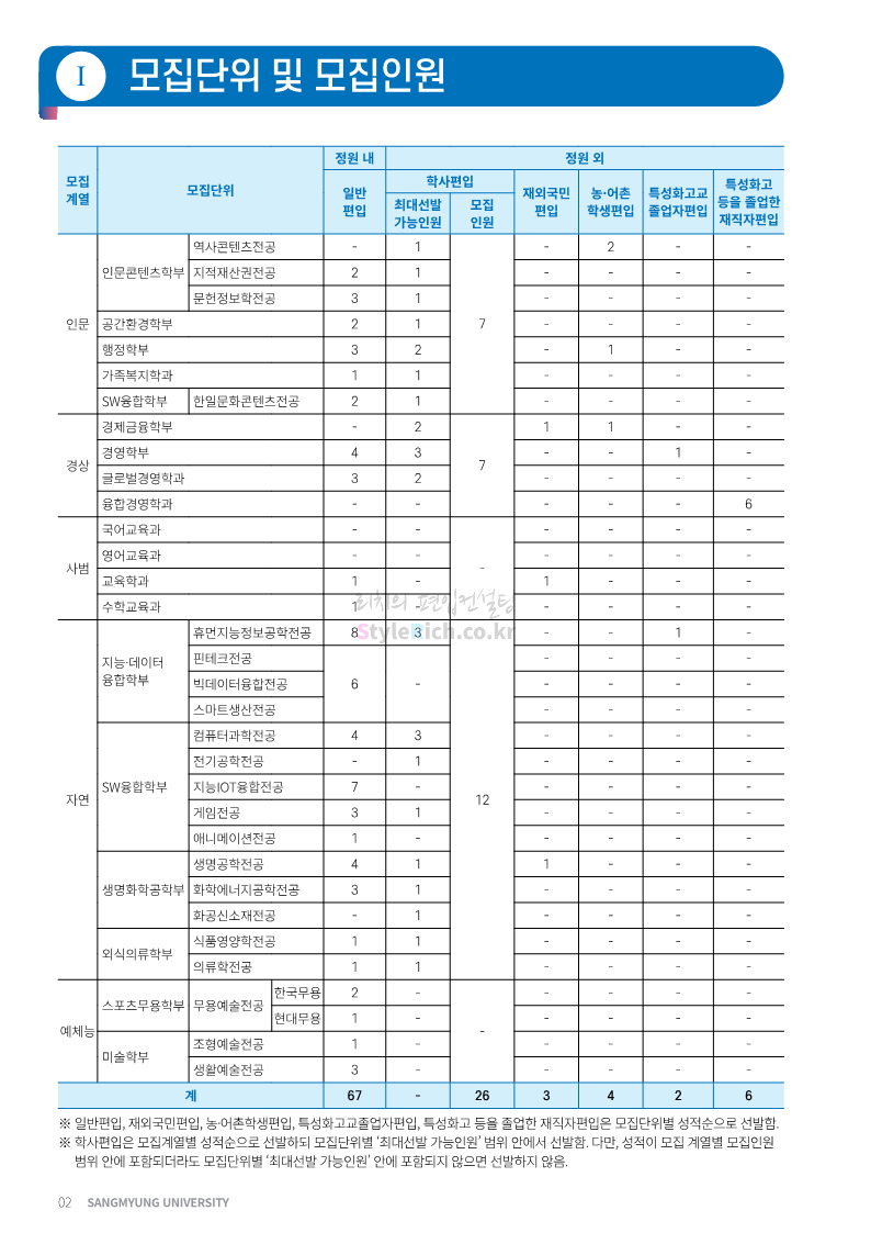 상명대 편입 2023학년도 모집요강 간편하게 보자! 2022.12.20 20:24 편입 모집요강/2023학년도 모집요강 2023학년도 상명대 편입 모집요강(2022.12.20 기준)을 간편하게 확인하세요. * 최종 모집요강 발표 이후에도 내용의 일부가 변경될 수 있으니 지원 전 반드시 상명대 편입 입학처에서 확인하세요. 상명대 편입 최신 모집요강 확인하기 <출처: 상명대> 공유하기 게시글 관리 리치의 편입컨설팅 저작자표시 비영리 변경금지 (새창열림) '편입 모집요강 > 2023학년도 모집요강' 카테고리의 다른 글 경성대 편입 2023학년도 모집요강 간편하게 보자! (0) 2022.12.20 한양대(에리카) 편입 2023학년도 모집요강 간편하게 보자! (0) 2022.12.20 상명대(천안) 편입 2023학년도 모집요강 간편하게 보자! (0) 2022.12.20 제주대 편입 2023학년도 모집요강 간편하게 보자! (0) 2022.12.16 인천대 편입 2023학년도 모집요강 간편하게 보자! (0) 2022.12.16 댓글 공유하기 다른 글 댓글 이 글 공유하기 구독하기 구독하기 카카오톡 카카오톡 라인 라인 트위터 트위터 Facebook Facebook 카카오스토리 카카오스토리 밴드 밴드 네이버 블로그 네이버 블로그 Pocket Pocket Evernote Evernote 다른 글 경성대 편입 2023학년도 모집요강 간편하게 보자! 경성대 편입 2023학년도 모집요강 간편하게 보자! 2022.12.20 한양대(에리카) 편입 2023학년도 모집요강 간편하게 보자! 한양대(에리카) 편입 2023학년도 모집요강 간편하게 보자! 2022.12.20 상명대(천안) 편입 2023학년도 모집요강 간편하게 보자! 상명대(천안) 편입 2023학년도 모집요강 간편하게 보자! 2022.12.20 제주대 편입 2023학년도 모집요강 간편하게 보자! 제주대 편입 2023학년도 모집요강 간편하게 보자! 2022.12.16 다른 글 더 둘러보기