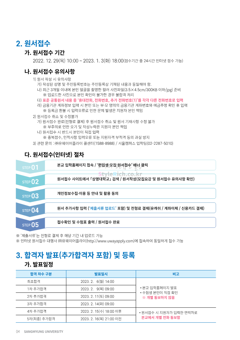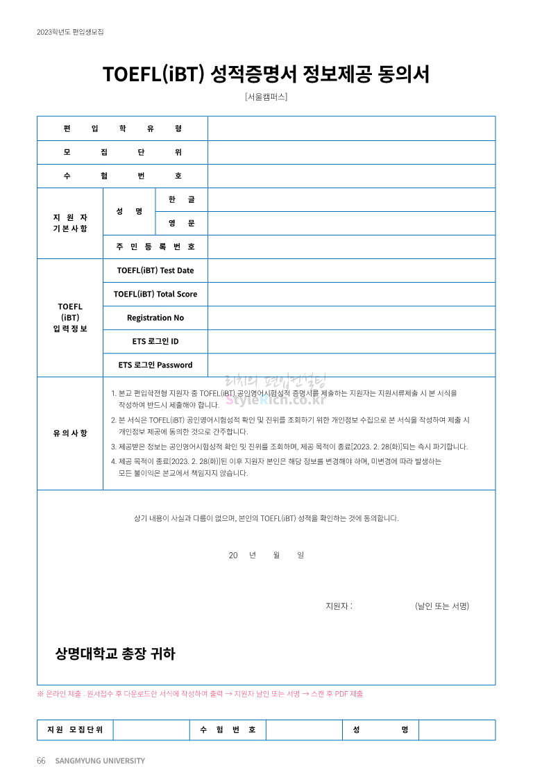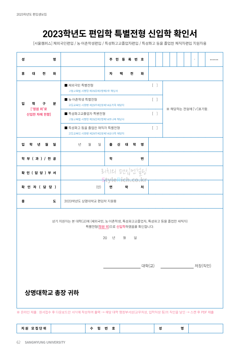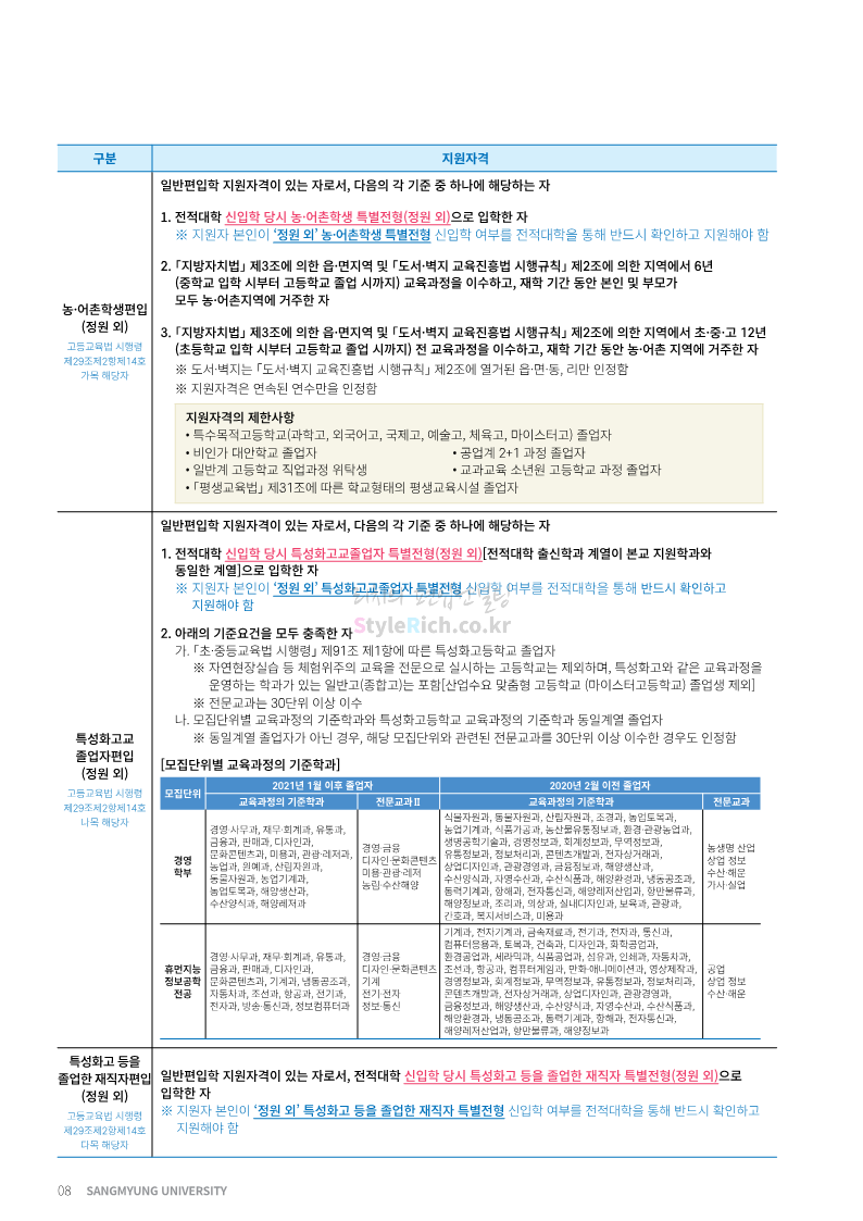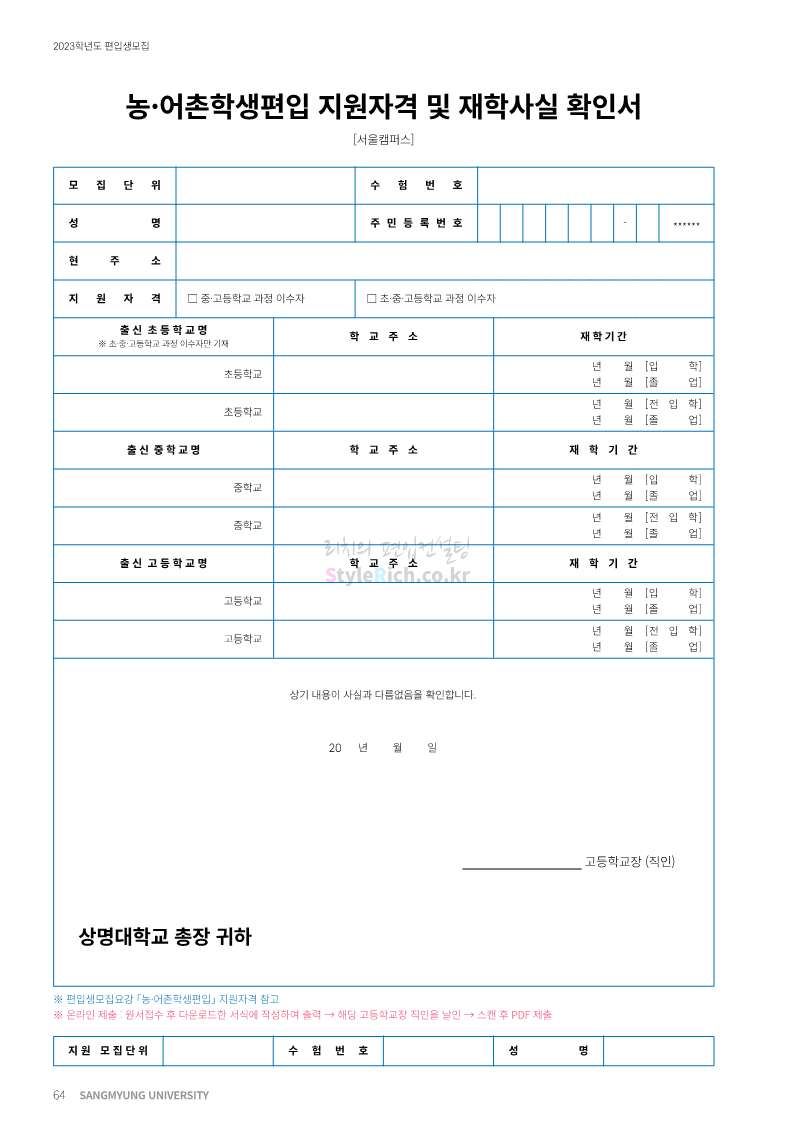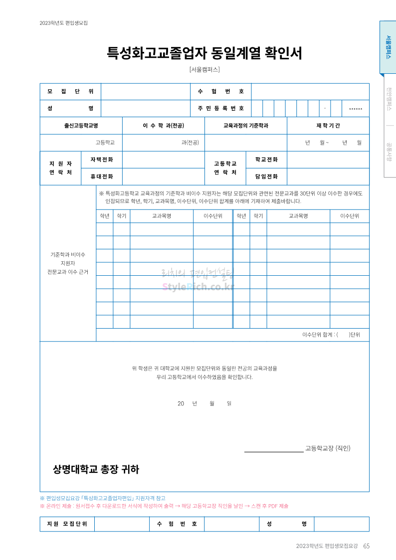 상명대 편입 2023학년도 모집요강 간편하게 보자! 2022.12.20 20:24 편입 모집요강/2023학년도 모집요강 2023학년도 상명대 편입 모집요강(2022.12.20 기준)을 간편하게 확인하세요. * 최종 모집요강 발표 이후에도 내용의 일부가 변경될 수 있으니 지원 전 반드시 상명대 편입 입학처에서 확인하세요. 상명대 편입 최신 모집요강 확인하기 <출처: 상명대> 공유하기 게시글 관리 리치의 편입컨설팅 저작자표시 비영리 변경금지 (새창열림) '편입 모집요강 > 2023학년도 모집요강' 카테고리의 다른 글 경성대 편입 2023학년도 모집요강 간편하게 보자! (0) 2022.12.20 한양대(에리카) 편입 2023학년도 모집요강 간편하게 보자! (0) 2022.12.20 상명대(천안) 편입 2023학년도 모집요강 간편하게 보자! (0) 2022.12.20 제주대 편입 2023학년도 모집요강 간편하게 보자! (0) 2022.12.16 인천대 편입 2023학년도 모집요강 간편하게 보자! (0) 2022.12.16 댓글 공유하기 다른 글 댓글 이 글 공유하기 구독하기 구독하기 카카오톡 카카오톡 라인 라인 트위터 트위터 Facebook Facebook 카카오스토리 카카오스토리 밴드 밴드 네이버 블로그 네이버 블로그 Pocket Pocket Evernote Evernote 다른 글 경성대 편입 2023학년도 모집요강 간편하게 보자! 경성대 편입 2023학년도 모집요강 간편하게 보자! 2022.12.20 한양대(에리카) 편입 2023학년도 모집요강 간편하게 보자! 한양대(에리카) 편입 2023학년도 모집요강 간편하게 보자! 2022.12.20 상명대(천안) 편입 2023학년도 모집요강 간편하게 보자! 상명대(천안) 편입 2023학년도 모집요강 간편하게 보자! 2022.12.20 제주대 편입 2023학년도 모집요강 간편하게 보자! 제주대 편입 2023학년도 모집요강 간편하게 보자! 2022.12.16 다른 글 더 둘러보기