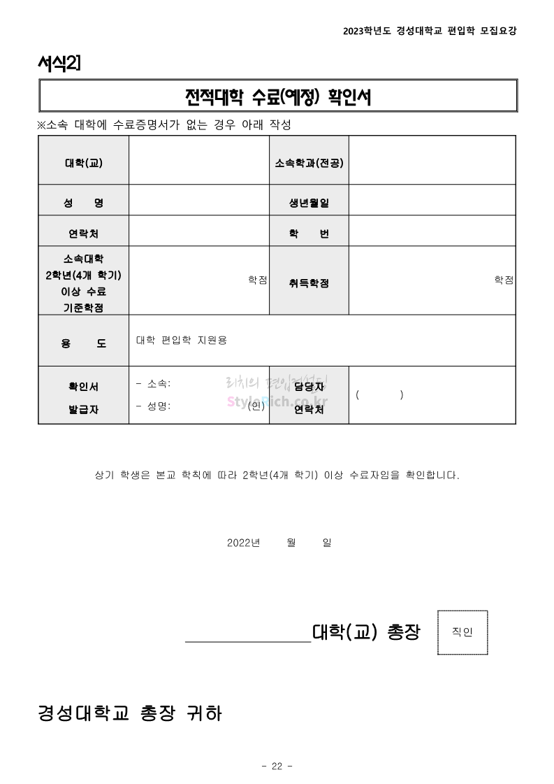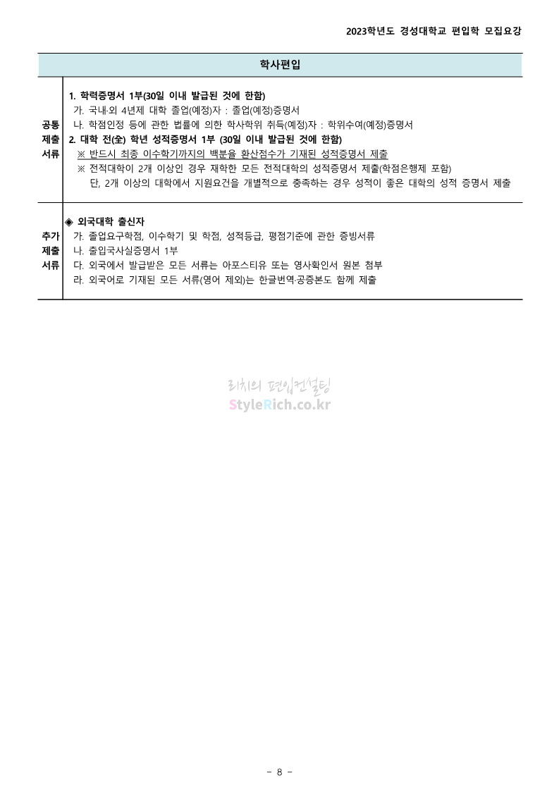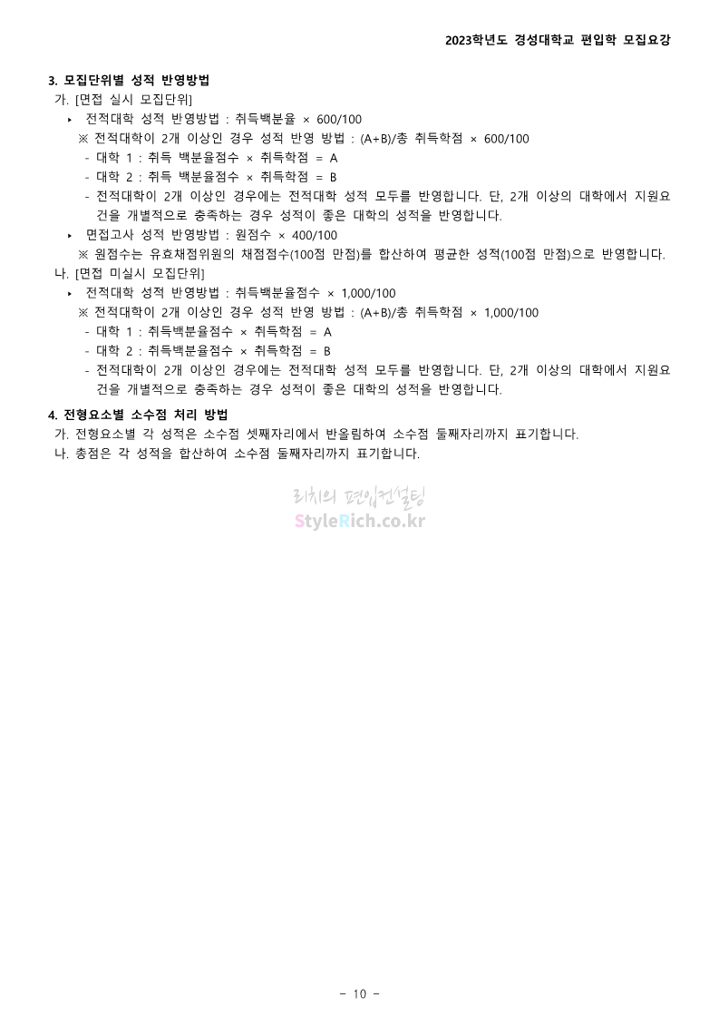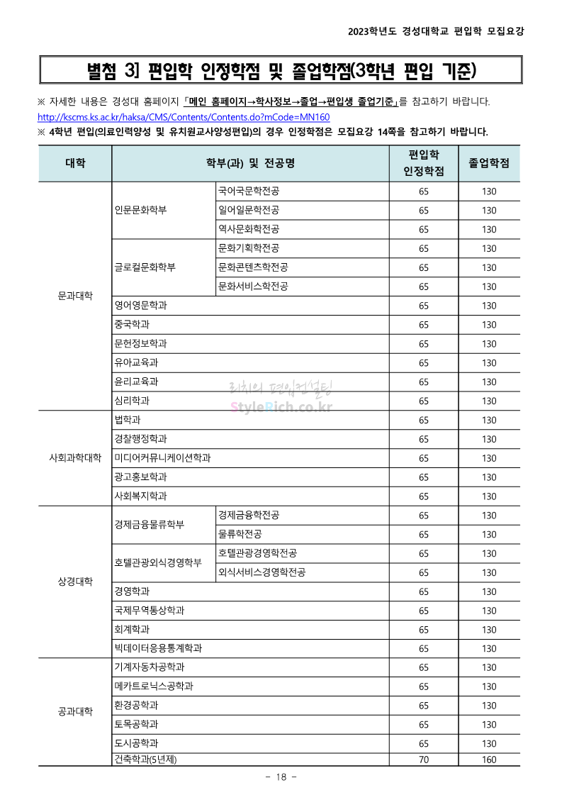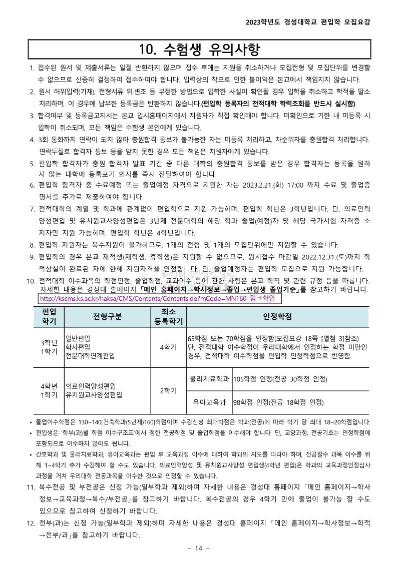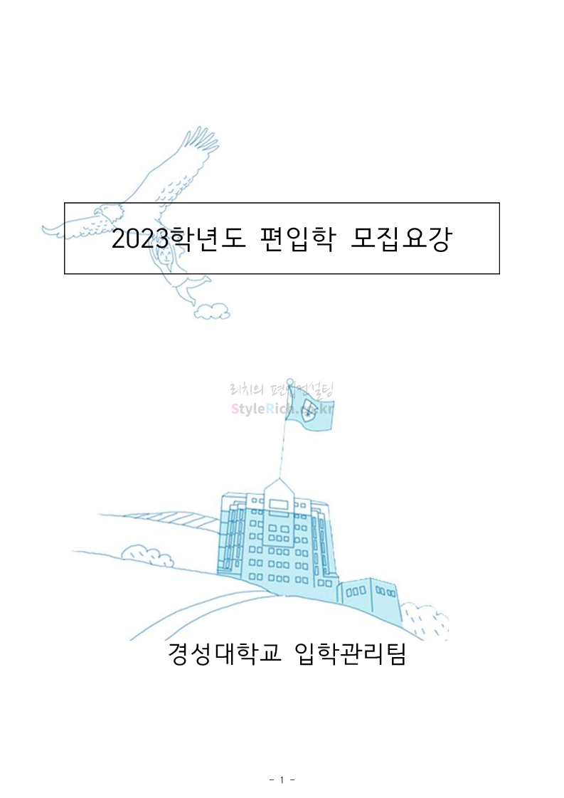 경성대 편입 2023학년도 모집요강 간편하게 보자! 2022.12.20 21:17 편입 모집요강/2023학년도 모집요강 2023학년도 경성대 편입 모집요강(2022.12.20 기준)을 간편하게 확인하세요. * 최종 모집요강 발표 이후에도 내용의 일부가 변경될 수 있으니 지원 전 반드시 경성대 입학처에서 확인하세요. 경성대 편입 최신 모집요강 확인하기 <출처: 경성대> 공유하기 게시글 관리 리치의 편입컨설팅 저작자표시 비영리 변경금지 (새창열림) '편입 모집요강 > 2023학년도 모집요강' 카테고리의 다른 글 덕성여대 편입 2023학년도 모집요강 간편하게 보자! (0) 2022.12.21 경상국립대 편입 2023학년도 모집요강 간편하게 보자! (0) 2022.12.20 한양대(에리카) 편입 2023학년도 모집요강 간편하게 보자! (0) 2022.12.20 상명대 편입 2023학년도 모집요강 간편하게 보자! (0) 2022.12.20 상명대(천안) 편입 2023학년도 모집요강 간편하게 보자! (0) 2022.12.20 댓글 공유하기 다른 글 댓글 이 글 공유하기 구독하기 구독하기 카카오톡 카카오톡 라인 라인 트위터 트위터 Facebook Facebook 카카오스토리 카카오스토리 밴드 밴드 네이버 블로그 네이버 블로그 Pocket Pocket Evernote Evernote 다른 글 덕성여대 편입 2023학년도 모집요강 간편하게 보자! 덕성여대 편입 2023학년도 모집요강 간편하게 보자! 2022.12.21 경상국립대 편입 2023학년도 모집요강 간편하게 보자! 경상국립대 편입 2023학년도 모집요강 간편하게 보자! 2022.12.20 한양대(에리카) 편입 2023학년도 모집요강 간편하게 보자! 한양대(에리카) 편입 2023학년도 모집요강 간편하게 보자! 2022.12.20 상명대 편입 2023학년도 모집요강 간편하게 보자! 상명대 편입 2023학년도 모집요강 간편하게 보자! 2022.12.20 다른 글 더 둘러보기