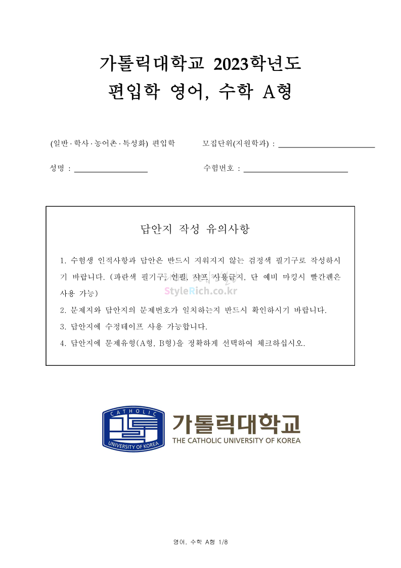 2023학년도 가톨릭대 편입 기출문제 영어&수학 A형 표지