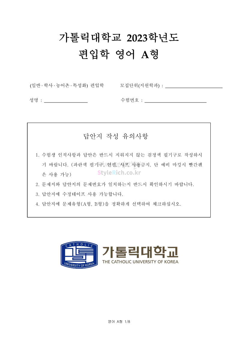 2023학년도 가톨릭대 편입 기출문제 영어 A형 표지