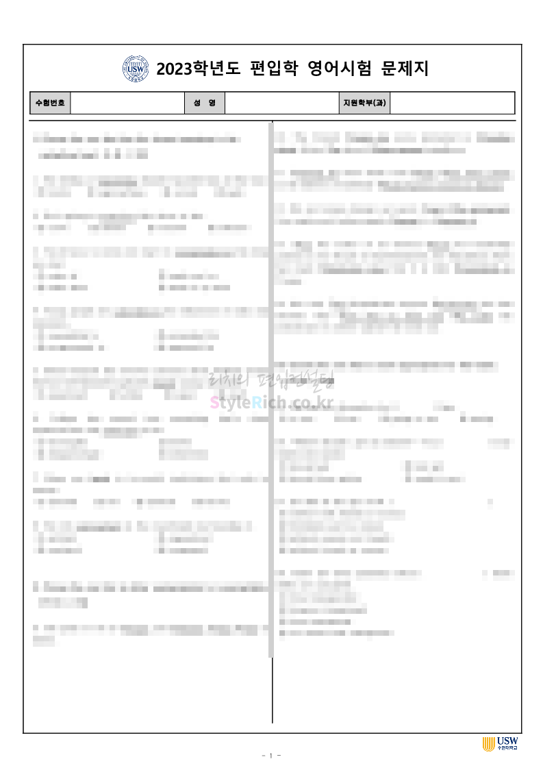 수원대 편입 2023학년도 기출문제가 궁금하다면? 2023.09.17 22:38 편입 기출문제/2023학년도 기출문제 2023학년도 수원대 편입 기출문제를 살펴보겠습니다. 2023학년도 수원대 편입 영어 기출문제는 40문항/60분, 객관식 4지선다형, 총점 100점 만점에 배점은 1~14번 2.1점, 15~26번 2.5점, 27~40번 2.9점으로 후반부로 갈수록 문항당 배점이 높습니다. 2023학년도-수원대-편입-기출문제-영어 2023학년도 수원대 편입 기출문제 다운받기 2023학년도 수원대 편입 기출문제 영어.pdf 0.34MB <출처: 수원대> 공유하기 게시글 관리 리치의 편입컨설팅 저작자표시 비영리 변경금지 (새창열림) '편입 기출문제 > 2023학년도 기출문제' 카테고리의 다른 글 숭실대 편입 2023학년도 기출문제가 궁금하다면? (0) 2023.09.18 숙명여대 편입 2023학년도 기출문제가 궁금하다면? (0) 2023.09.17 세종대 편입 2023학년도 기출문제가 궁금하다면? (0) 2023.09.17 서울여대 편입 2023학년도 기출문제가 궁금하다면? (0) 2023.09.17 서울시립대 편입 2023학년도 기출문제가 궁금하다면? (0) 2023.09.17 댓글 공유하기 다른 글 댓글 이 글 공유하기 구독하기 구독하기 카카오톡 카카오톡 라인 라인 트위터 트위터 Facebook Facebook 카카오스토리 카카오스토리 밴드 밴드 네이버 블로그 네이버 블로그 Pocket Pocket Evernote Evernote 다른 글 숭실대 편입 2023학년도 기출문제가 궁금하다면? 숭실대 편입 2023학년도 기출문제가 궁금하다면? 2023.09.18 숙명여대 편입 2023학년도 기출문제가 궁금하다면? 숙명여대 편입 2023학년도 기출문제가 궁금하다면? 2023.09.17 세종대 편입 2023학년도 기출문제가 궁금하다면? 세종대 편입 2023학년도 기출문제가 궁금하다면? 2023.09.17 서울여대 편입 2023학년도 기출문제가 궁금하다면? 서울여대 편입 2023학년도 기출문제가 궁금하다면? 2023.09.17 다른 글 더 둘러보기
